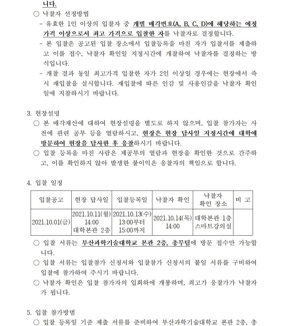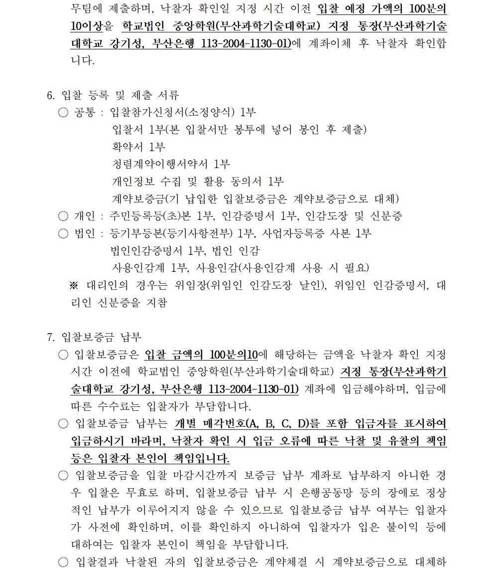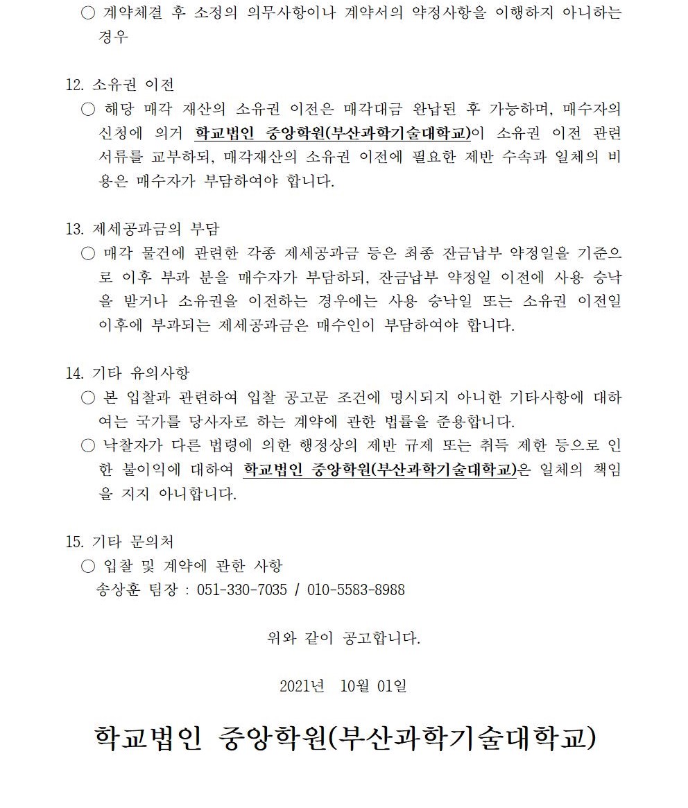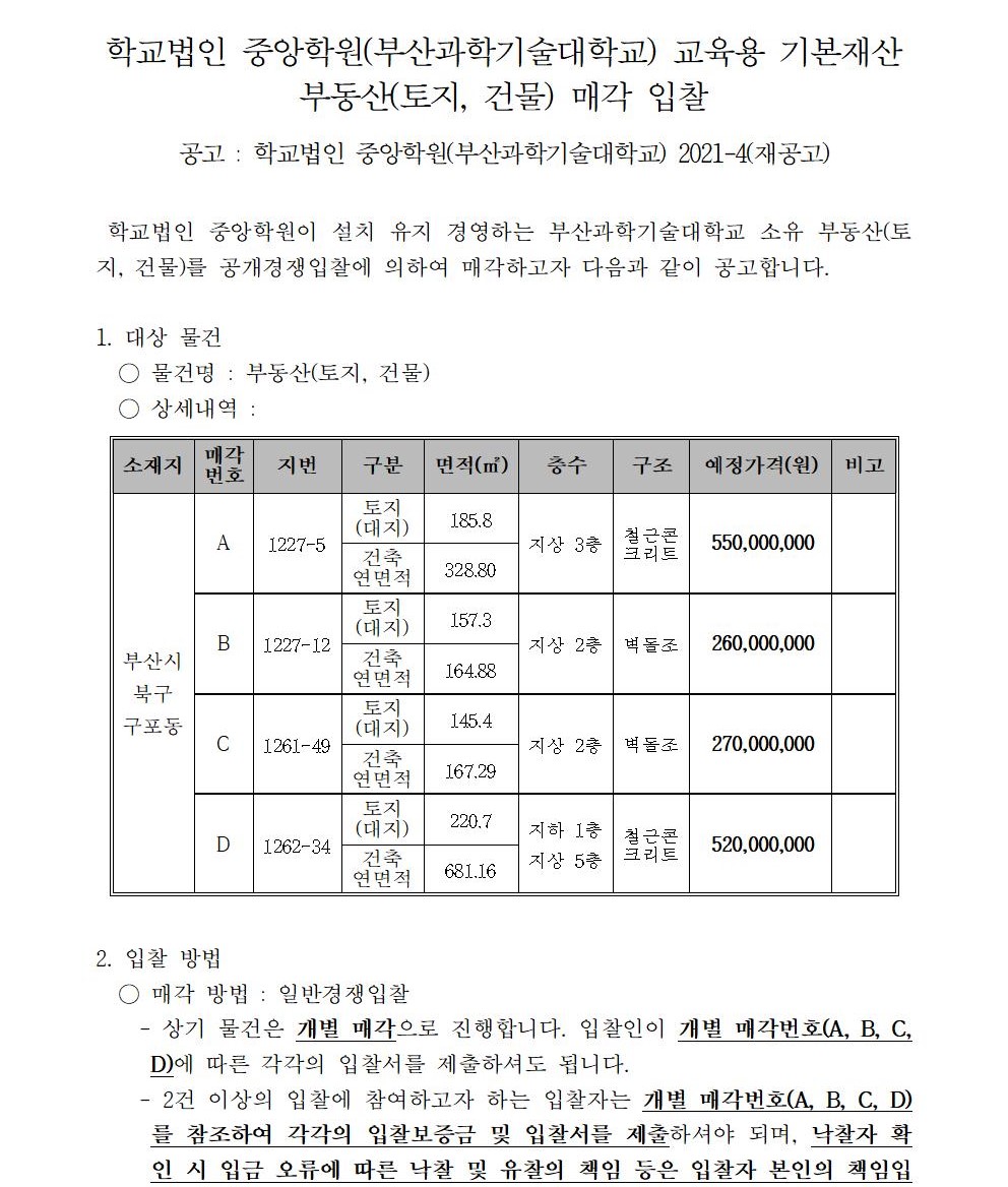 HOME > 기타 > 입찰/채용 입찰/채용 제목 [입찰] 학교법인 중앙학원(부산과학기술대학교) 교육용기본재산 부동산(토지, 건물) 매각 입찰 재공고 등록일 2021.10.01 08:10:00 작성자 행정지원처 첨부파일 붙임9. 입찰참가 서류 양식.zip [829.25 KB] 조회 2034 이전글 [입찰] 학교법인 중앙학원(부산과학기술대학교) 교육용기본재산 부동산(토지, 건물) 매각 입찰 공고 다음글 [채용] 2021학년도 2학기 비전임 교원(초빙교원) 초빙 공고 목록 비밀글 비밀번호 입력 폼 비밀번호 입력 비밀번호를 입력하여 주세요. 관리자는 확인버튼만 누르시면 됩니다. 비밀번호 잘못된 비밀번호입니다. 비밀번호를 다시 입력해주세요. 확인