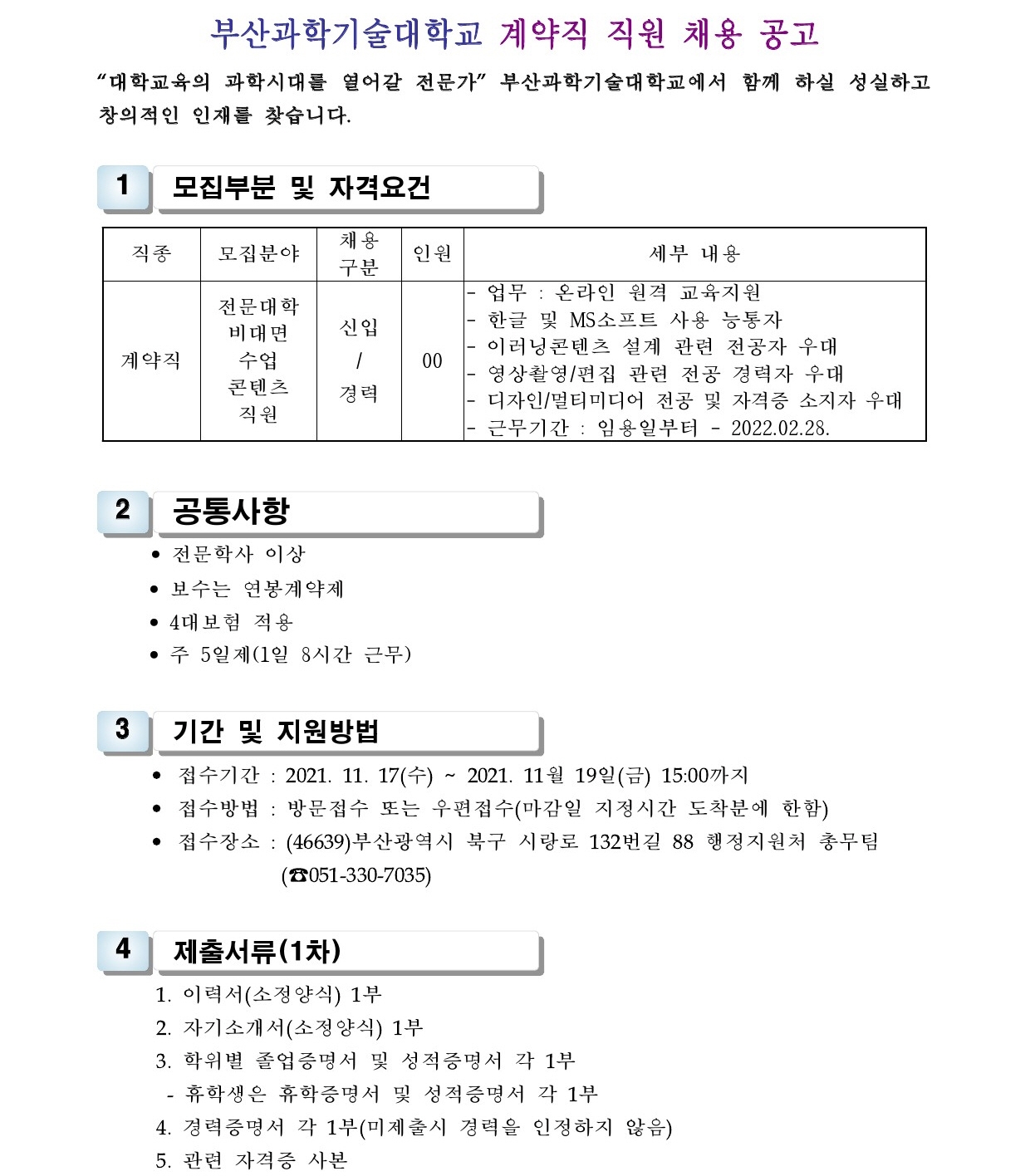 HOME > 기타 > 입찰/채용 입찰/채용 제목 [채용] 대학 전문대학 비대면 수업 콘텐츠 계약직 직원 채용 공고 등록일 2021.11.09 08:32:17 작성자 행정지원처 첨부파일 1-2. 공고문(온라인도우미).pdf [182.65 KB]1-3. 지원서 및 자기소개서(계약직).hwp [21.50 KB] 조회 2681 이전글 [입찰] 학교법인 중앙학원 수익용 기본재산 부동산(토지) 매각 입찰 공고 다음글 [채용] 산학협력단 대학혁신지원사업 계약직 직원 채용 공고 목록 비밀글 비밀번호 입력 폼 비밀번호 입력 비밀번호를 입력하여 주세요. 관리자는 확인버튼만 누르시면 됩니다. 비밀번호 잘못된 비밀번호입니다. 비밀번호를 다시 입력해주세요. 확인