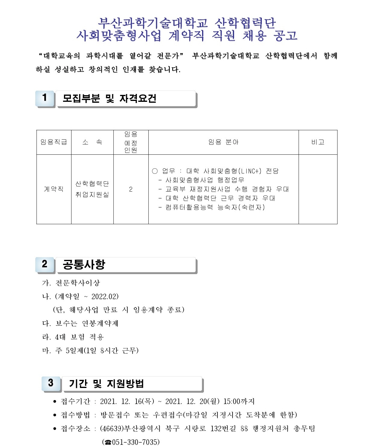 HOME > 기타 > 입찰/채용 입찰/채용 제목 [채용] 산학협력단 사회맞춤형사업(LINC+) 계약직 직원 채용 공고 등록일 2021.12.09 08:53:38 작성자 행정지원처 첨부파일 1-3. 지원서 및 자기소개서(계약직).hwp [21.50 KB]1-2. 공고문(계약직).pdf [184.02 KB] 조회 2032 이전글 [입찰] 사회맞춤형 / 대학혁신 실습실 환경개선공사 입찰(긴급) 다음글 [채용] 산학협력단 대학혁신지원사업 계약직 직원 채용 공고 목록 비밀글 비밀번호 입력 폼 비밀번호 입력 비밀번호를 입력하여 주세요. 관리자는 확인버튼만 누르시면 됩니다. 비밀번호 잘못된 비밀번호입니다. 비밀번호를 다시 입력해주세요. 확인