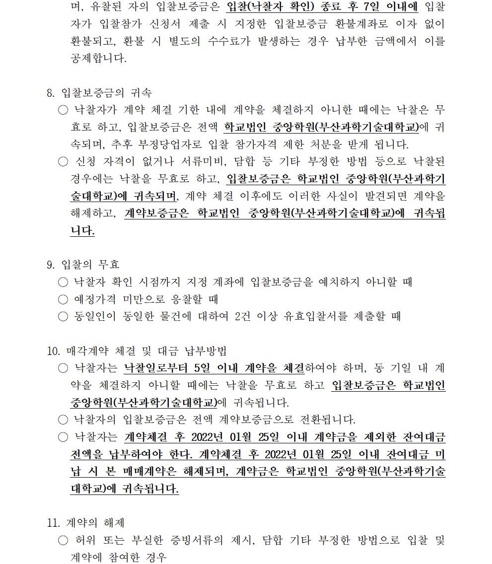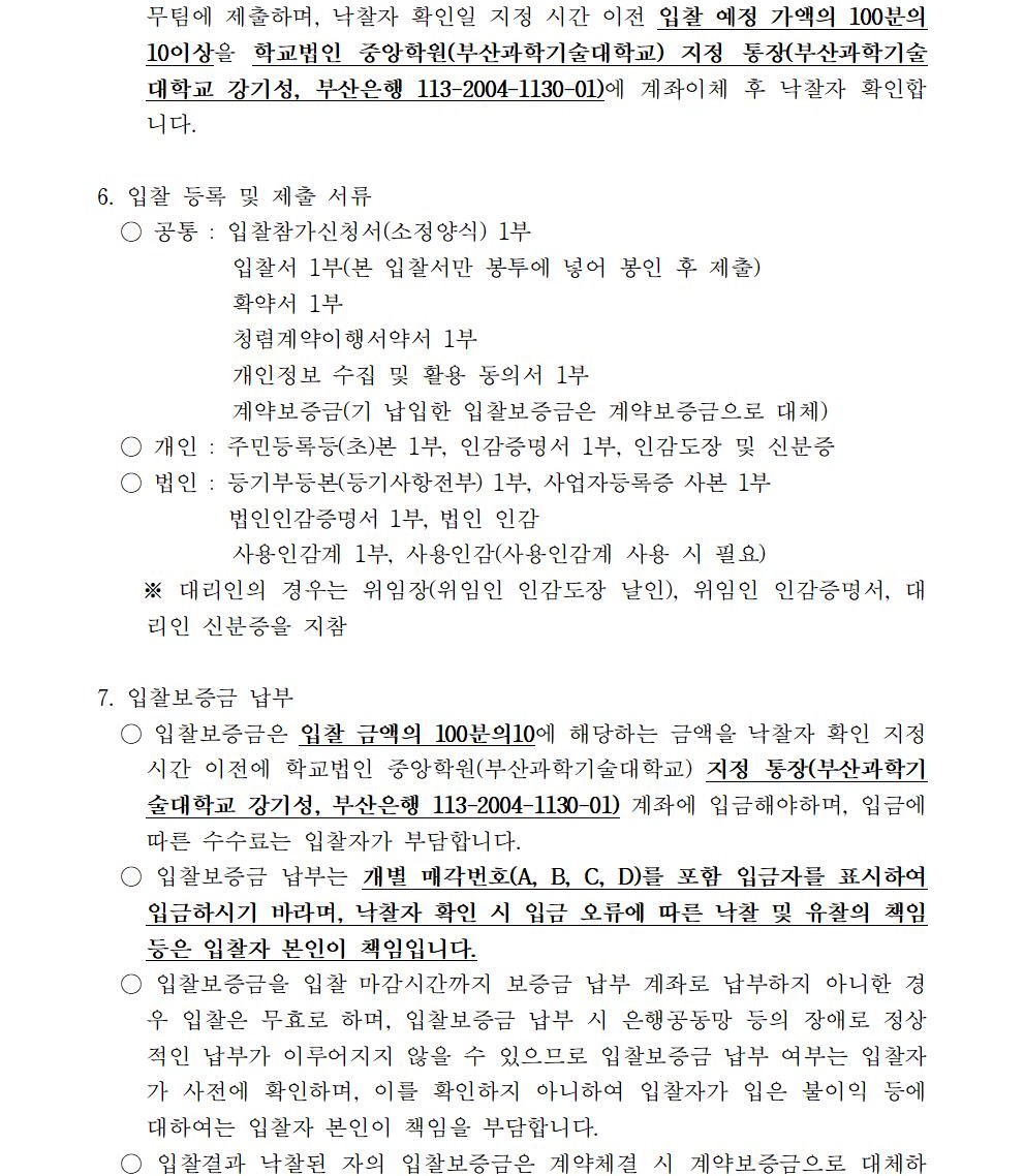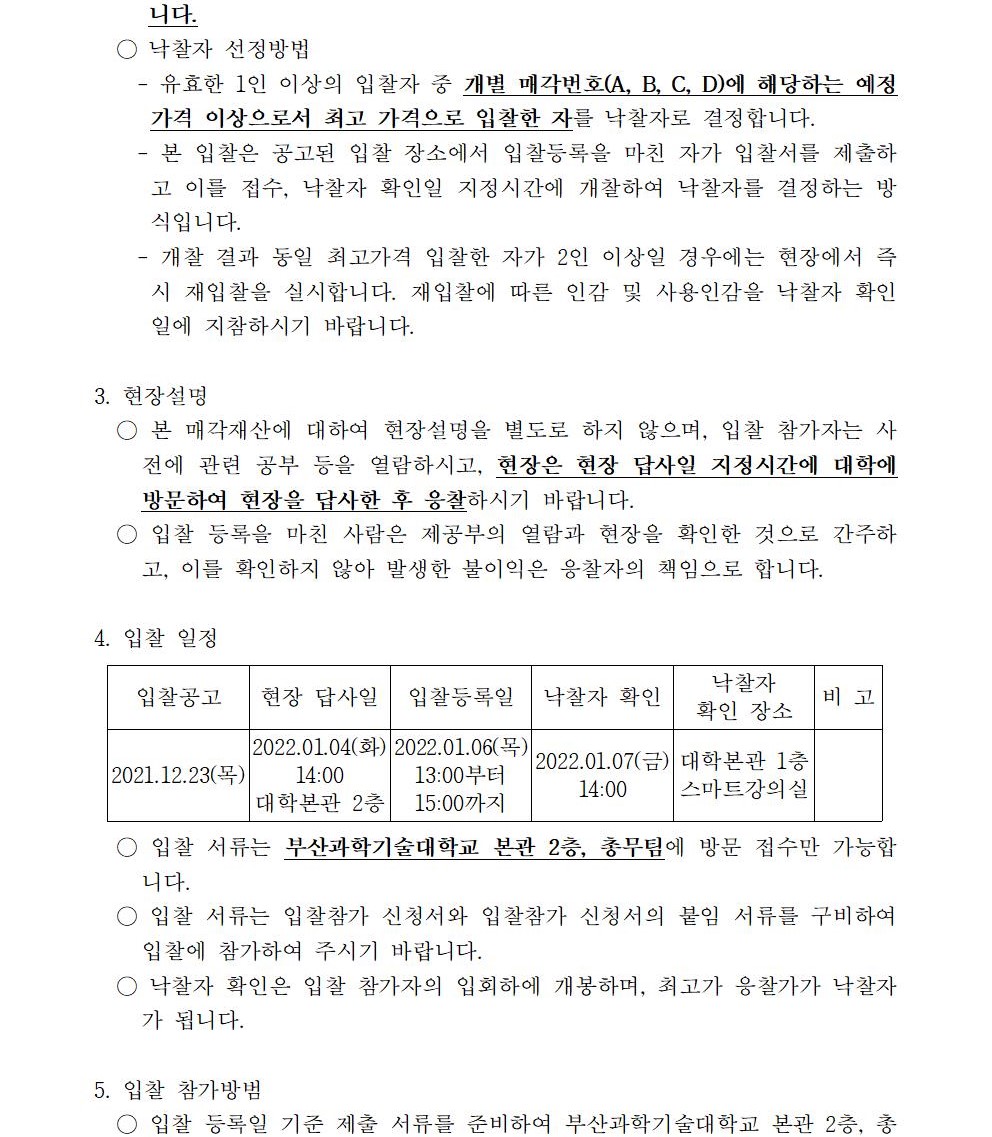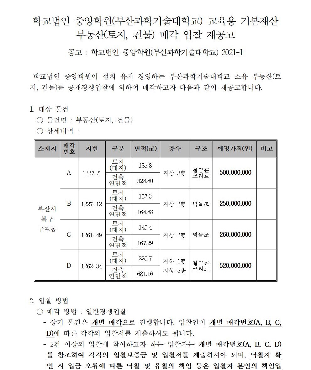 HOME > 기타 > 입찰/채용 입찰/채용 제목 [입찰] 학교법인 중앙학원(부산과학기술대학교) 교육용 기본재산 부동산(토지, 건물) 매각 입찰 재공고(1) 등록일 2021.12.23 10:12:21 작성자 행정지원처 첨부파일 붙임9. 입찰참가 서류 양식(재공고-1).zip [9.98 MB]붙임1 매각공고문(2차 재1).pdf [82.51 KB] 조회 2051 이전글 [입찰] 학교법인 중앙학원(부산과학기술대학교) 교육용 기본재산 부동산(토지, 건물) 매각 입찰 공고 다음글 [입찰] 사회맞춤형 / 대학혁신 실습실 환경개선공사 입찰(긴급) 목록 비밀글 비밀번호 입력 폼 비밀번호 입력 비밀번호를 입력하여 주세요. 관리자는 확인버튼만 누르시면 됩니다. 비밀번호 잘못된 비밀번호입니다. 비밀번호를 다시 입력해주세요. 확인