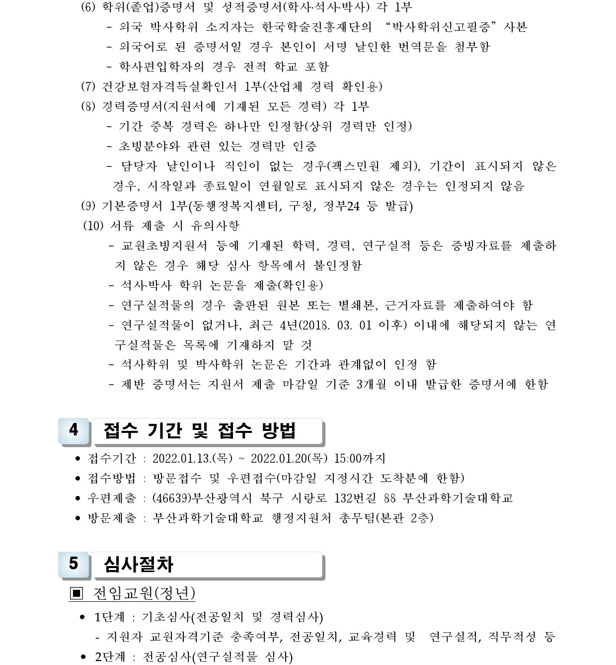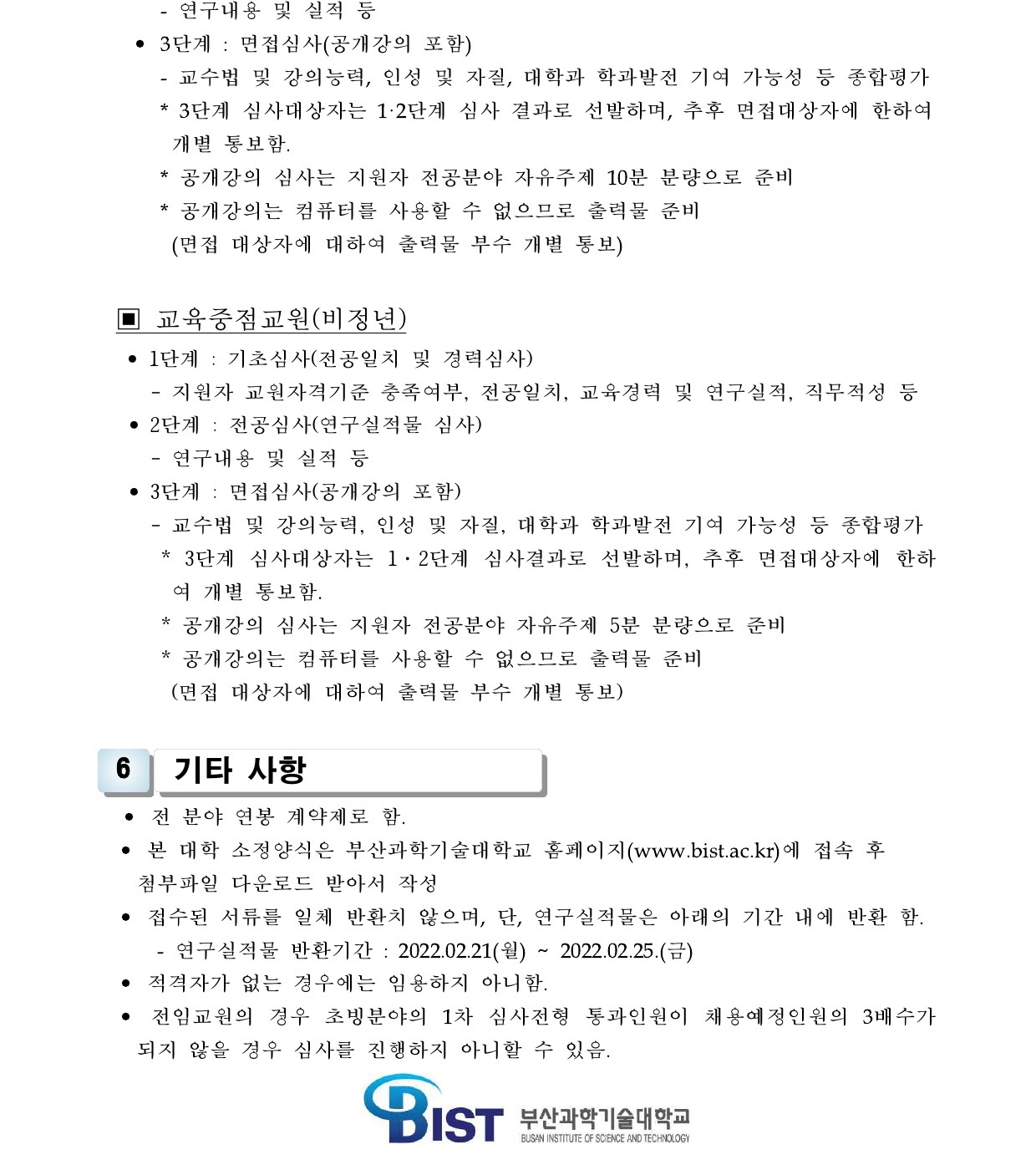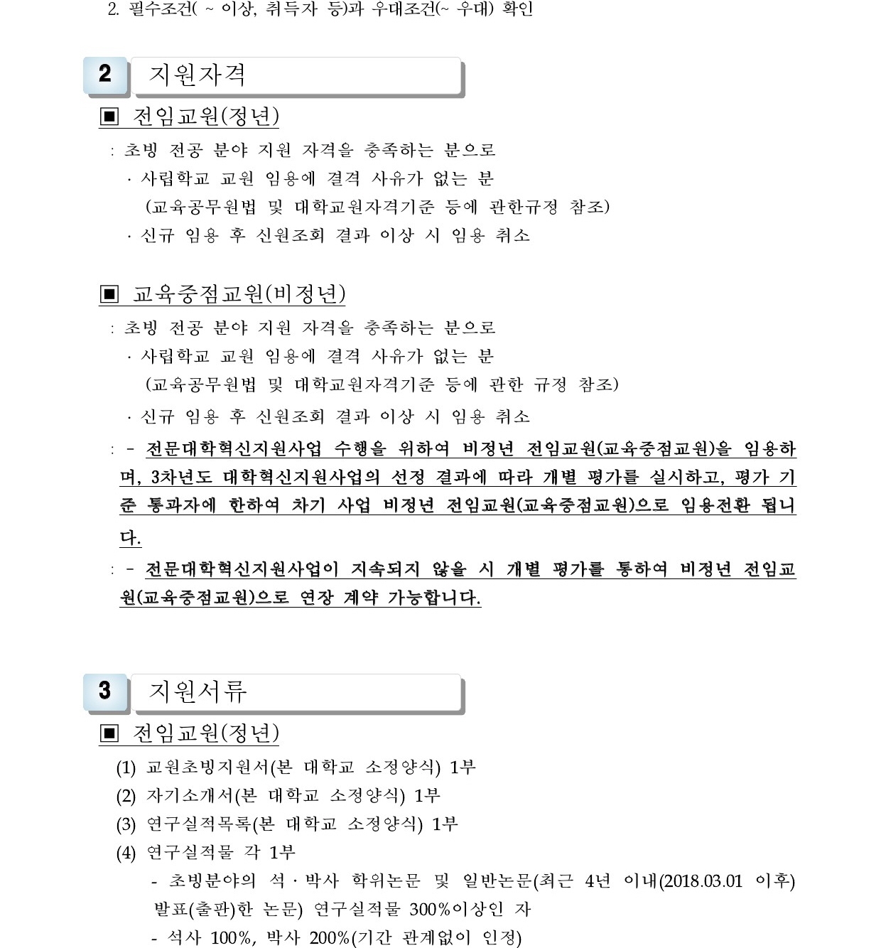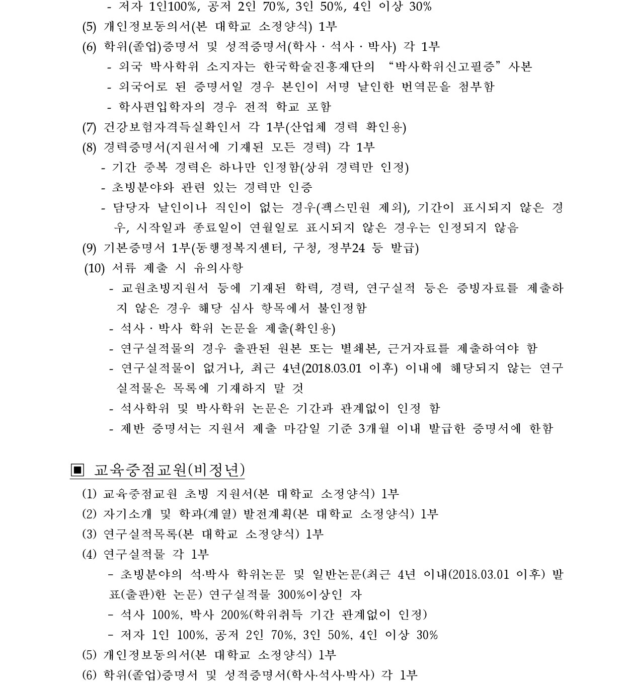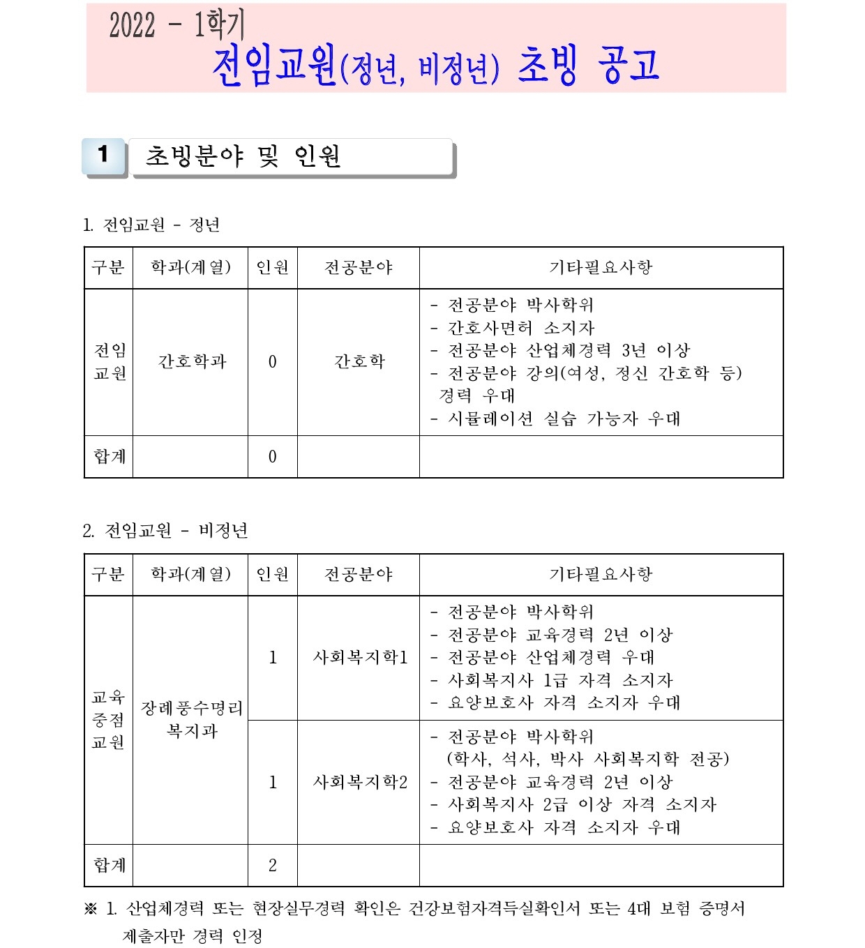 HOME > 기타 > 입찰/채용 입찰/채용 제목 [채용] 2022학년도 1학기 전임교원(정년, 비정년) 초빙 공고 등록일 2022.01.06 15:01:00 작성자 행정지원처 첨부파일 1-1-3-가. 신규임용계획(공고문).pdf [188.55 KB]1-1-3-가. 내외부공고-첨부서류.zip [208.31 KB] 조회 2200 이전글 [입찰] 사회맞춤형 / 대학혁신 실습실 환경개선공사 입찰(긴급) 다음글 [채용] 2022학년도 1학기 비전임 교원(겸임교원) 초빙 공고 목록 비밀글 비밀번호 입력 폼 비밀번호 입력 비밀번호를 입력하여 주세요. 관리자는 확인버튼만 누르시면 됩니다. 비밀번호 잘못된 비밀번호입니다. 비밀번호를 다시 입력해주세요. 확인