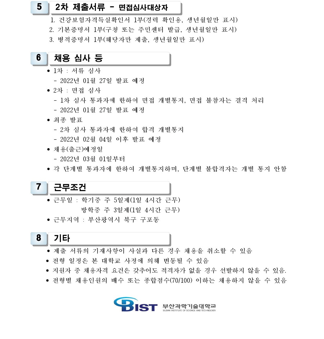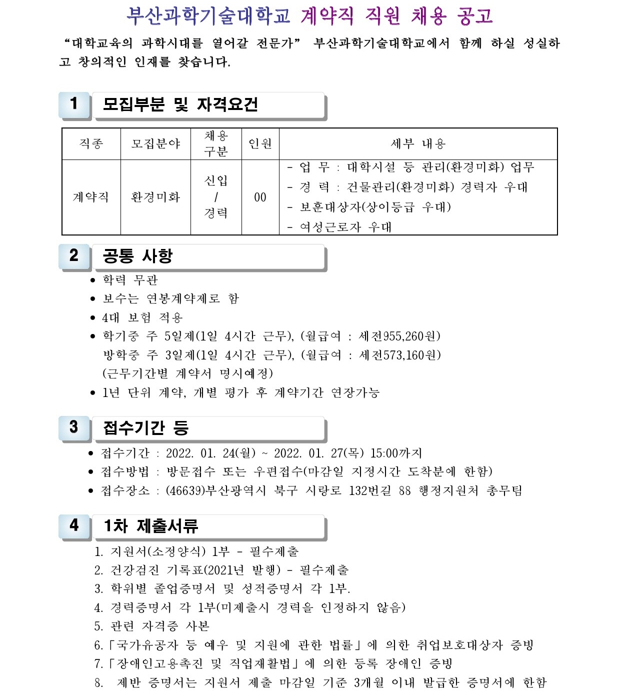 HOME > 기타 > 입찰/채용 입찰/채용 제목 [채용] 부산과학기술대학교 계약직 직원 채용 공고 (환경미화) 등록일 2022.01.13 13:01:42 작성자 행정지원처 첨부파일 1-4. 직원채용_외부공고.pdf [176.04 KB]1-4-1. 직원채용_지원서.hwp [20.00 KB] 조회 2001 이전글 [입찰] 사회맞춤형 기자재(구강스캐너 등) 구입 입찰 다음글 [채용] 산학협력단 사회맞춤형사업(LINC+) 계약직 직원 채용 공고 목록 비밀글 비밀번호 입력 폼 비밀번호 입력 비밀번호를 입력하여 주세요. 관리자는 확인버튼만 누르시면 됩니다. 비밀번호 잘못된 비밀번호입니다. 비밀번호를 다시 입력해주세요. 확인