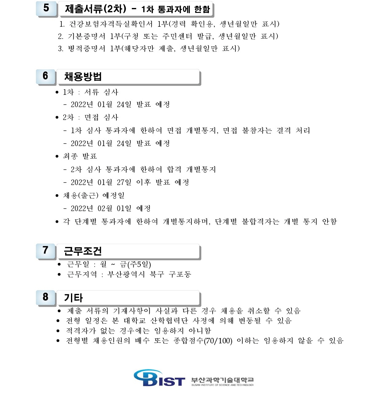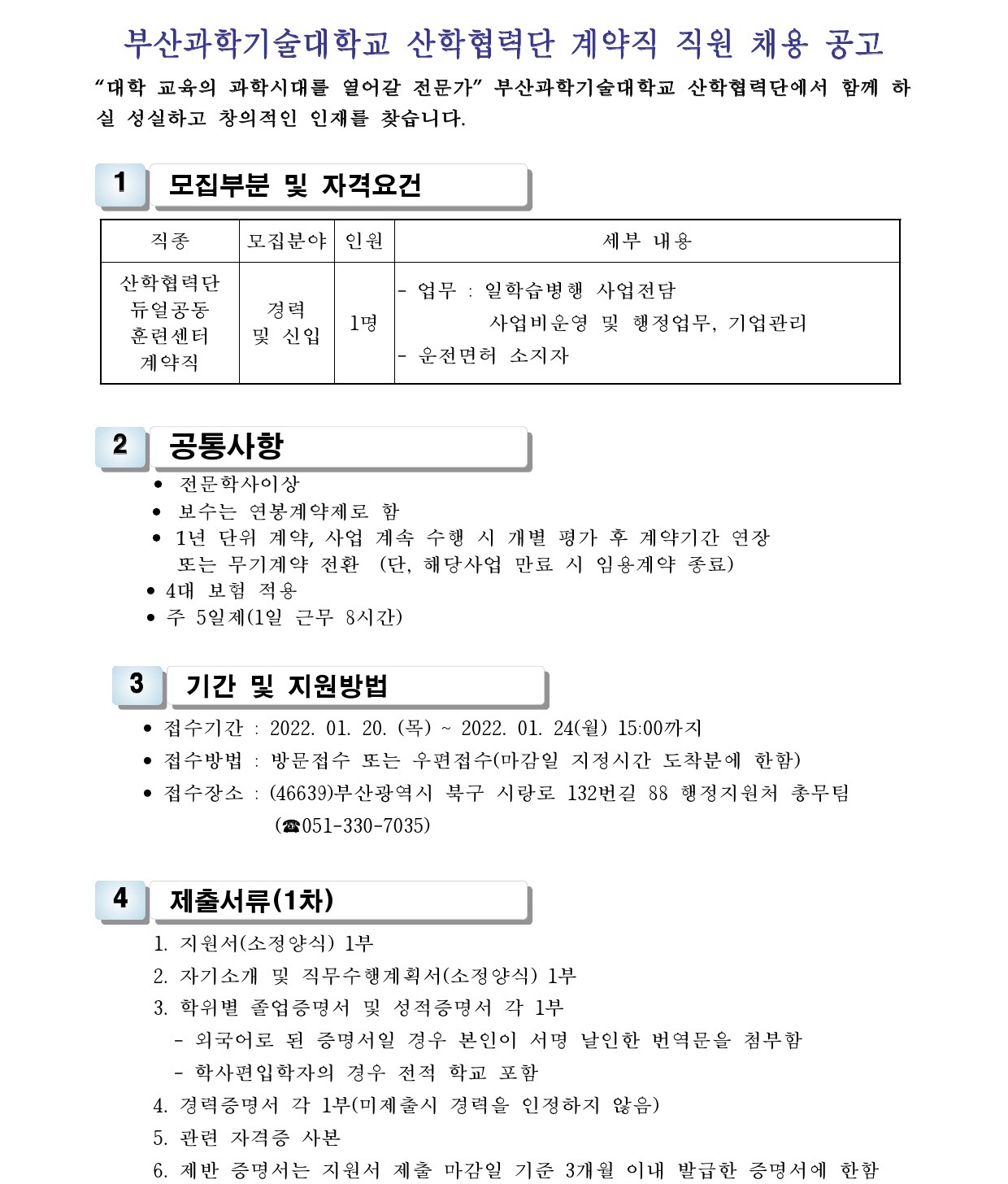 HOME > 기타 > 입찰/채용 입찰/채용 제목 [채용] 산학협력단 듀얼공동훈련센터(일학습병행제사업) 전담 계약직 직원 채용 등록일 2022.01.17 08:01:23 작성자 행정지원처 첨부파일 1-2. 공고문(산단-듀얼공동훈련센터-일학습).pdf [179.65 KB]1-3. 지원서 및 자기소개서(산단-듀얼공동훈련센터-일학습).hwp [21.50 KB] 조회 2011 이전글 [채용] 산학협력단 사회맞춤형사업(LINC+) 계약직 직원 채용 공고 다음글 [채용] 2022학년도 1학기 교원(강사) 초빙 공고(2차) 목록 비밀글 비밀번호 입력 폼 비밀번호 입력 비밀번호를 입력하여 주세요. 관리자는 확인버튼만 누르시면 됩니다. 비밀번호 잘못된 비밀번호입니다. 비밀번호를 다시 입력해주세요. 확인