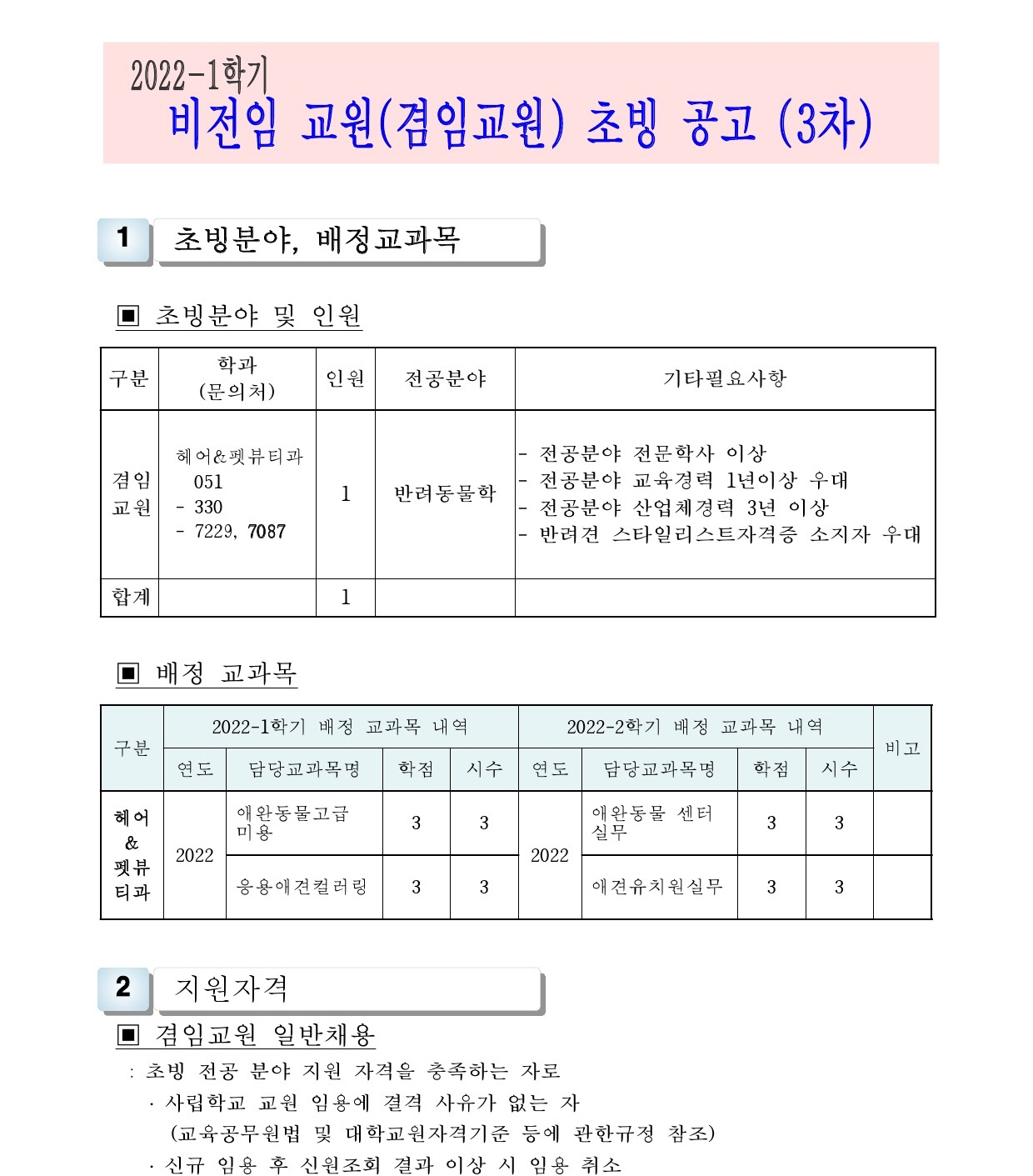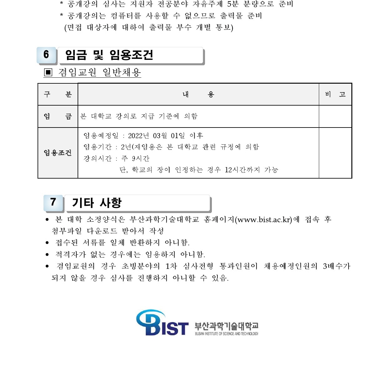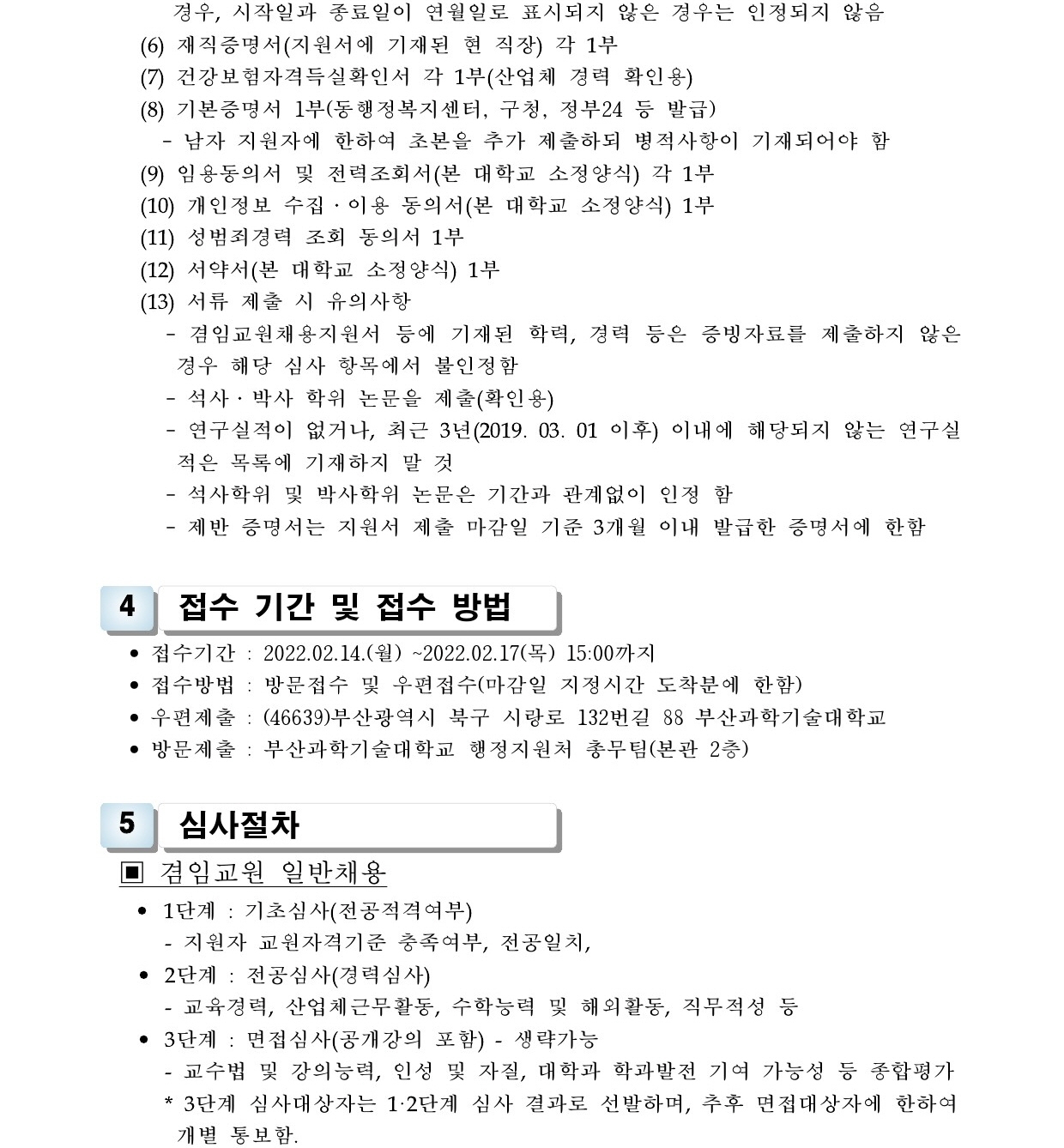HOME > 기타 > 입찰/채용 입찰/채용 제목 [채용] 2022학년도 1학기 비전임 교원(겸임교원) 초빙 공고 (3차) 등록일 2022.02.10 09:21:36 작성자 행정지원처 첨부파일 1-1-3-가. 신규임용계획(공고문).pdf [213.81 KB]1-1-4. 겸임교원 일반채용 구비서류.zip [62.34 KB] 조회 2108 이전글 [채용] 부산과학기술대학교 계약직 직원 추가 채용 공고 (환경미화) 다음글 [채용] 2022학년도 1학기 전임교원(정년) 초빙 공고 (2차) 목록 비밀글 비밀번호 입력 폼 비밀번호 입력 비밀번호를 입력하여 주세요. 관리자는 확인버튼만 누르시면 됩니다. 비밀번호 잘못된 비밀번호입니다. 비밀번호를 다시 입력해주세요. 확인