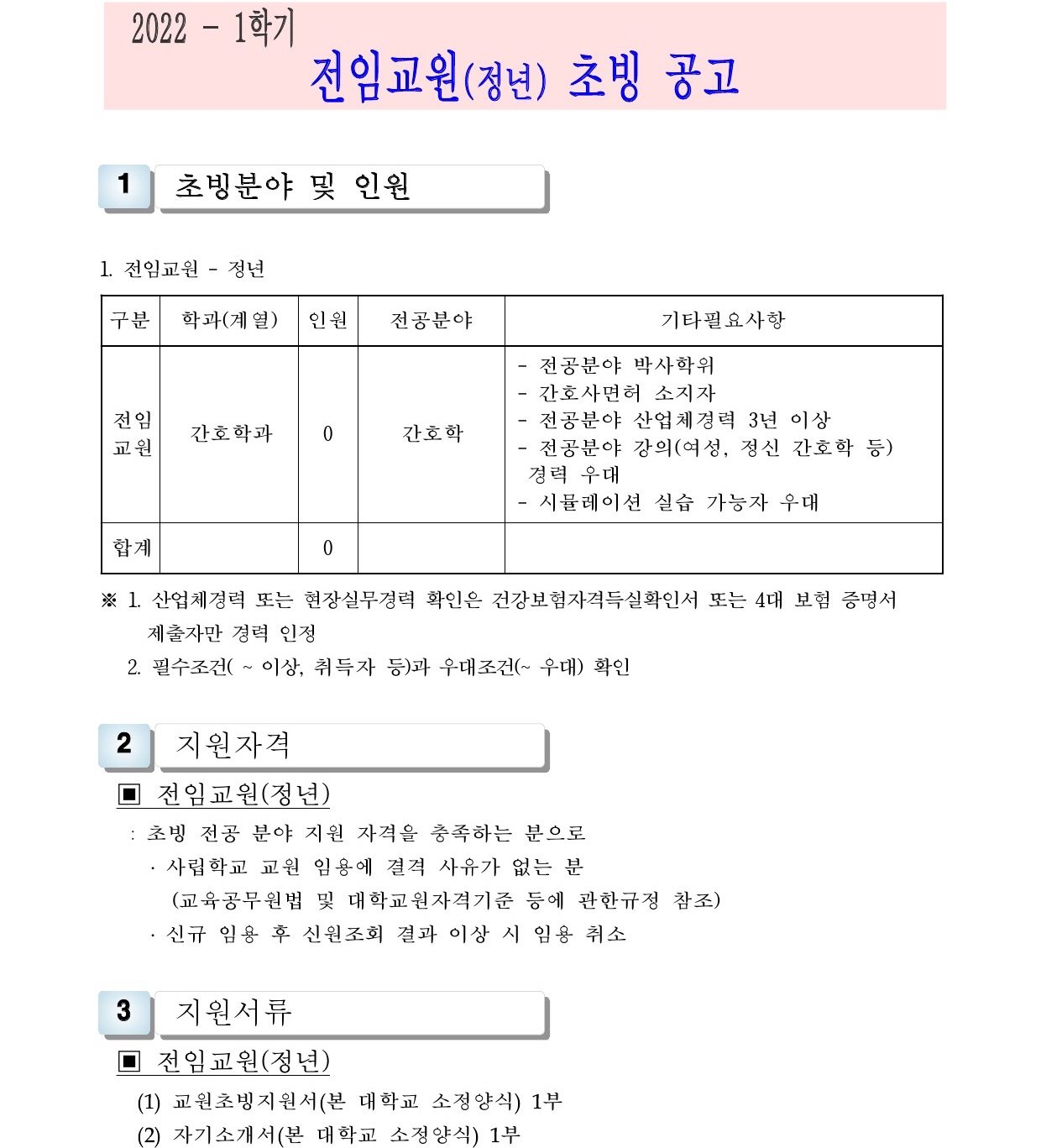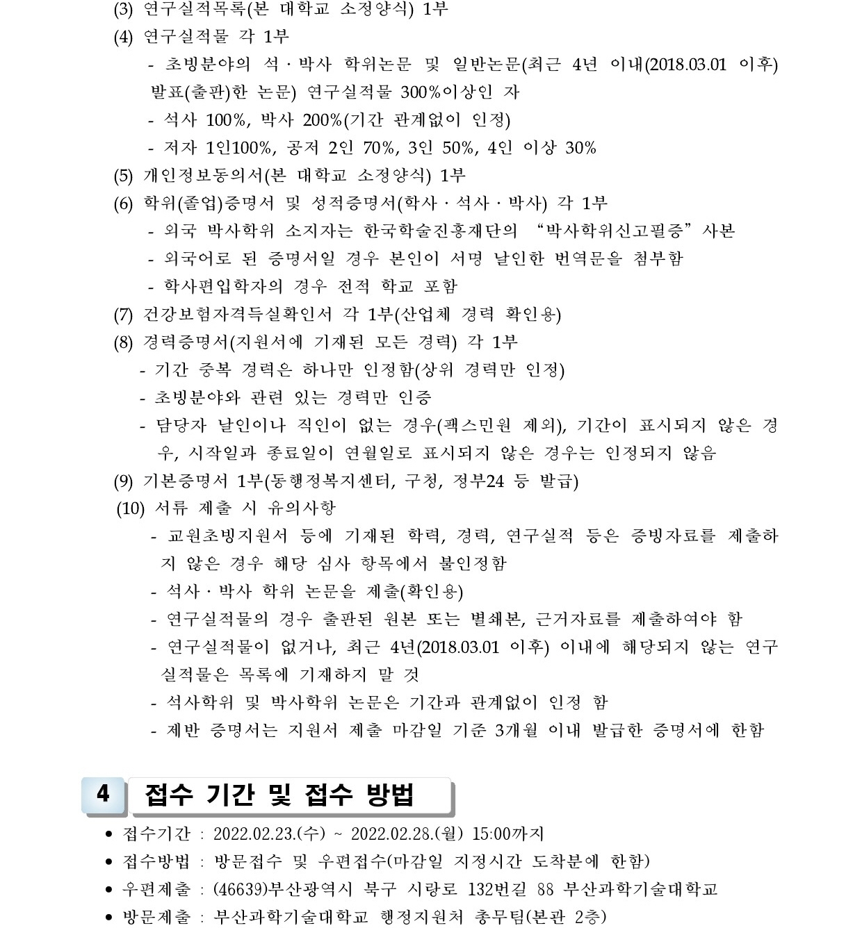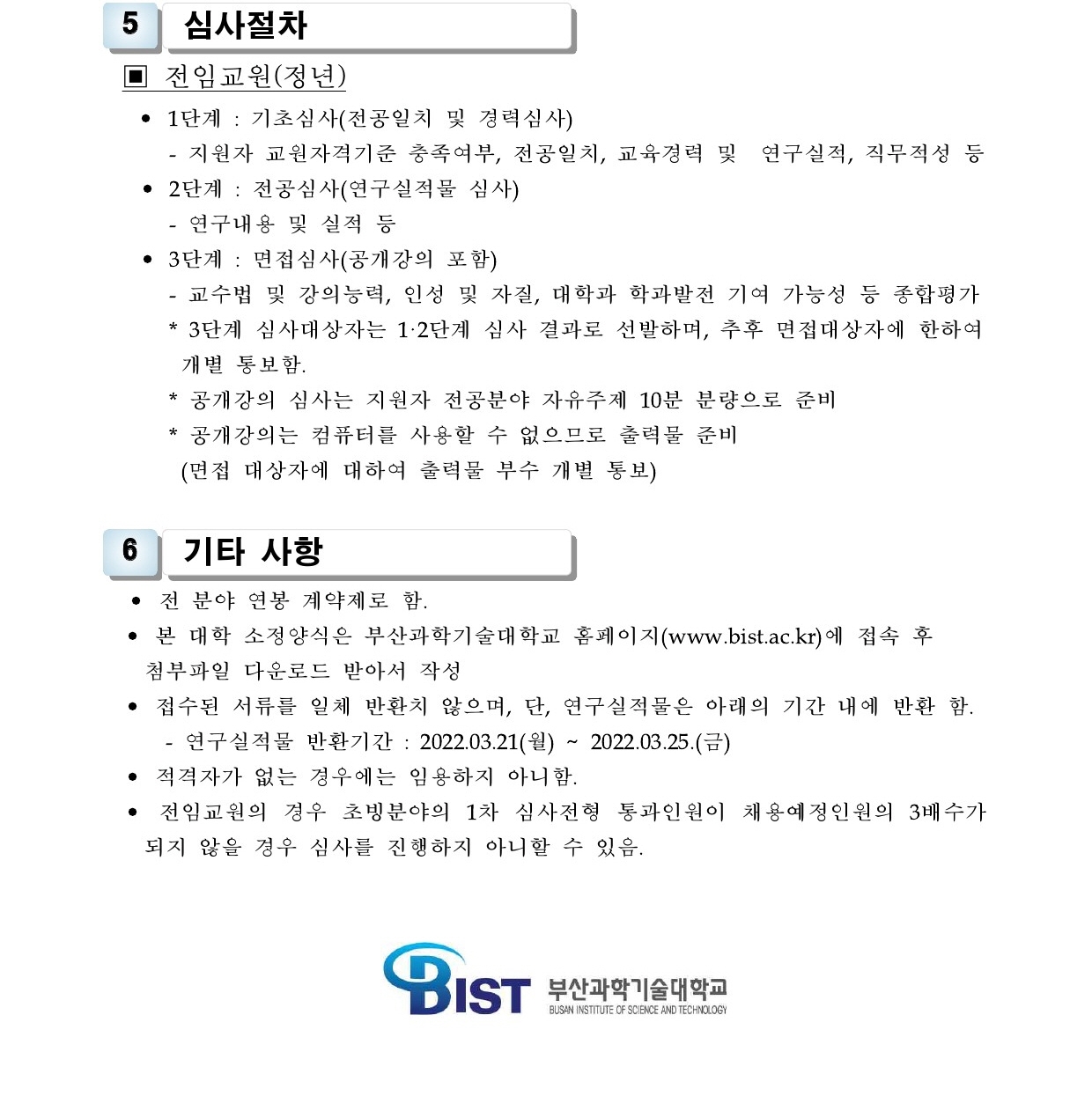 HOME > 기타 > 입찰/채용 입찰/채용 제목 [채용] 2022학년도 1학기 전임교원(정년) 초빙 공고 (2차) 등록일 2022.02.11 13:37:34 작성자 행정지원처 첨부파일 1-1-3-가. 신규임용계획(공고문).pdf [176.97 KB]1-1-3-가. 내외부공고-첨부서류.zip [197.78 KB] 조회 3165 이전글 [채용] 2022학년도 1학기 비전임 교원(겸임교원) 초빙 공고 (3차) 다음글 [입찰] 학교법인 중앙학원(부산과학기술대학교) 교육용 기본재산 부동산(토지, 건물) 매각 입찰 공고(2차) 목록 비밀글 비밀번호 입력 폼 비밀번호 입력 비밀번호를 입력하여 주세요. 관리자는 확인버튼만 누르시면 됩니다. 비밀번호 잘못된 비밀번호입니다. 비밀번호를 다시 입력해주세요. 확인