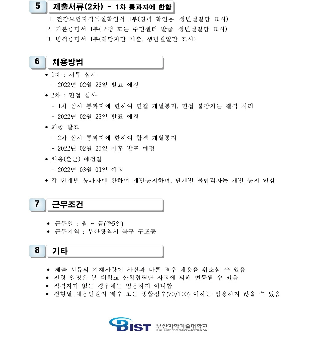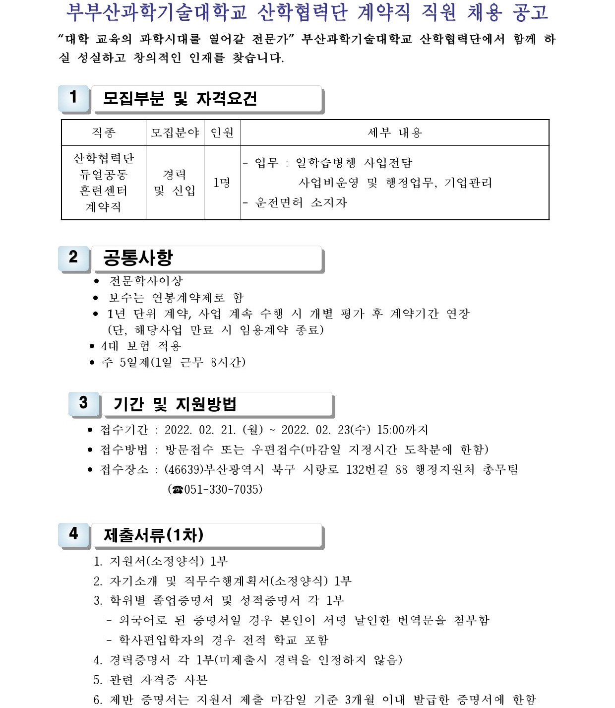 HOME > 기타 > 입찰/채용 입찰/채용 제목 [채용] 산학협력단 듀얼공동훈련센터(일학습병행제사업) 전담 계약직 직원 채용 등록일 2022.02.17 10:14:21 작성자 행정지원처 첨부파일 1-2. 공고문(산단-듀얼공동훈련센터-일학습).pdf [183.77 KB]1-3. 지원서 및 자기소개서(산단-듀얼공동훈련센터-일학습).hwp [21.50 KB] 조회 1707 이전글 [입찰] 학교법인 중앙학원(부산과학기술대학교) 교육용 기본재산 부동산(토지, 건물) 매각 입찰 공고(2차) 다음글 [채용] 대학 보건실(간호사) 계약직 직원 채용 목록 비밀글 비밀번호 입력 폼 비밀번호 입력 비밀번호를 입력하여 주세요. 관리자는 확인버튼만 누르시면 됩니다. 비밀번호 잘못된 비밀번호입니다. 비밀번호를 다시 입력해주세요. 확인