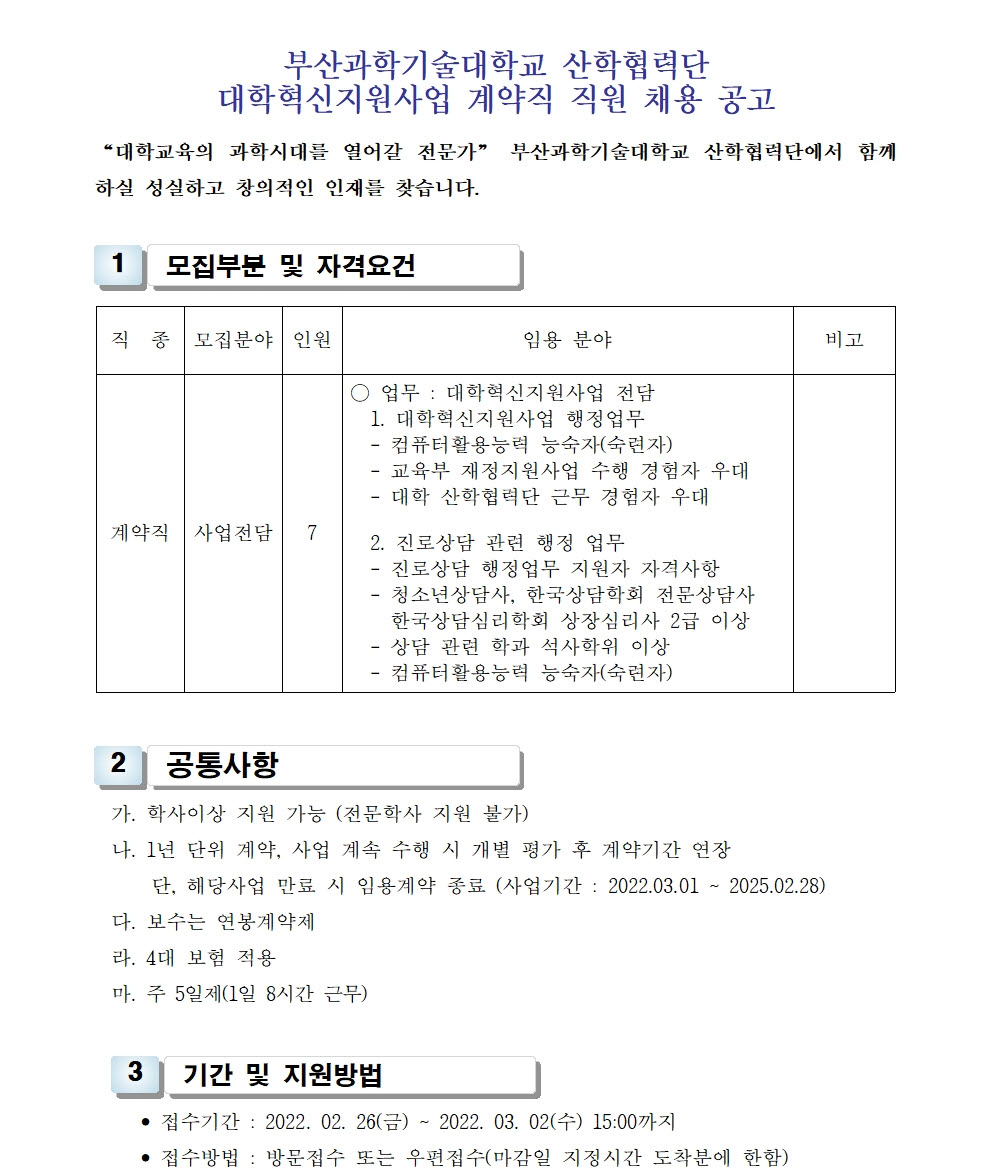 HOME > 기타 > 입찰/채용 입찰/채용 제목 [채용] 산학협력단 대학혁신지원사업 계약직 직원 채용 공고 등록일 2022.02.22 10:02:04 작성자 행정지원처 첨부파일 1-3. 지원서 및 자기소개서(계약직).hwp [21.50 KB] 조회 1944 이전글 [채용] 대학 보건실(간호사) 계약직 직원 채용 다음글 [채용] 3단계 산학연협력선도 (LINC 3.0) 계약직 직원 채용 공고 목록 비밀글 비밀번호 입력 폼 비밀번호 입력 비밀번호를 입력하여 주세요. 관리자는 확인버튼만 누르시면 됩니다. 비밀번호 잘못된 비밀번호입니다. 비밀번호를 다시 입력해주세요. 확인