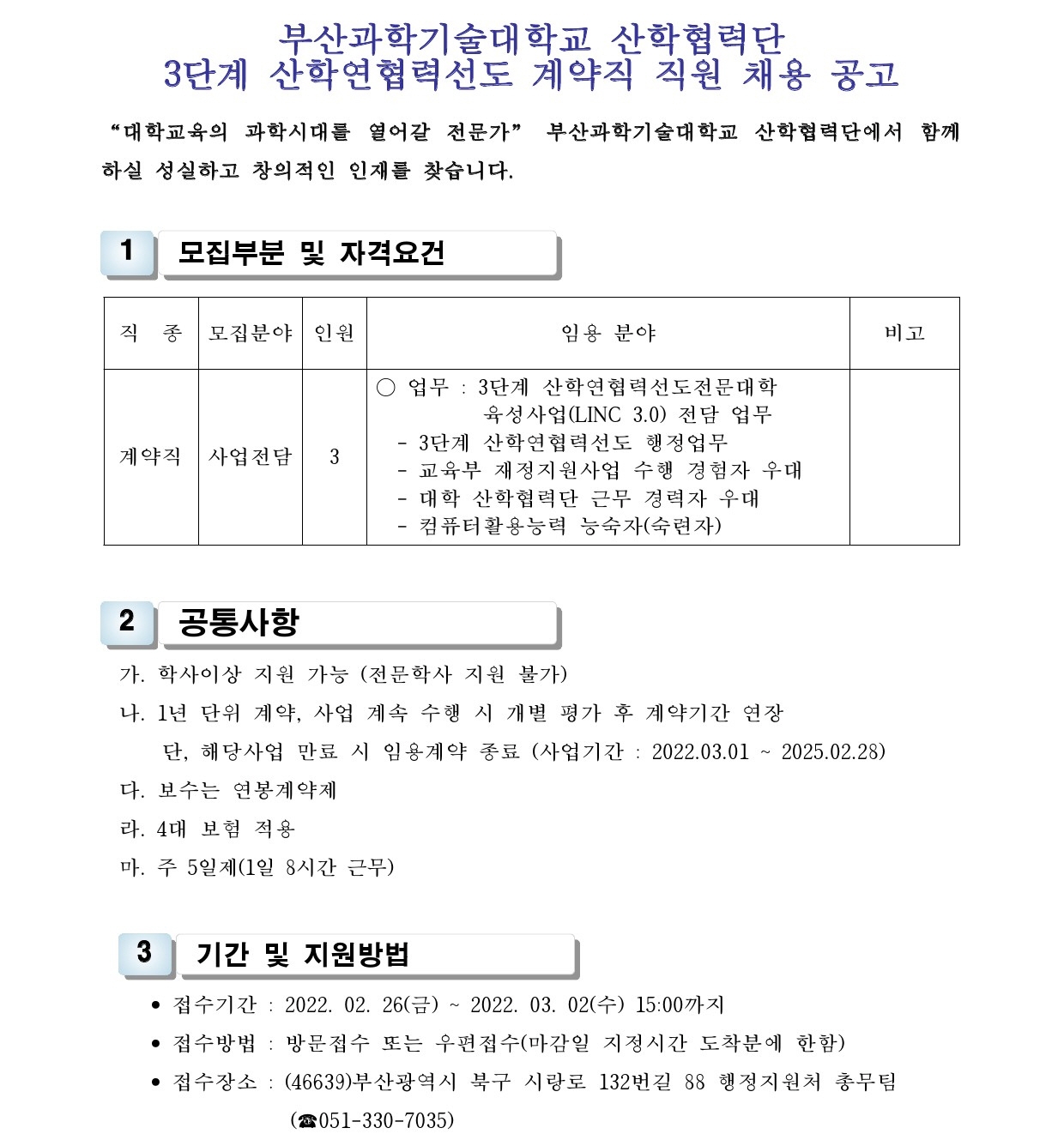 HOME > 기타 > 입찰/채용 입찰/채용 제목 [채용] 3단계 산학연협력선도 (LINC 3.0) 계약직 직원 채용 공고 등록일 2022.02.22 10:34:12 작성자 행정지원처 첨부파일 1-2. 공고문(계약직).pdf [173.92 KB]1-3. 지원서 및 자기소개서(계약직).hwp [21.50 KB] 조회 1857 이전글 [채용] 산학협력단 대학혁신지원사업 계약직 직원 채용 공고 다음글 [채용] 산학협력단 정부재정지원사업 사업전담교수 채용 공고 목록 비밀글 비밀번호 입력 폼 비밀번호 입력 비밀번호를 입력하여 주세요. 관리자는 확인버튼만 누르시면 됩니다. 비밀번호 잘못된 비밀번호입니다. 비밀번호를 다시 입력해주세요. 확인