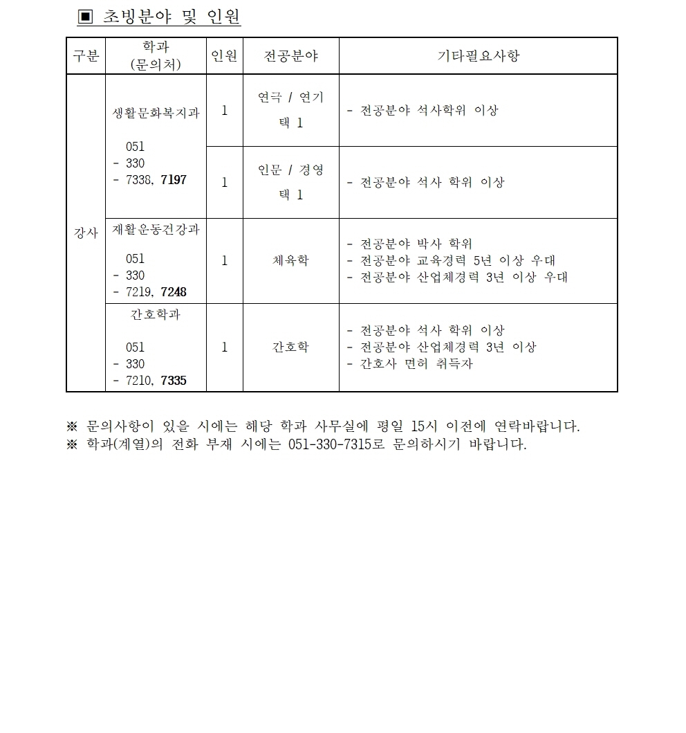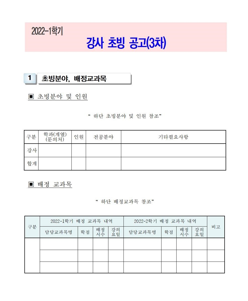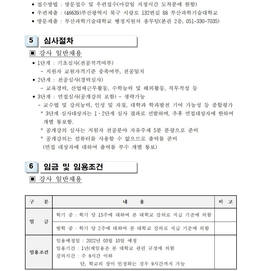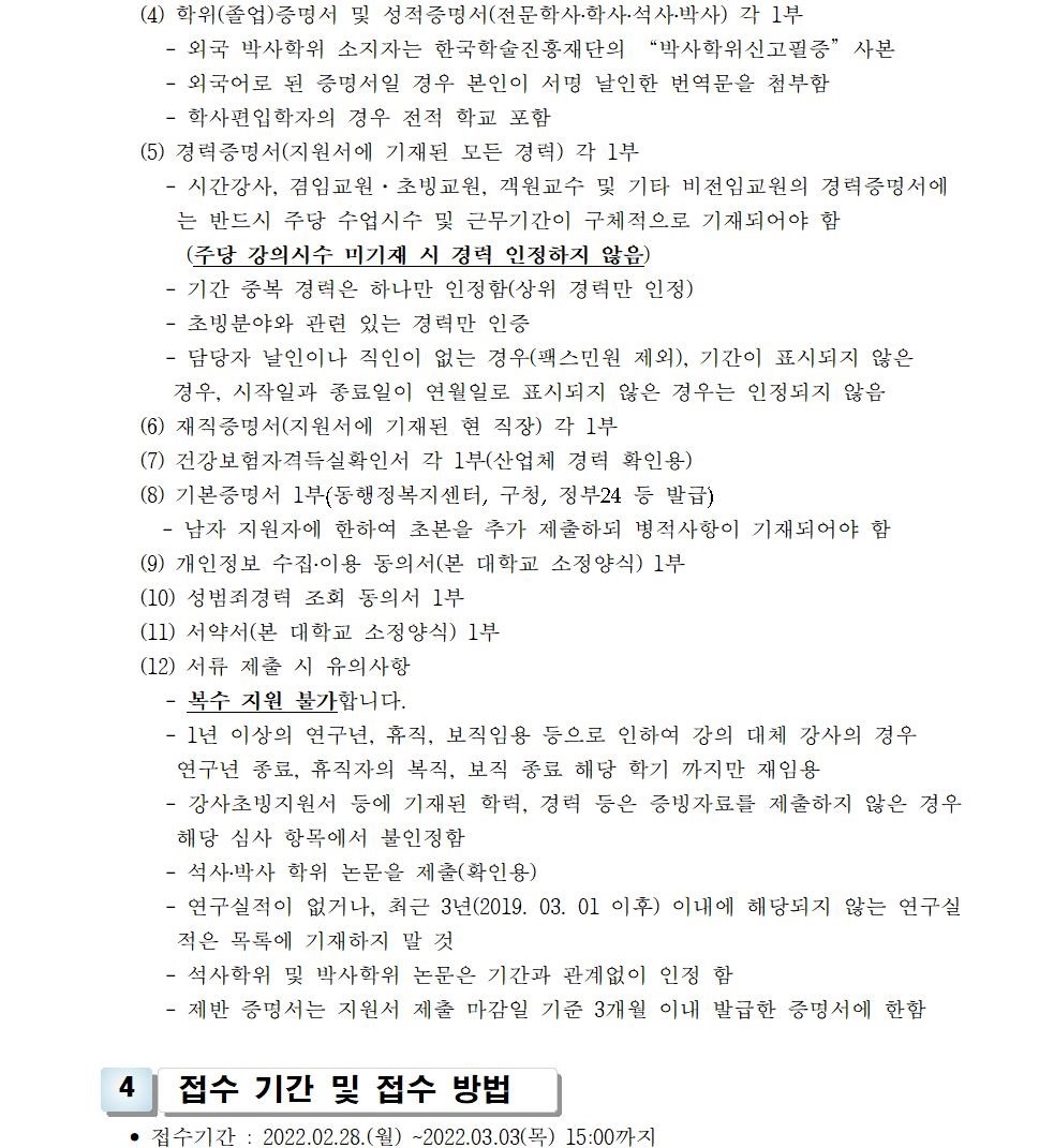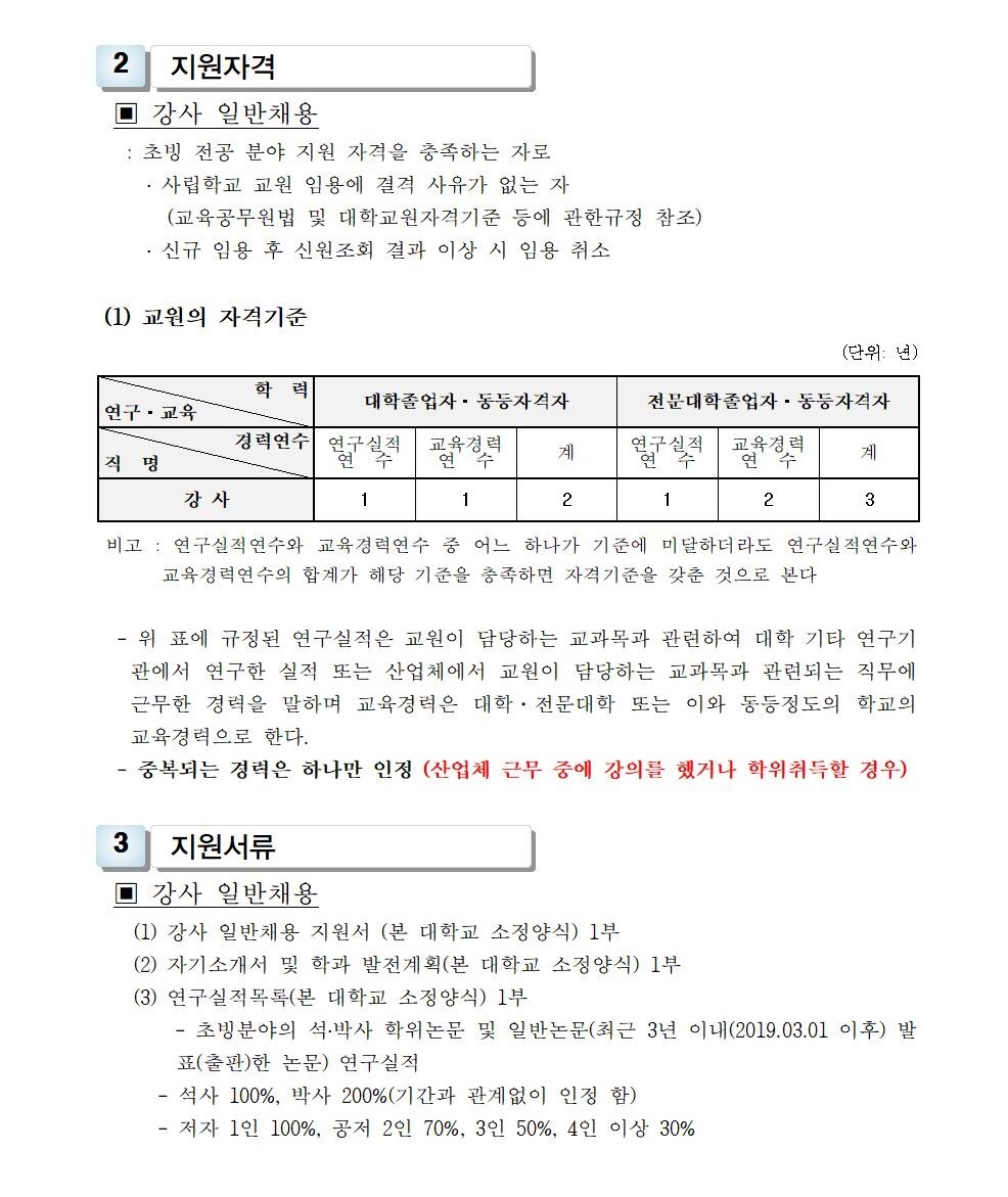 HOME > 기타 > 입찰/채용 입찰/채용 제목 [채용] 2022학년도 1학기 교원(강사) 초빙 공고(3차) 등록일 2022.02.24 08:02:30 작성자 행정지원처 첨부파일 1-1-5 강사 일반채용 구비서류.zip [54.42 KB]1-1-3-가-1. 강사신규임용계획(공고문).pdf [208.10 KB] 조회 2239 이전글 [채용] 산학협력단 정부재정지원사업 사업전담교수 채용 공고 다음글 [채용] 2022학년도 1학기 교원(강사) 초빙 공고(4차) 목록 비밀글 비밀번호 입력 폼 비밀번호 입력 비밀번호를 입력하여 주세요. 관리자는 확인버튼만 누르시면 됩니다. 비밀번호 잘못된 비밀번호입니다. 비밀번호를 다시 입력해주세요. 확인