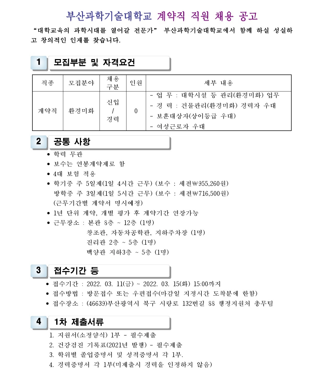 HOME > 기타 > 입찰/채용 입찰/채용 제목 [채용] 부산과학기술대학교 계약직 직원 채용 공고 (환경미화) 등록일 2022.03.08 09:59:44 작성자 행정지원처 첨부파일 1-4. 직원채용_외부공고.pdf [175.42 KB]1-4-1. 직원채용_지원서.hwp [20.00 KB] 조회 1816 이전글 [입찰] 학교법인 중앙학원(부산과학기술대학교) 교육용 기본재산 부동산(토지, 건물) 매각 입찰 재공고(2차) 다음글 [채용] 산학협력단 지역주도형 청년 일자리사업 전담 계약직 직원 채용 목록 비밀글 비밀번호 입력 폼 비밀번호 입력 비밀번호를 입력하여 주세요. 관리자는 확인버튼만 누르시면 됩니다. 비밀번호 잘못된 비밀번호입니다. 비밀번호를 다시 입력해주세요. 확인