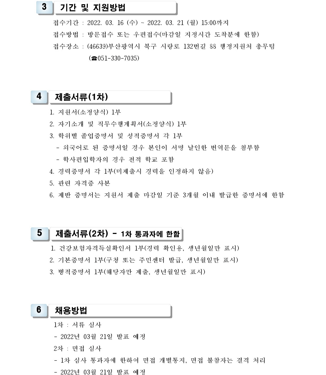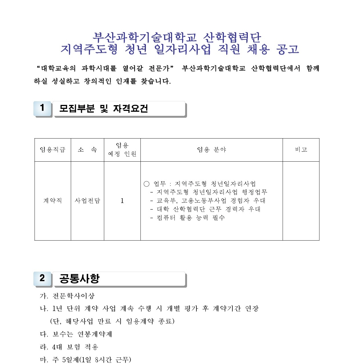 HOME > 기타 > 입찰/채용 입찰/채용 제목 [채용] 산학협력단 지역주도형 청년 일자리사업 전담 계약직 직원 채용 등록일 2022.03.11 11:08:49 작성자 행정지원처 첨부파일 1-2. 공고문(계약직).pdf [172.10 KB]1-3. 지원서 및 자기소개서(계약직).hwp [21.50 KB] 조회 1999 이전글 [채용] 부산과학기술대학교 계약직 직원 채용 공고 (환경미화) 다음글 [채용] 산학협력단 듀얼공동훈련센터(일학습병행제사업) 전담 계약직 직원 채용 목록 비밀글 비밀번호 입력 폼 비밀번호 입력 비밀번호를 입력하여 주세요. 관리자는 확인버튼만 누르시면 됩니다. 비밀번호 잘못된 비밀번호입니다. 비밀번호를 다시 입력해주세요. 확인