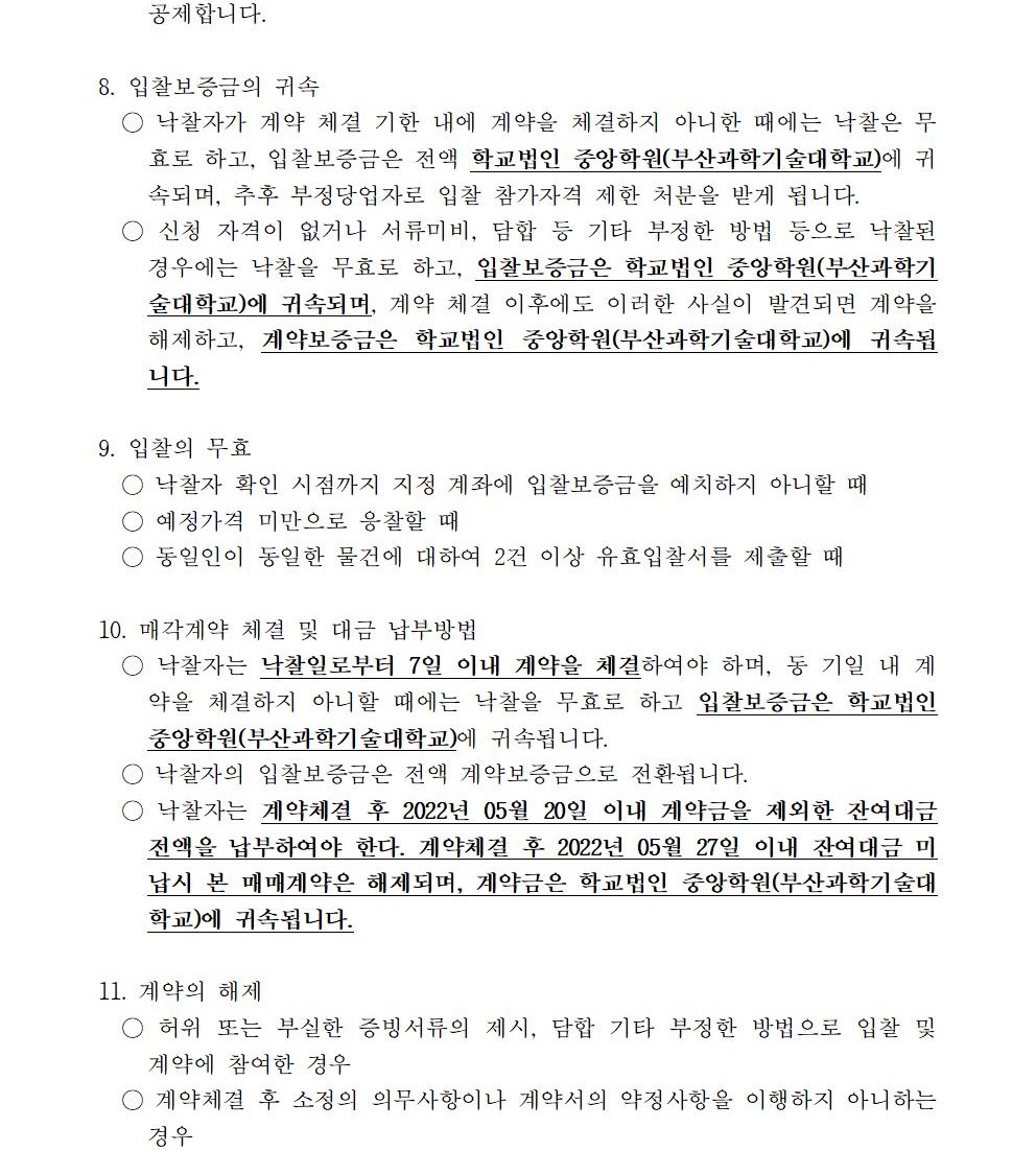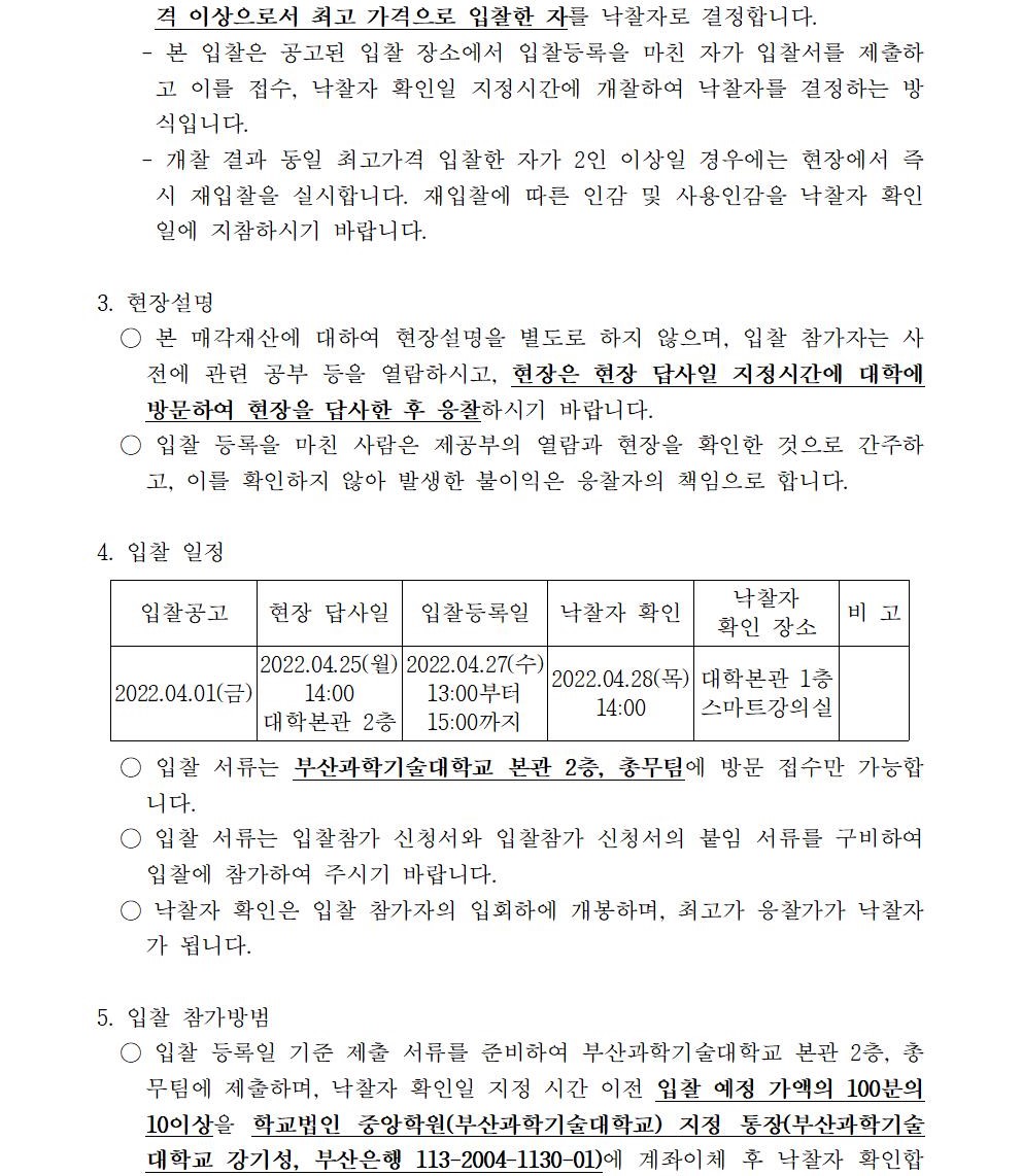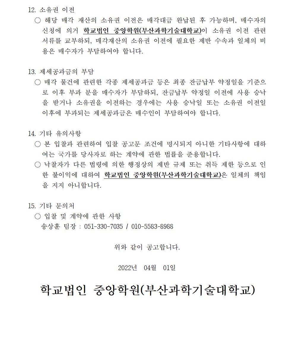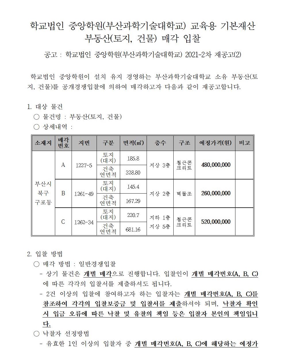HOME > 기타 > 입찰/채용 입찰/채용 제목 [입찰] 학교법인 중앙학원(부산과학기술대학교) 교육용 기본재산 부동산(토지, 건물) 매각 입찰 재공고(2차-2) 등록일 2022.04.01 11:04:05 작성자 행정지원처 첨부파일 붙임1 매각공고문(2차-재공고(2)).pdf [82.16 KB]붙임9. 입찰참가 서류 양식(2차 재공고(2)).zip [7.19 MB] 조회 1783 이전글 [입찰] 2023학년도 입시홍보물 제작관련 업체 선정 입찰(협상에 의한 계약) 공고(긴급) 다음글 [채용] 대학 보건실(간호사) 계약직 직원 채용 재공고 목록 비밀글 비밀번호 입력 폼 비밀번호 입력 비밀번호를 입력하여 주세요. 관리자는 확인버튼만 누르시면 됩니다. 비밀번호 잘못된 비밀번호입니다. 비밀번호를 다시 입력해주세요. 확인