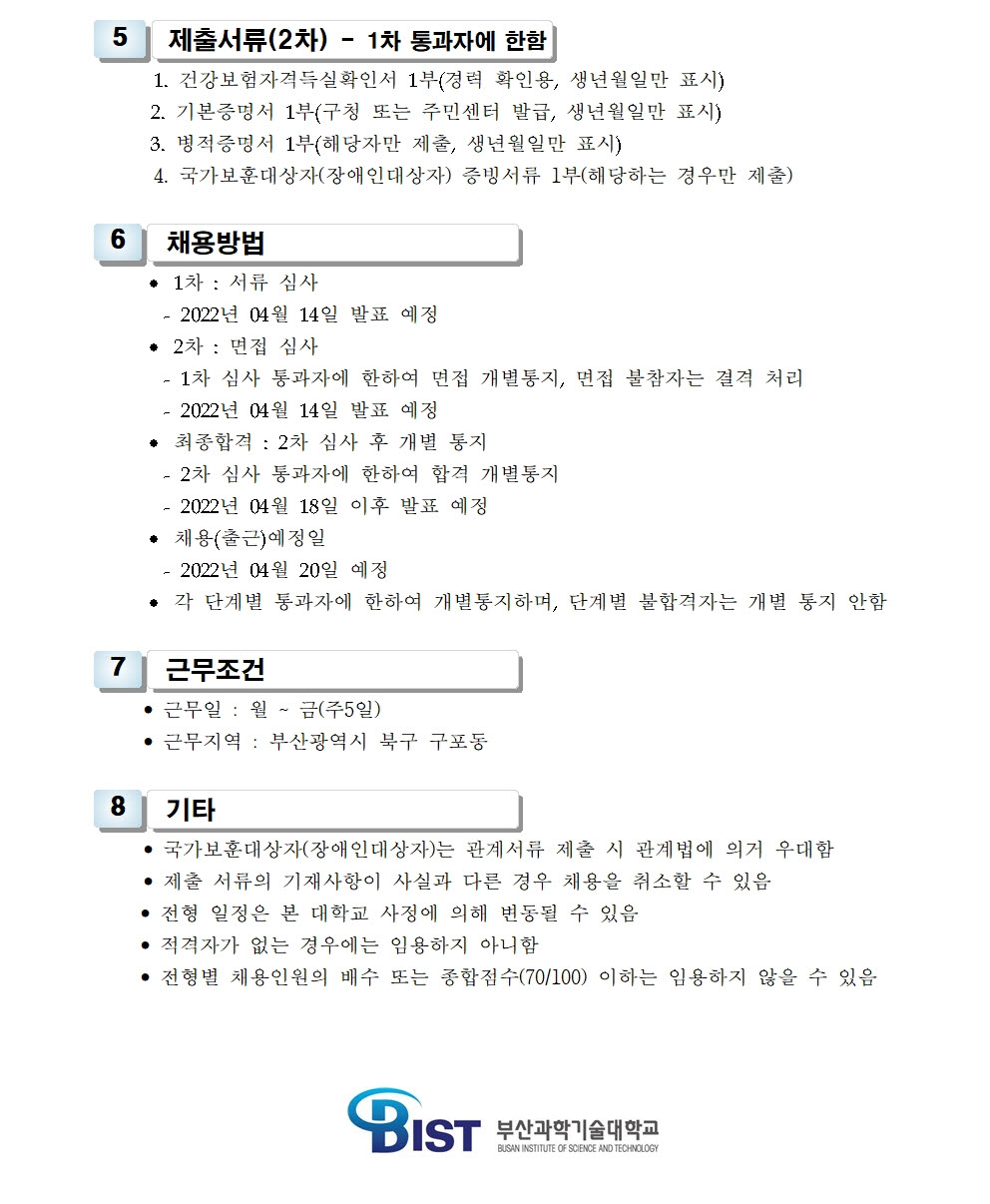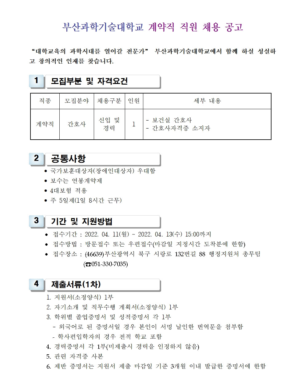 HOME > 기타 > 입찰/채용 입찰/채용 제목 [채용] 대학 보건실(간호사) 계약직 직원 채용 재공고 등록일 2022.04.06 08:04:02 작성자 행정지원처 첨부파일 1-3. 지원서 및 자기소개서(계약직).hwp [49.00 KB]1-2. 공고문(계약직).pdf [165.61 KB] 조회 1892 이전글 [입찰] 학교법인 중앙학원(부산과학기술대학교) 교육용 기본재산 부동산(토지, 건물) 매각 입찰 재공고(2차-2) 다음글 [채용] 산학협력단 듀얼공동훈련센터(일학습병행제사업) 전담 계약직 직원 채용 목록 비밀글 비밀번호 입력 폼 비밀번호 입력 비밀번호를 입력하여 주세요. 관리자는 확인버튼만 누르시면 됩니다. 비밀번호 잘못된 비밀번호입니다. 비밀번호를 다시 입력해주세요. 확인