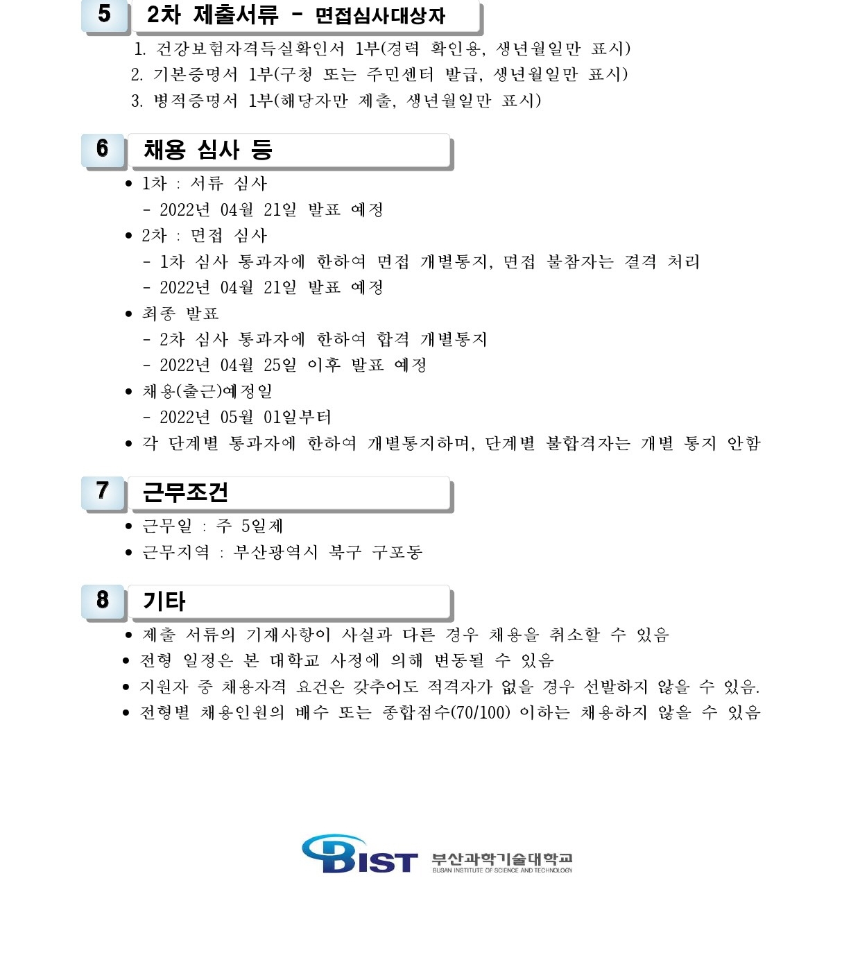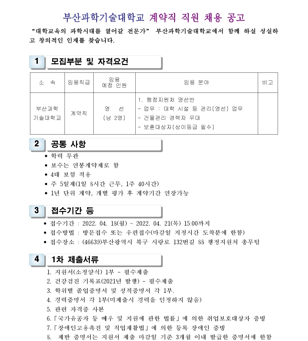 HOME > 기타 > 입찰/채용 입찰/채용 제목 [채용] 부산과학기술대학교 계약직 직원 채용 공고 (영선) 등록일 2022.04.08 08:58:25 작성자 행정지원처 첨부파일 1-4. 직원채용_외부공고.pdf [184.69 KB]1-4-1. 직원채용_지원서.hwp [20.00 KB] 조회 1982 이전글 [입찰] 학교법인 중앙학원 수익용 기본재산 부동산(토지) 매각 입찰 재공고(4) 다음글 [채용] 산학협력단 대학혁신지원사업 계약직 직원 채용 공고 목록 비밀글 비밀번호 입력 폼 비밀번호 입력 비밀번호를 입력하여 주세요. 관리자는 확인버튼만 누르시면 됩니다. 비밀번호 잘못된 비밀번호입니다. 비밀번호를 다시 입력해주세요. 확인