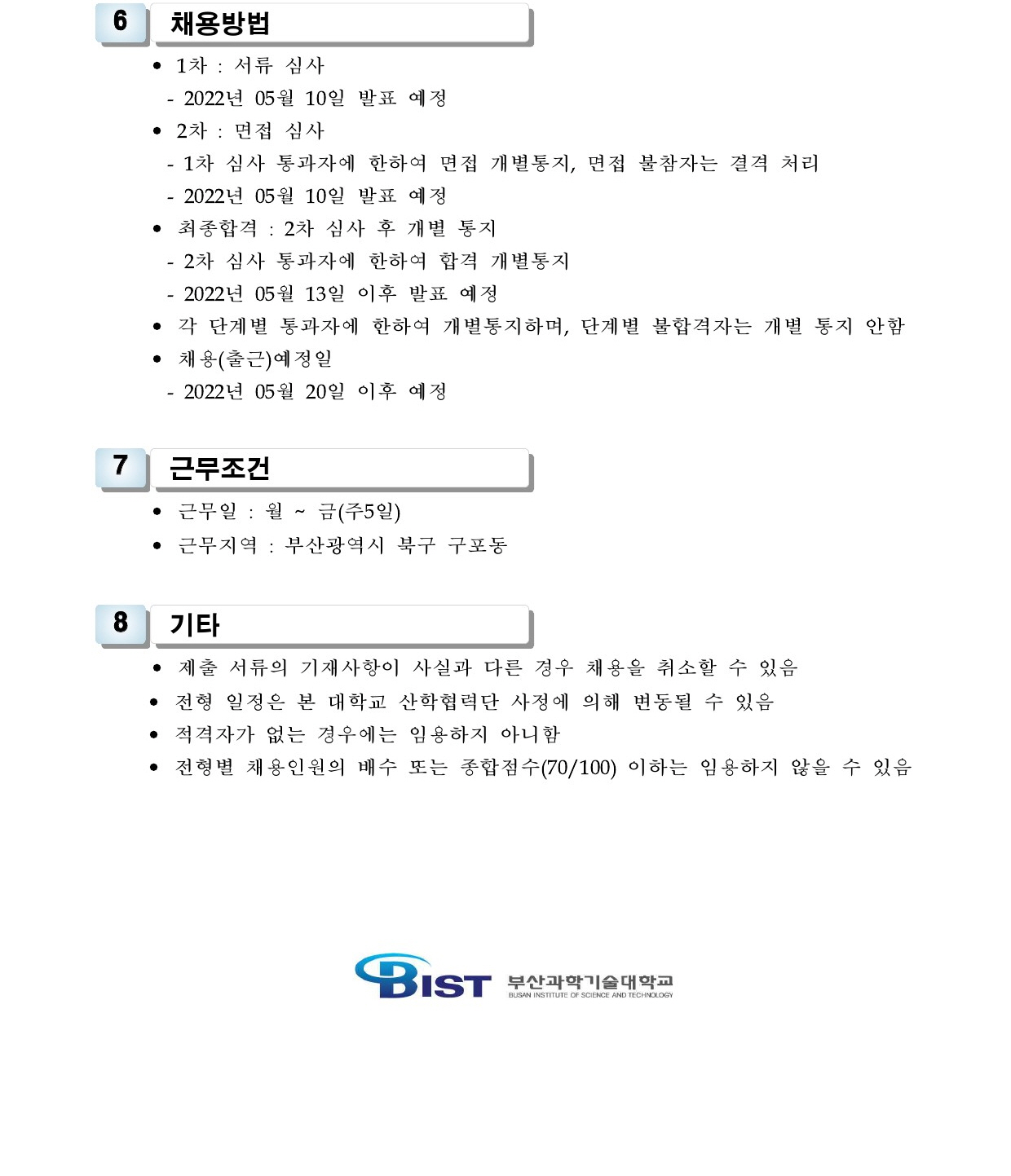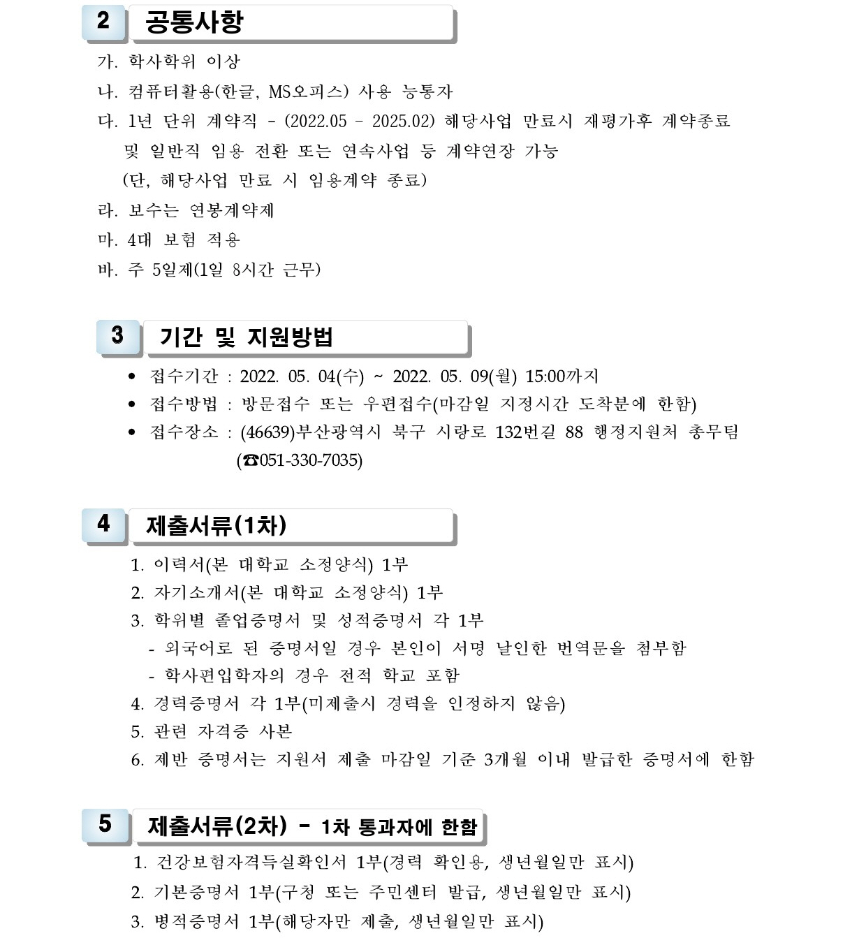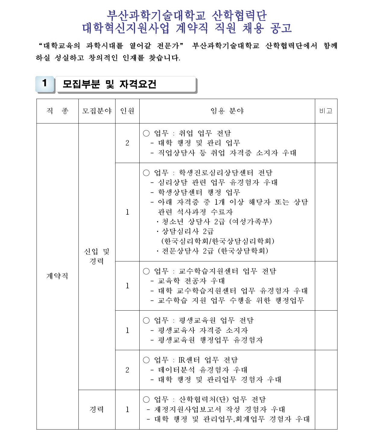 HOME > 기타 > 입찰/채용 입찰/채용 제목 [채용] 산학협력단 대학혁신지원사업 계약직 직원 채용 공고 등록일 2022.04.25 10:12:49 작성자 행정지원처 첨부파일 1-2. 공고문(계약직).pdf [192.69 KB]1-3. 이력서 및 자기소개서(계약직).hwp [22.00 KB] 조회 1915 이전글 [채용] 부산과학기술대학교 계약직 직원 채용 공고 (영선) 다음글 [채용] 대학 중소기업계약학과사업 전담 계약직 직원 채용 공고 목록 비밀글 비밀번호 입력 폼 비밀번호 입력 비밀번호를 입력하여 주세요. 관리자는 확인버튼만 누르시면 됩니다. 비밀번호 잘못된 비밀번호입니다. 비밀번호를 다시 입력해주세요. 확인