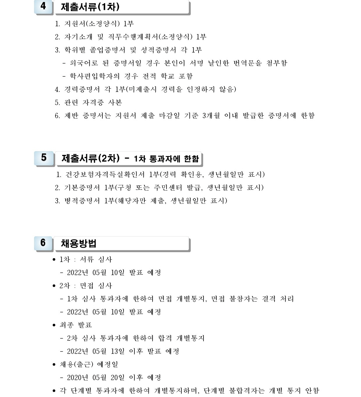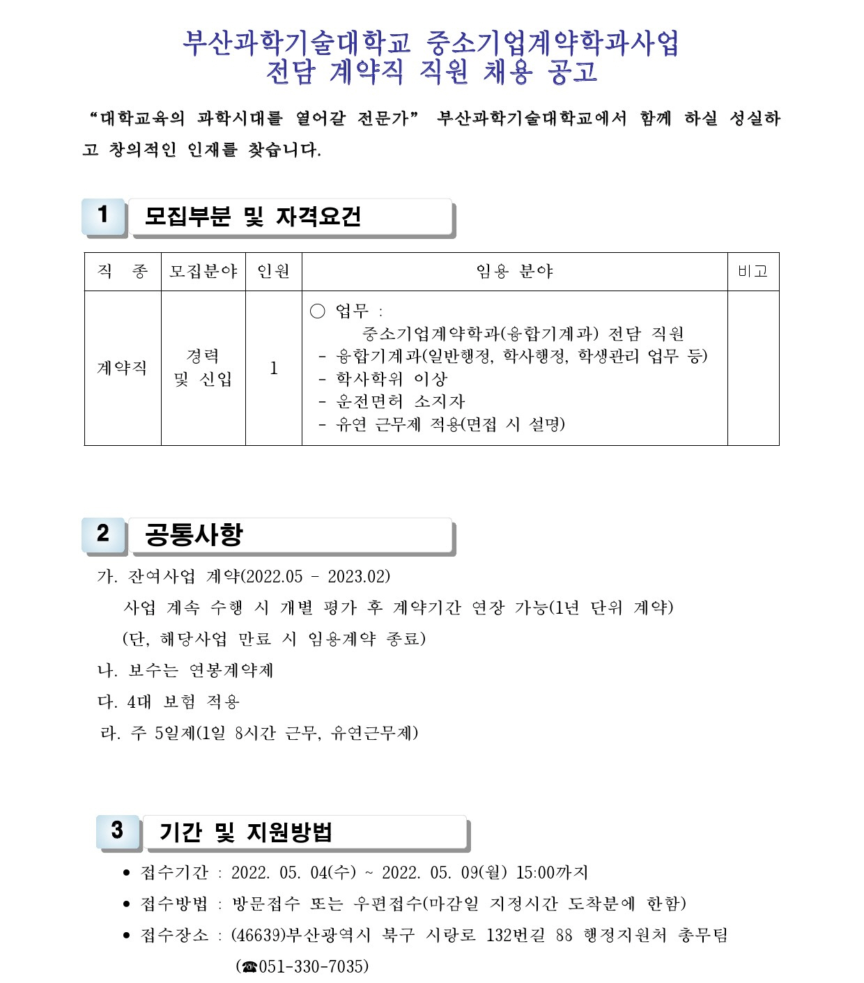 HOME > 기타 > 입찰/채용 입찰/채용 제목 [채용] 대학 중소기업계약학과사업 전담 계약직 직원 채용 공고 등록일 2022.04.25 10:13:41 작성자 행정지원처 첨부파일 1-2. 공고문(계약직).pdf [179.56 KB]1-3. 지원서 및 자기소개서(계약직).hwp [21.50 KB] 조회 1803 이전글 [채용] 산학협력단 대학혁신지원사업 계약직 직원 채용 공고 다음글 [채용] 산학협력단 듀얼공동훈련센터(일학습병행제사업) 전담 계약직 직원 채용 목록 비밀글 비밀번호 입력 폼 비밀번호 입력 비밀번호를 입력하여 주세요. 관리자는 확인버튼만 누르시면 됩니다. 비밀번호 잘못된 비밀번호입니다. 비밀번호를 다시 입력해주세요. 확인