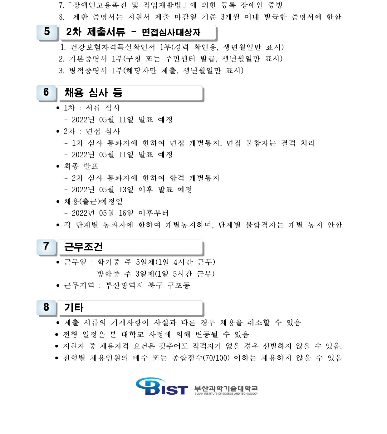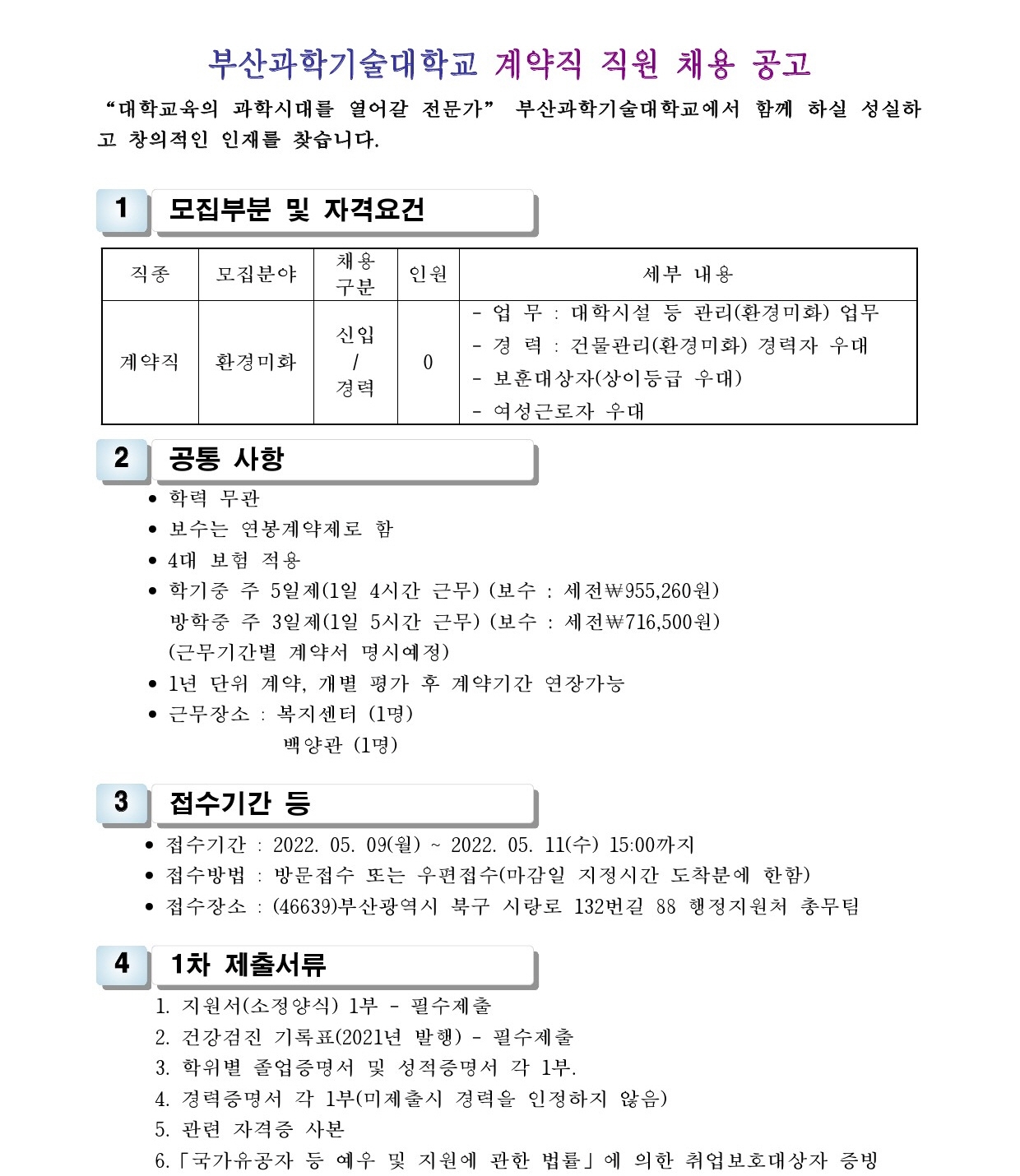 HOME > 기타 > 입찰/채용 입찰/채용 제목 [채용] 부산과학기술대학교 계약직 직원 채용 공고 (환경미화) 등록일 2022.05.04 10:53:48 작성자 행정지원처 첨부파일 1-2. 직원채용_외부공고.pdf [176.91 KB]1-3. 직원채용_지원서.hwp [20.00 KB] 조회 1841 이전글 [채용] 산학협력단 듀얼공동훈련센터(일학습병행제사업) 전담 계약직 직원 채용 다음글 [입찰] 학교법인 중앙학원 수익용 기본재산 부동산(토지) 매각 입찰 재공고(5) 목록 비밀글 비밀번호 입력 폼 비밀번호 입력 비밀번호를 입력하여 주세요. 관리자는 확인버튼만 누르시면 됩니다. 비밀번호 잘못된 비밀번호입니다. 비밀번호를 다시 입력해주세요. 확인