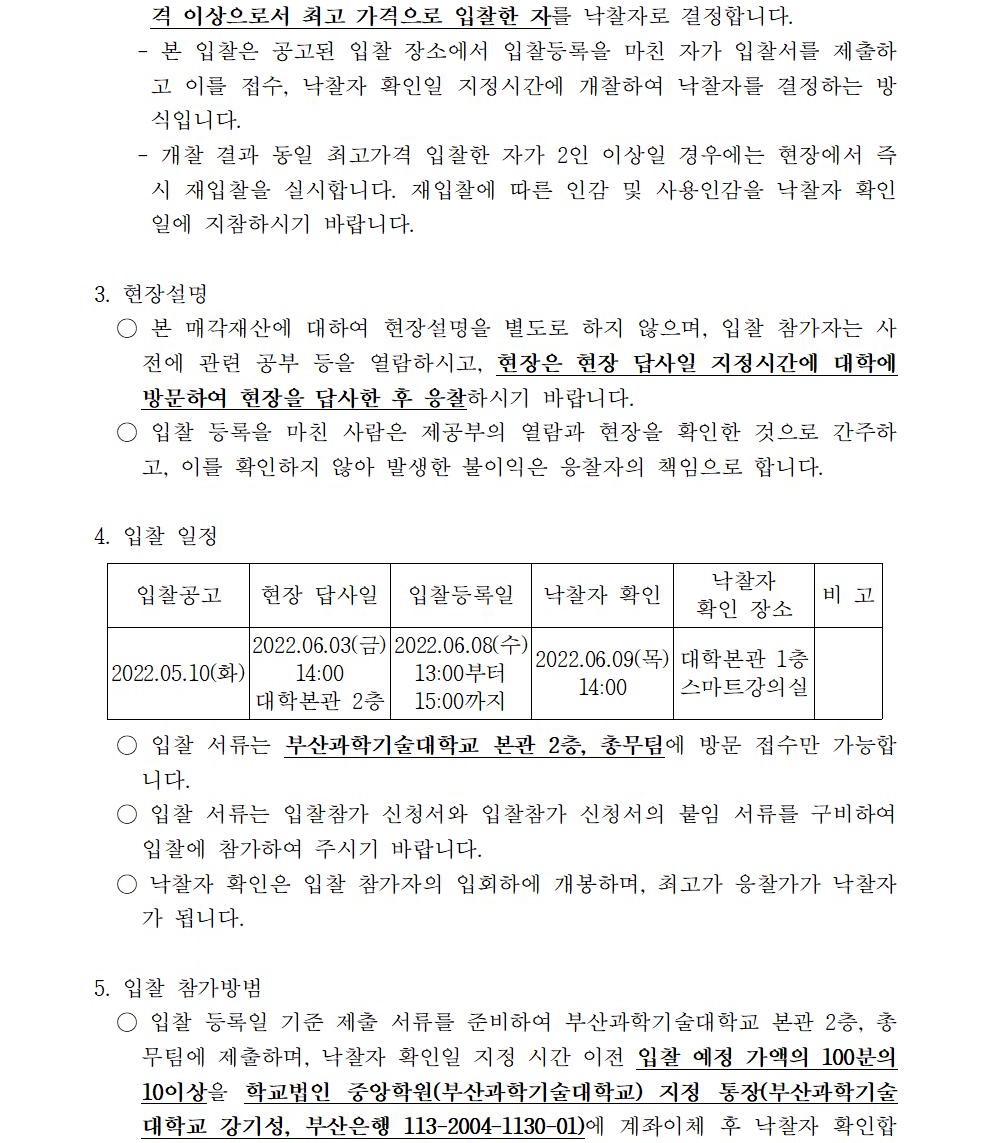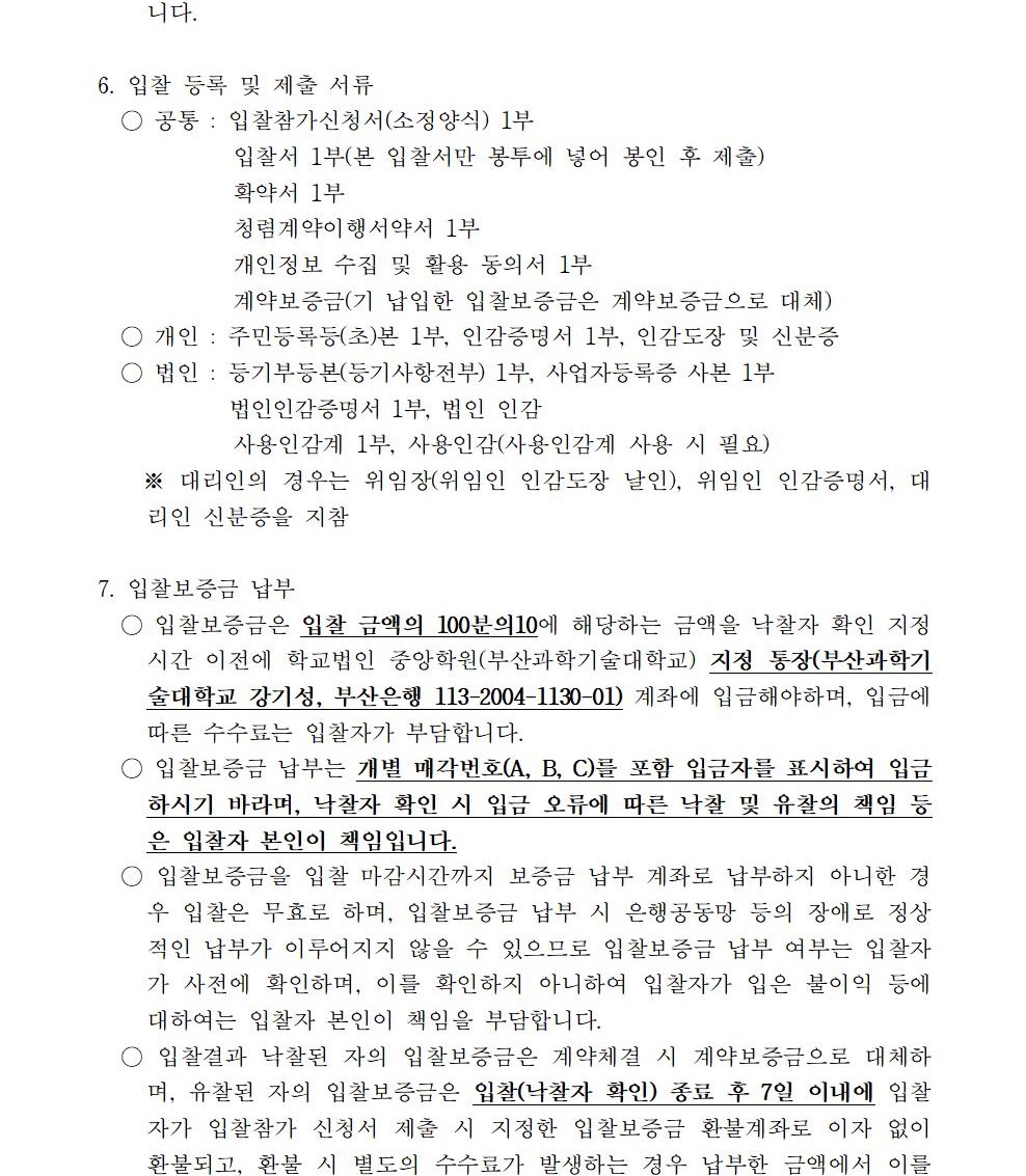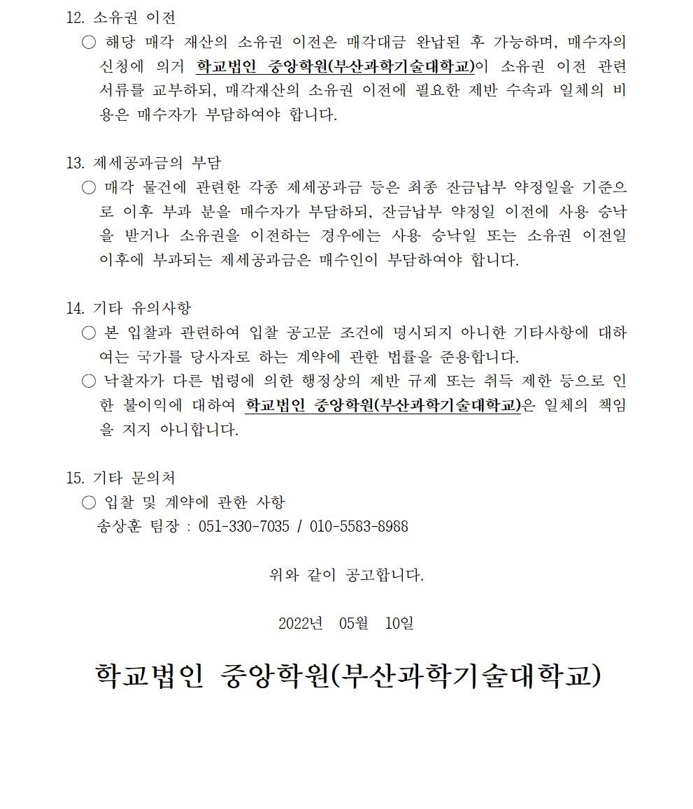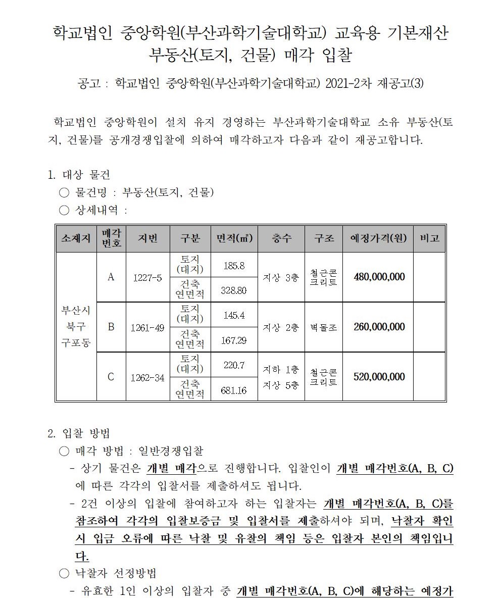 HOME > 기타 > 입찰/채용 입찰/채용 제목 [입찰] 학교법인 중앙학원(부산과학기술대학교) 교육용 기본재산 부동산(토지, 건물) 매각 입찰 재공고(2차-3) 등록일 2022.05.10 16:05:43 작성자 행정지원처 첨부파일 붙임1 매각공고문.pdf [76.11 KB]붙임9. 입찰참가 서류 양식(21-1)-재공고(5).zip [723.59 KB] 조회 1791 이전글 [입찰] 학교법인 중앙학원 수익용 기본재산 부동산(토지) 매각 입찰 재공고(5) 다음글 [채용] 부산과학기술대학교 계약직 직원 채용 공고 (환경미화) (추가) 목록 비밀글 비밀번호 입력 폼 비밀번호 입력 비밀번호를 입력하여 주세요. 관리자는 확인버튼만 누르시면 됩니다. 비밀번호 잘못된 비밀번호입니다. 비밀번호를 다시 입력해주세요. 확인