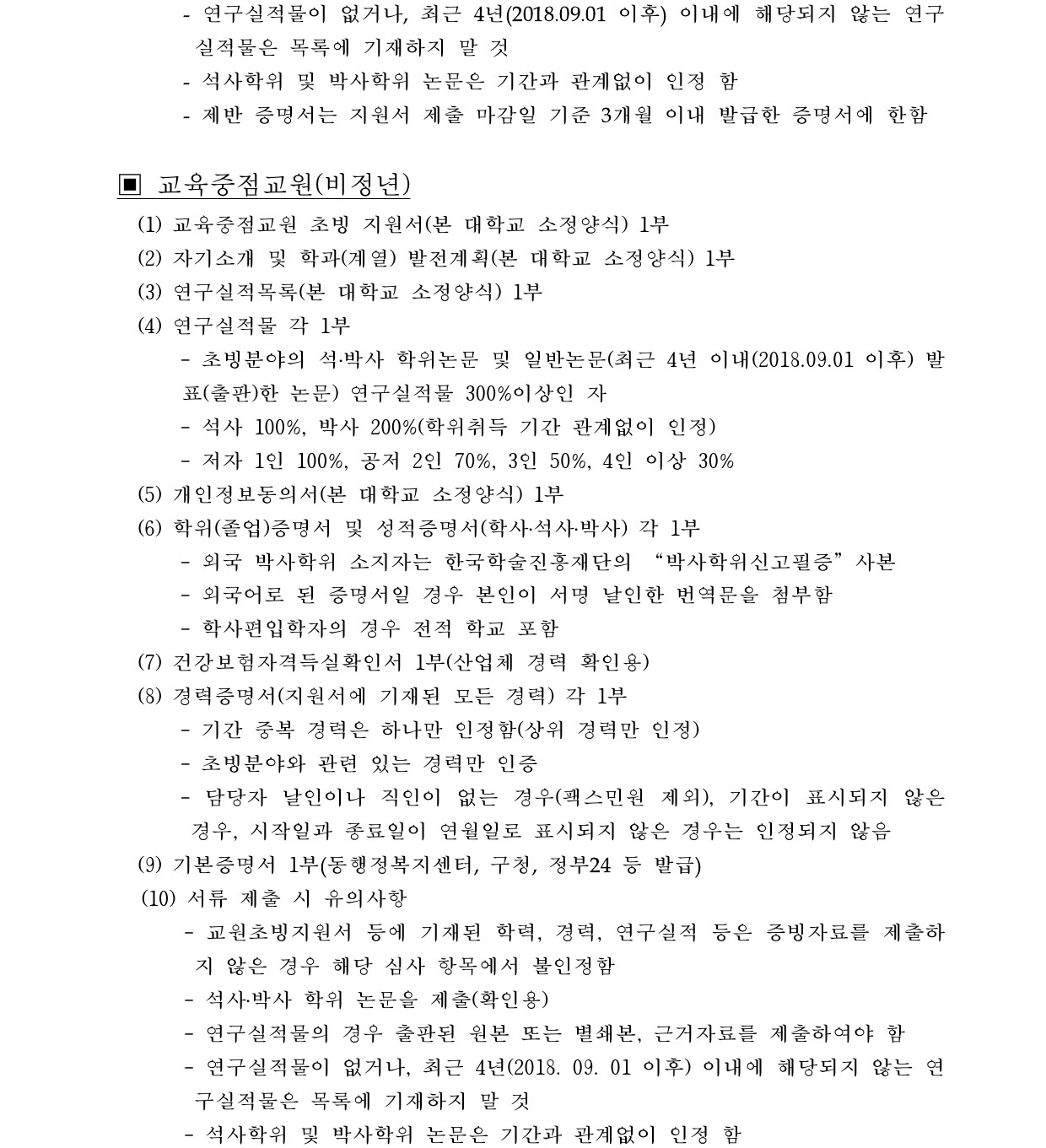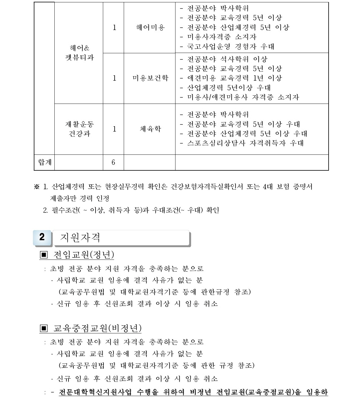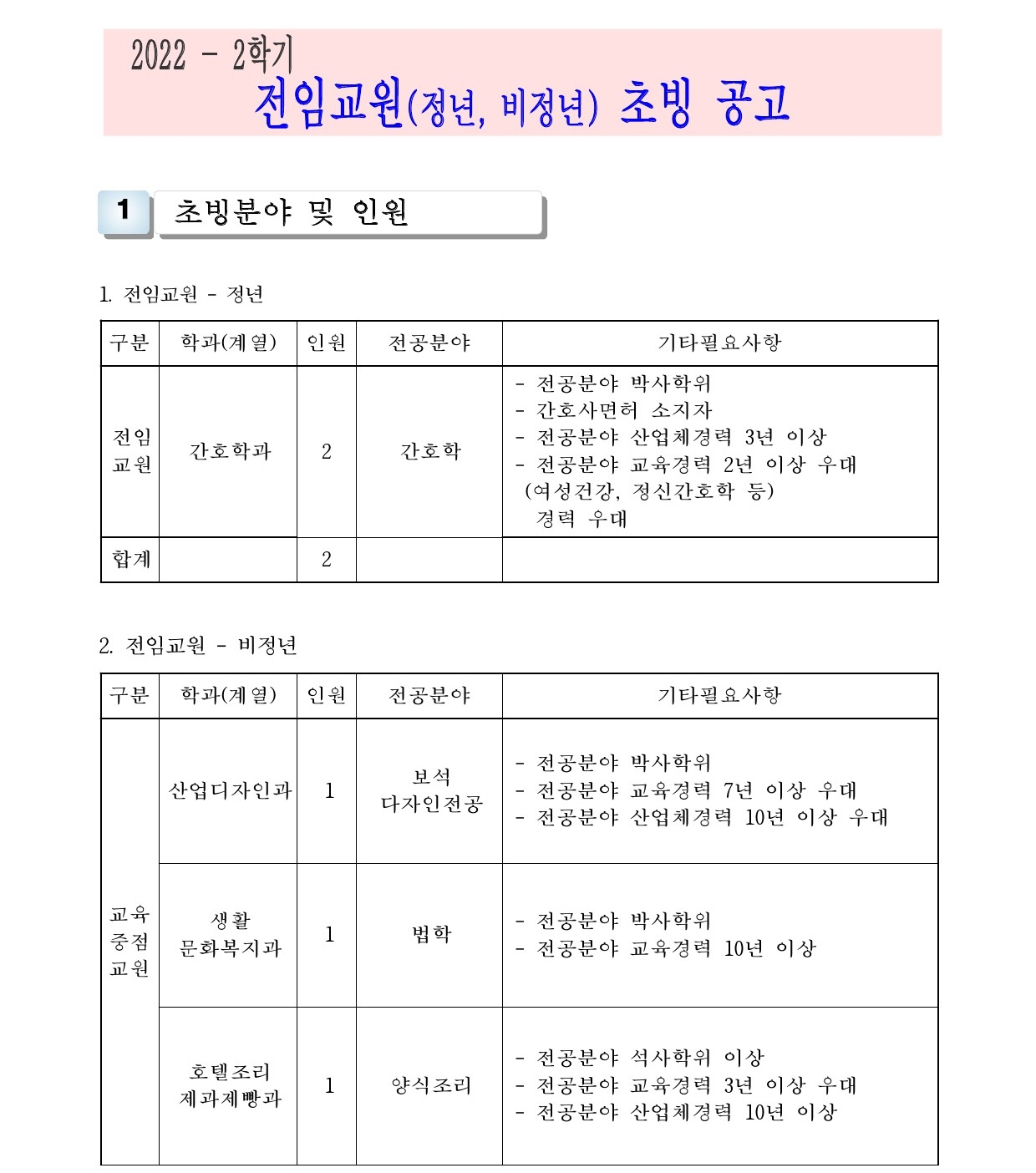 HOME > 기타 > 입찰/채용 입찰/채용 제목 [채용] 2022학년도 2학기 전임교원(정년, 비정년) 초빙 공고 등록일 2022.06.02 09:06:44 작성자 행정지원처 첨부파일 1-1-3-가. 신규임용계획(공고문).pdf [191.80 KB]1-1-3-가. 내외부공고-첨부서류.zip [211.35 KB] 조회 2105 이전글 [채용] 산학협력단 전문대학 혁신지원사업 사업전담 연구교수 채용 공고 다음글 [채용] 2022학년도 2학기 비전임 교원(겸임교원) 초빙 공고 목록 비밀글 비밀번호 입력 폼 비밀번호 입력 비밀번호를 입력하여 주세요. 관리자는 확인버튼만 누르시면 됩니다. 비밀번호 잘못된 비밀번호입니다. 비밀번호를 다시 입력해주세요. 확인