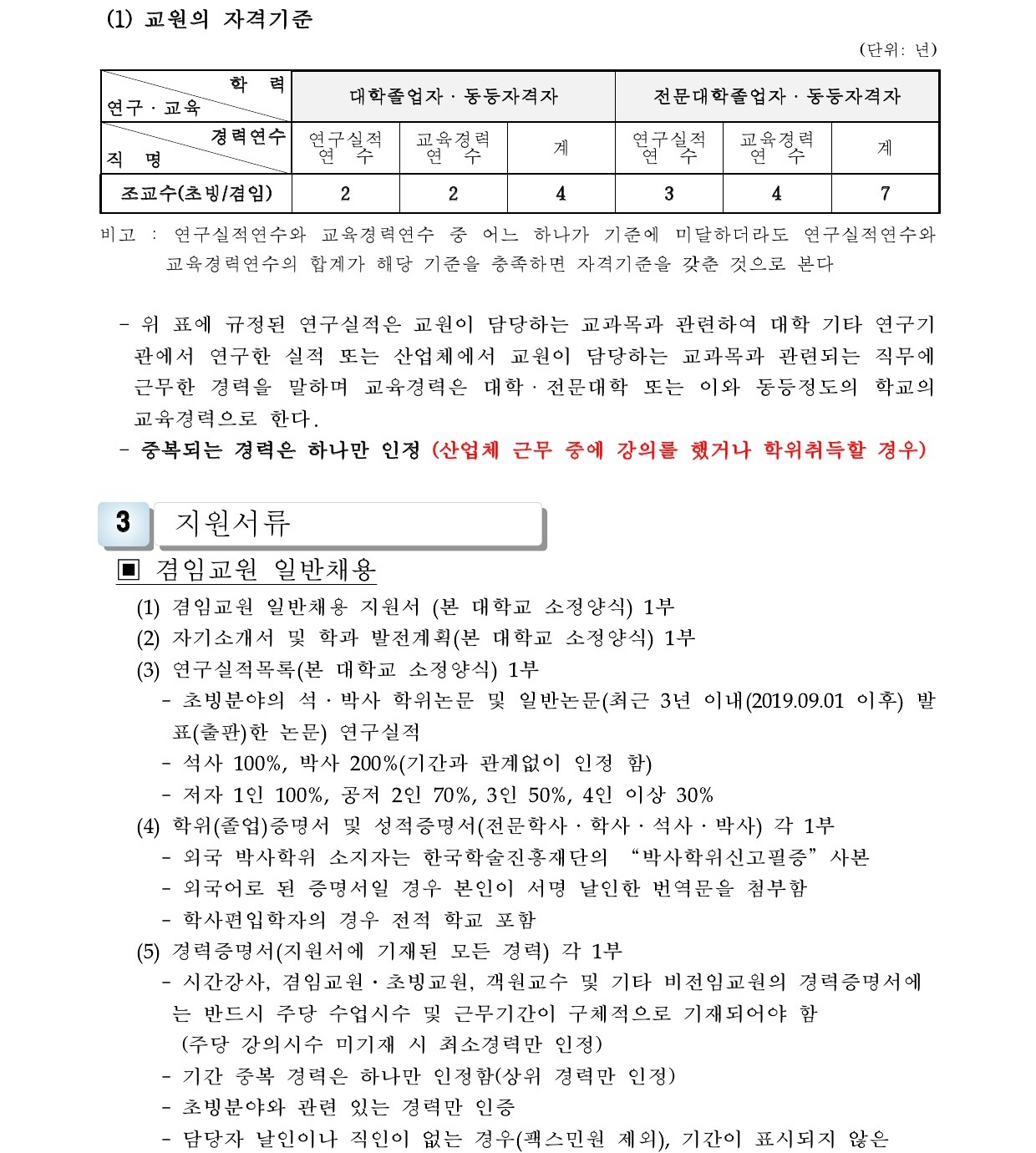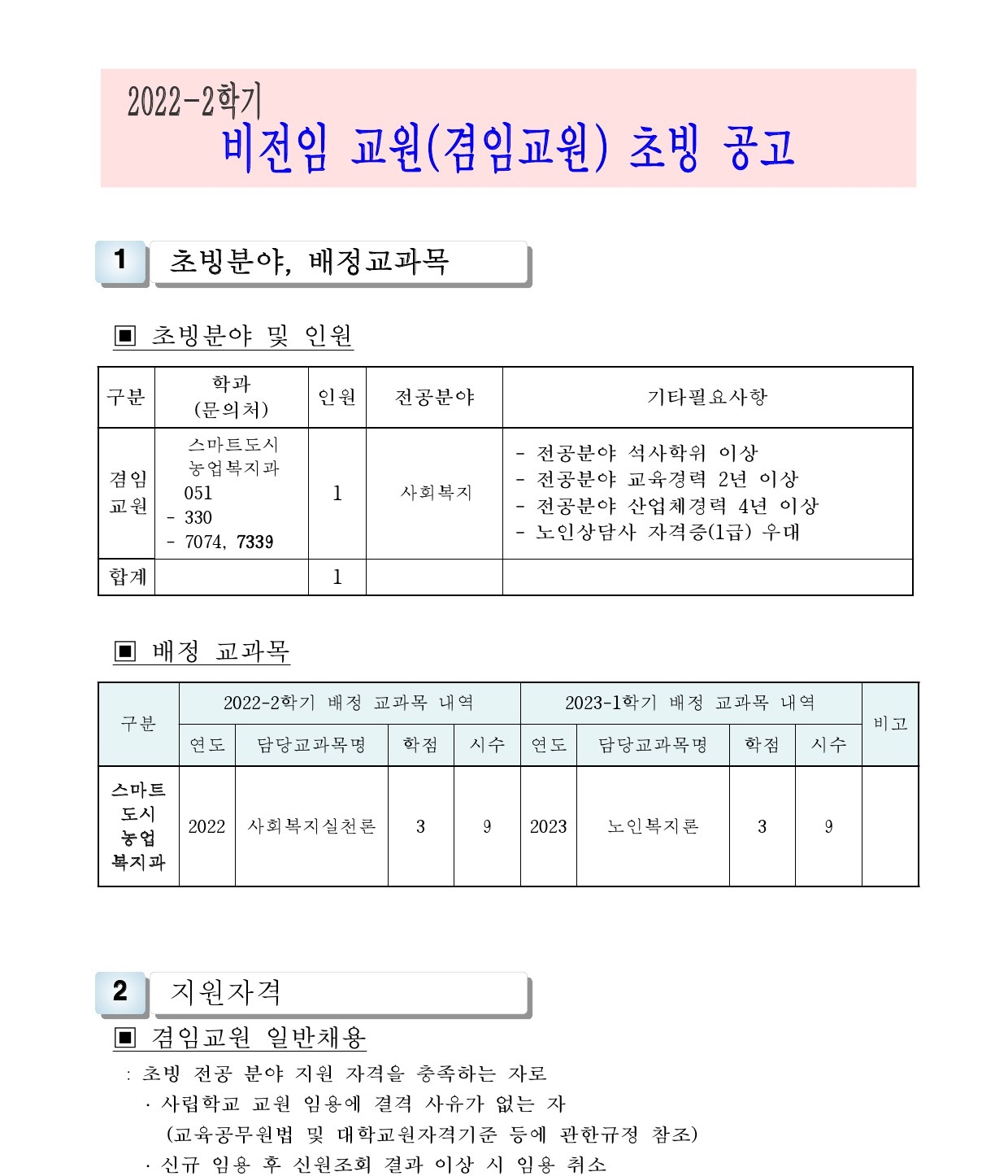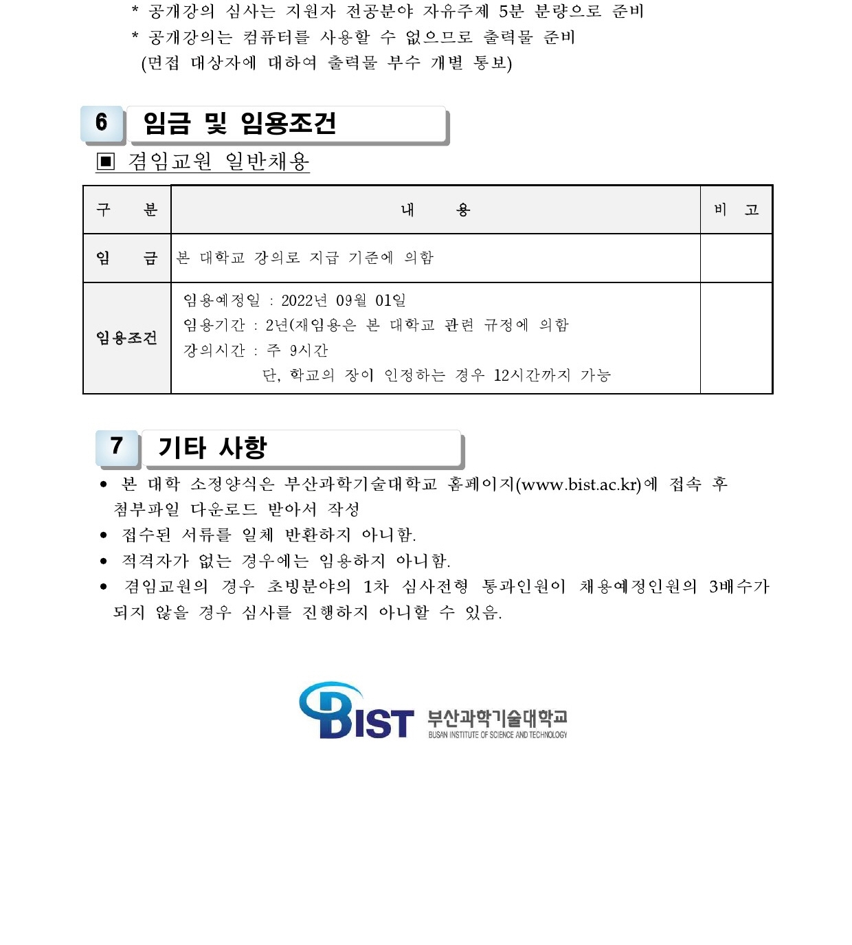 HOME > 기타 > 입찰/채용 입찰/채용 제목 [채용] 2022학년도 2학기 비전임 교원(겸임교원) 초빙 공고 등록일 2022.06.02 09:16:50 작성자 행정지원처 첨부파일 1-1-3-가. 신규임용계획(공고문).pdf [208.56 KB]1-1-4. 겸임교원 일반채용 구비서류.zip [62.18 KB] 조회 2159 이전글 [채용] 2022학년도 2학기 전임교원(정년, 비정년) 초빙 공고 다음글 [채용] 부산과학기술대학교 계약직 직원 채용 공고 (환경미화) (추가) 목록 비밀글 비밀번호 입력 폼 비밀번호 입력 비밀번호를 입력하여 주세요. 관리자는 확인버튼만 누르시면 됩니다. 비밀번호 잘못된 비밀번호입니다. 비밀번호를 다시 입력해주세요. 확인