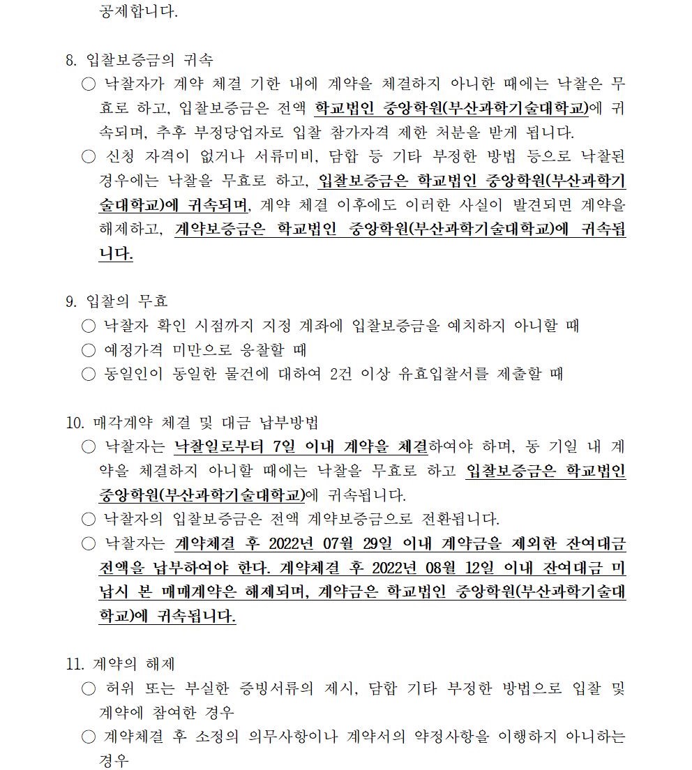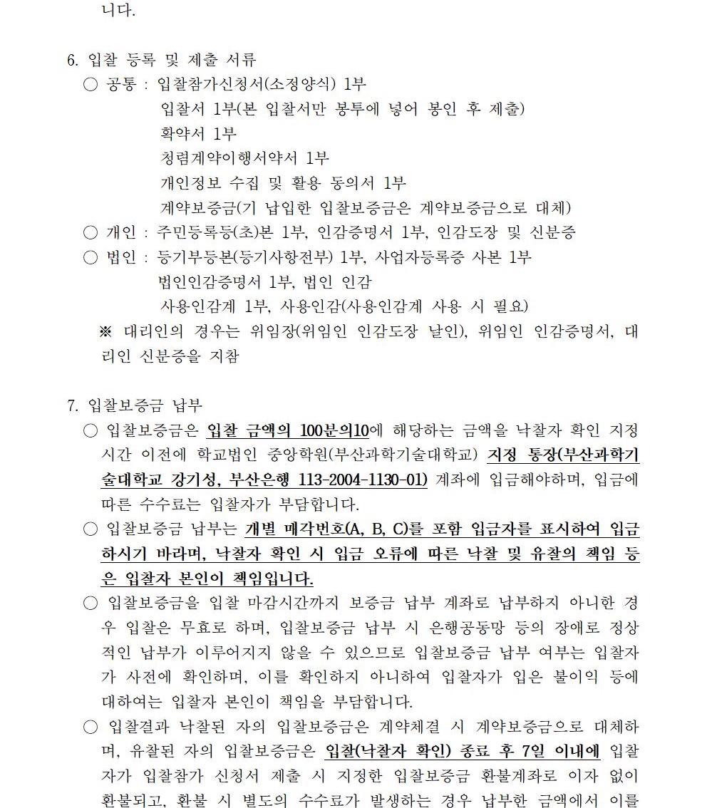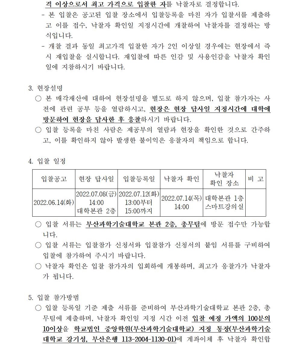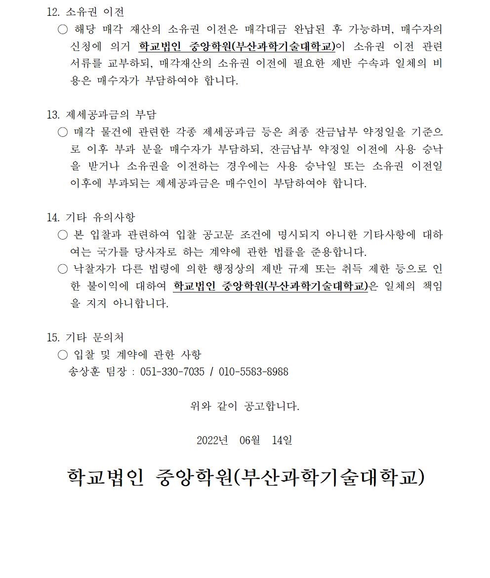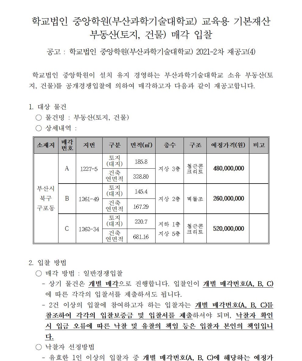 HOME > 기타 > 입찰/채용 입찰/채용 제목 [입찰] 학교법인 중앙학원(부산과학기술대학교) 교육용 기본재산 부동산(토지, 건물) 매각 입찰 재공고(2차-4) 등록일 2022.06.14 14:06:42 작성자 행정지원처 첨부파일 붙임1 매각공고문(2차-재공고(4)).pdf [82.38 KB]붙임9. 입찰참가 서류 양식(2차 재공고(4)).zip [7.26 MB] 조회 1671 이전글 [채용] 부산과학기술대학교 일반행정 계약직 직원 채용 공고 다음글 [채용] 산학협력단 기술사관육성사업 전담 계약직 직원 채용 목록 비밀글 비밀번호 입력 폼 비밀번호 입력 비밀번호를 입력하여 주세요. 관리자는 확인버튼만 누르시면 됩니다. 비밀번호 잘못된 비밀번호입니다. 비밀번호를 다시 입력해주세요. 확인
