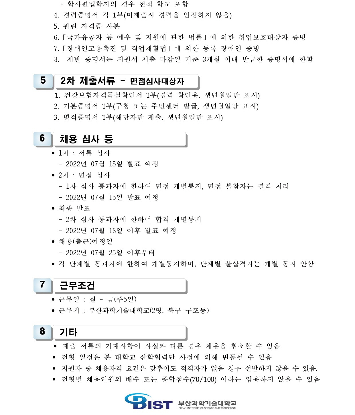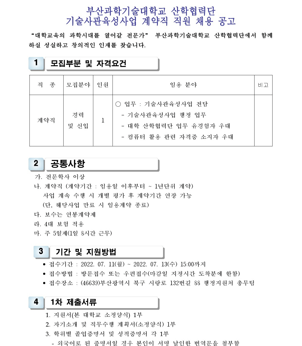 HOME > 기타 > 입찰/채용 입찰/채용 제목 [채용] 산학협력단 기술사관육성사업 전담 계약직 직원 채용 등록일 2022.07.04 09:07:11 작성자 행정지원처 첨부파일 1-2. 공고문(계약직).pdf [185.02 KB]1-3. 지원서 및 자기소개서(계약직).hwp [20.50 KB] 조회 1726 이전글 [입찰] 학교법인 중앙학원(부산과학기술대학교) 교육용 기본재산 부동산(토지, 건물) 매각 입찰 재공고(2차-4) 다음글 [채용] 산학협력단 대학혁신지원사업 계약직 직원 채용 공고 목록 비밀글 비밀번호 입력 폼 비밀번호 입력 비밀번호를 입력하여 주세요. 관리자는 확인버튼만 누르시면 됩니다. 비밀번호 잘못된 비밀번호입니다. 비밀번호를 다시 입력해주세요. 확인