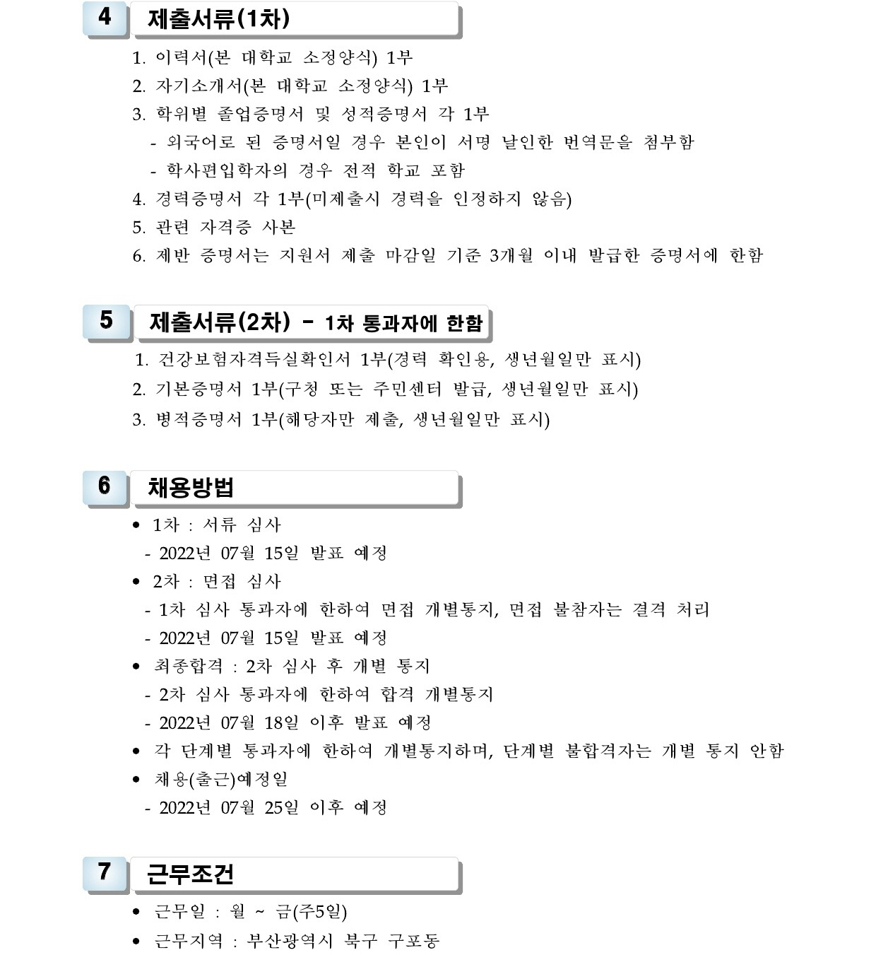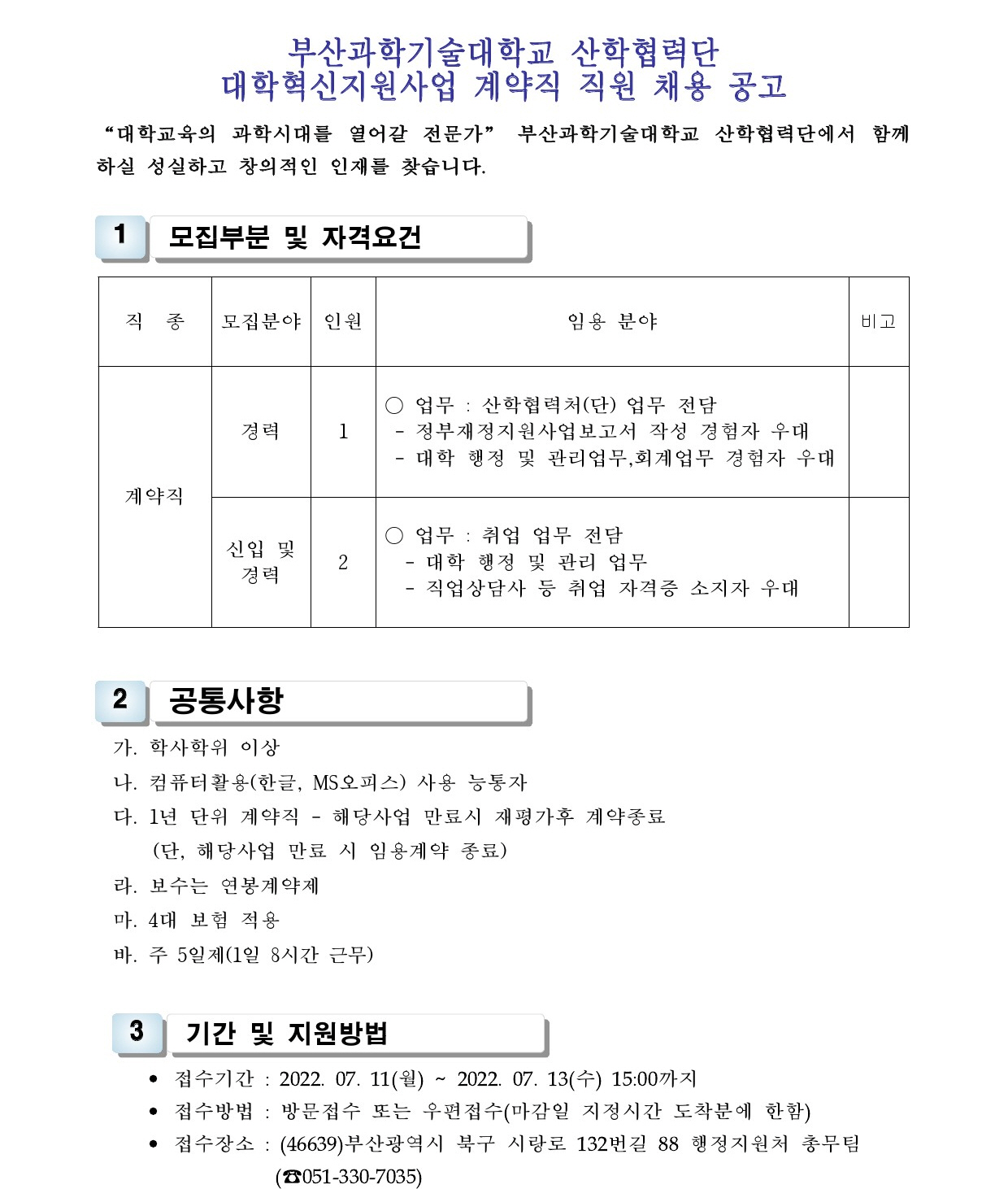 HOME > 기타 > 입찰/채용 입찰/채용 제목 [채용] 산학협력단 대학혁신지원사업 계약직 직원 채용 공고 등록일 2022.07.04 09:07:02 작성자 행정지원처 첨부파일 1-2. 공고문(계약직).pdf [185.20 KB]1-3. 이력서 및 자기소개서(계약직).hwp [22.00 KB] 조회 1753 이전글 [채용] 산학협력단 기술사관육성사업 전담 계약직 직원 채용 다음글 [채용] 3단계 산학연협력선도 (LINC 3.0) 계약직 직원 채용 공고 목록 비밀글 비밀번호 입력 폼 비밀번호 입력 비밀번호를 입력하여 주세요. 관리자는 확인버튼만 누르시면 됩니다. 비밀번호 잘못된 비밀번호입니다. 비밀번호를 다시 입력해주세요. 확인