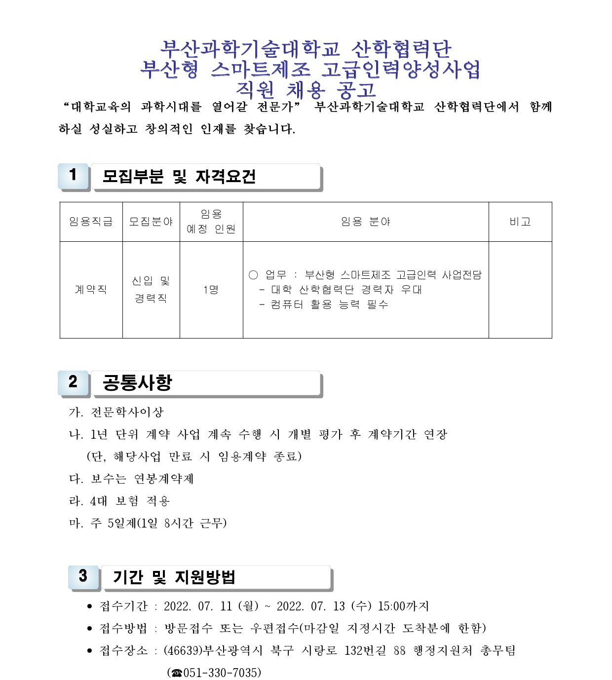 HOME > 기타 > 입찰/채용 입찰/채용 제목 [채용] 산학협력단 부산형 스마트제조 고급인력양성사업 계약직 직원 채용 공고 등록일 2022.07.04 09:07:03 작성자 행정지원처 첨부파일 1-3. 지원서 및 자기소개서(계약직).hwp [21.50 KB]1-2. 공고문(계약직).pdf [182.17 KB] 조회 1754 이전글 [채용] 3단계 산학연협력선도 (LINC 3.0) 계약직 직원 채용 공고 다음글 [채용] 산학협력단 전문대학 혁신지원사업 사업전담 연구교수 채용 공고 목록 비밀글 비밀번호 입력 폼 비밀번호 입력 비밀번호를 입력하여 주세요. 관리자는 확인버튼만 누르시면 됩니다. 비밀번호 잘못된 비밀번호입니다. 비밀번호를 다시 입력해주세요. 확인