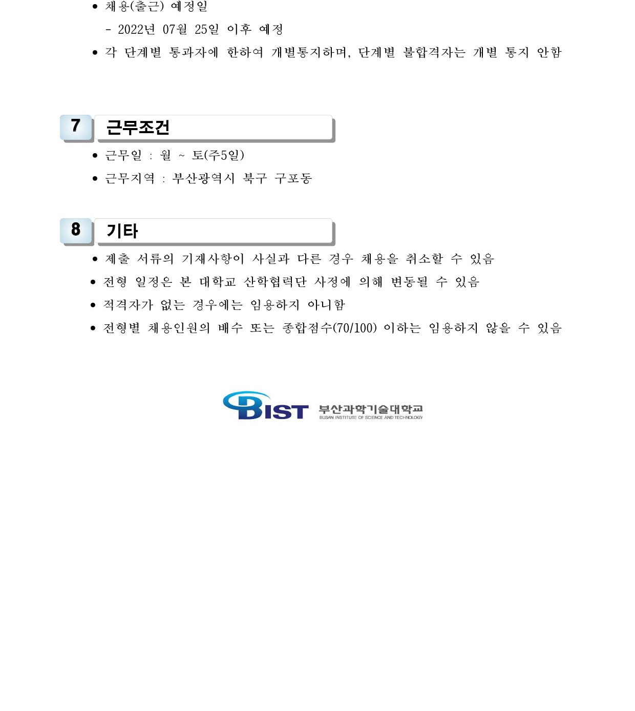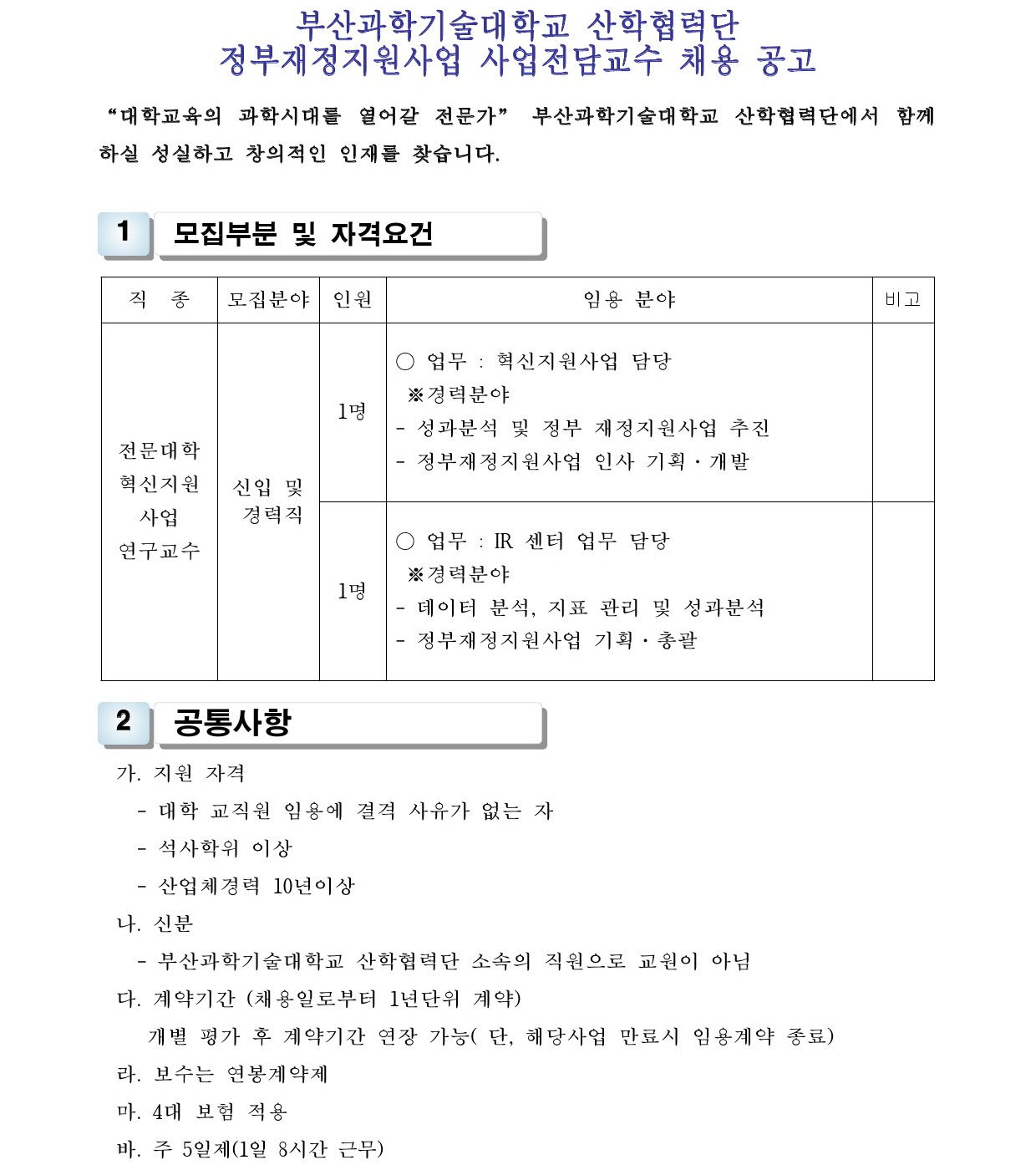 HOME > 기타 > 입찰/채용 입찰/채용 제목 [채용] 산학협력단 전문대학 혁신지원사업 사업전담 연구교수 채용 공고 등록일 2022.07.04 09:07:45 작성자 행정지원처 첨부파일 1-2. 공고문(계약직).pdf [181.59 KB]1-3. 지원서 및 자기소개서(계약직).hwp [21.50 KB] 조회 1855 이전글 [채용] 산학협력단 부산형 스마트제조 고급인력양성사업 계약직 직원 채용 공고 다음글 [채용] 부산과학기술대학교 일반행정 계약직 직원 채용 공고(추가) 목록 비밀글 비밀번호 입력 폼 비밀번호 입력 비밀번호를 입력하여 주세요. 관리자는 확인버튼만 누르시면 됩니다. 비밀번호 잘못된 비밀번호입니다. 비밀번호를 다시 입력해주세요. 확인