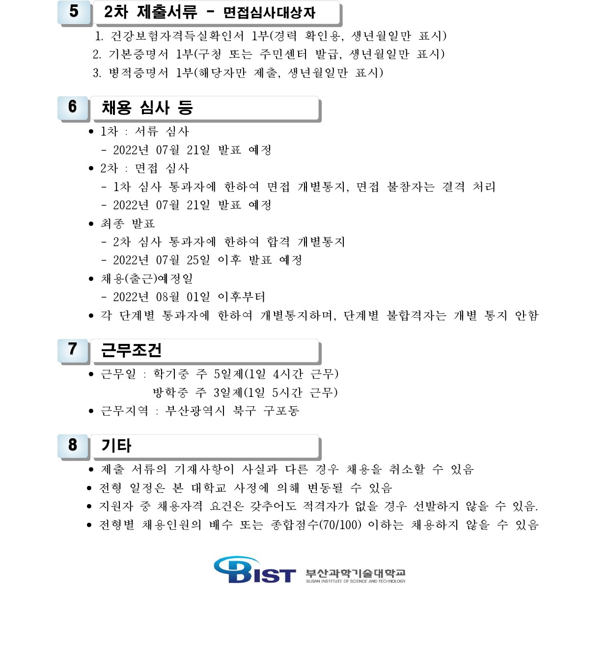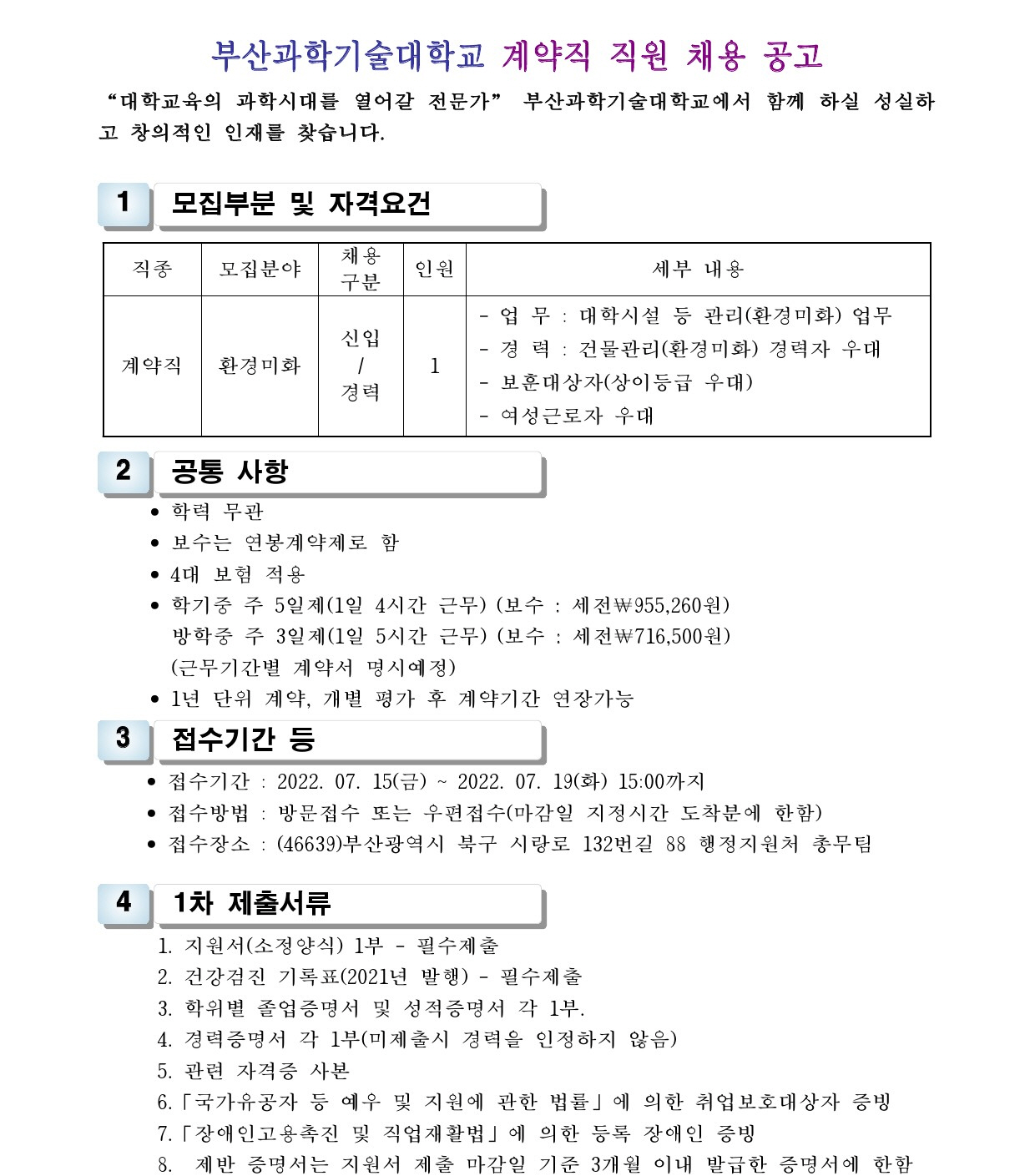 HOME > 기타 > 입찰/채용 입찰/채용 제목 [채용] 부산과학기술대학교 계약직 직원 채용 공고 (환경미화) (추가) 등록일 2022.07.11 08:07:23 작성자 행정지원처 첨부파일 1-2. 직원채용_외부공고.pdf [176.09 KB]1-3. 직원채용_지원서.hwp [20.00 KB] 조회 1685 이전글 [채용] 부산과학기술대학교 일반행정 계약직 직원 채용 공고(추가) 다음글 [채용] 부산과학기술대학교 계약직 직원 채용 공고 (영선) 목록 비밀글 비밀번호 입력 폼 비밀번호 입력 비밀번호를 입력하여 주세요. 관리자는 확인버튼만 누르시면 됩니다. 비밀번호 잘못된 비밀번호입니다. 비밀번호를 다시 입력해주세요. 확인