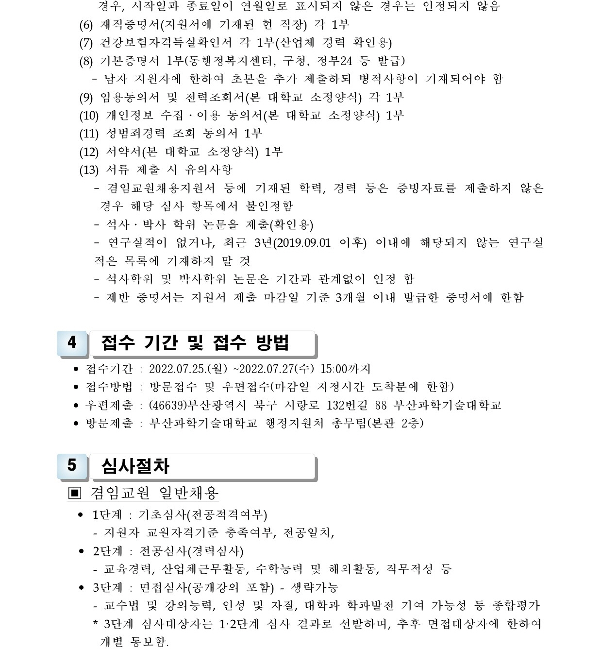 HOME > 기타 > 입찰/채용 입찰/채용 제목 [채용] 2022학년도 2학기 비전임 교원(겸임교원) 초빙 공고 (2차) 등록일 2022.07.19 11:07:23 작성자 행정지원처 첨부파일 1-1-4. 겸임교원 일반채용 구비서류.zip [62.18 KB]1-1-3-가. 신규임용계획(공고문).pdf [208.39 KB] 조회 1686 이전글 [채용] 2022학년도 2학기 교원(강사) 초빙 공고 다음글 [입찰] 학교법인 중앙학원(부산과학기술대학교) 교육용 기본재산 부동산(토지, 건물) 매각 입찰 재공고(2차-5) 목록 비밀글 비밀번호 입력 폼 비밀번호 입력 비밀번호를 입력하여 주세요. 관리자는 확인버튼만 누르시면 됩니다. 비밀번호 잘못된 비밀번호입니다. 비밀번호를 다시 입력해주세요. 확인