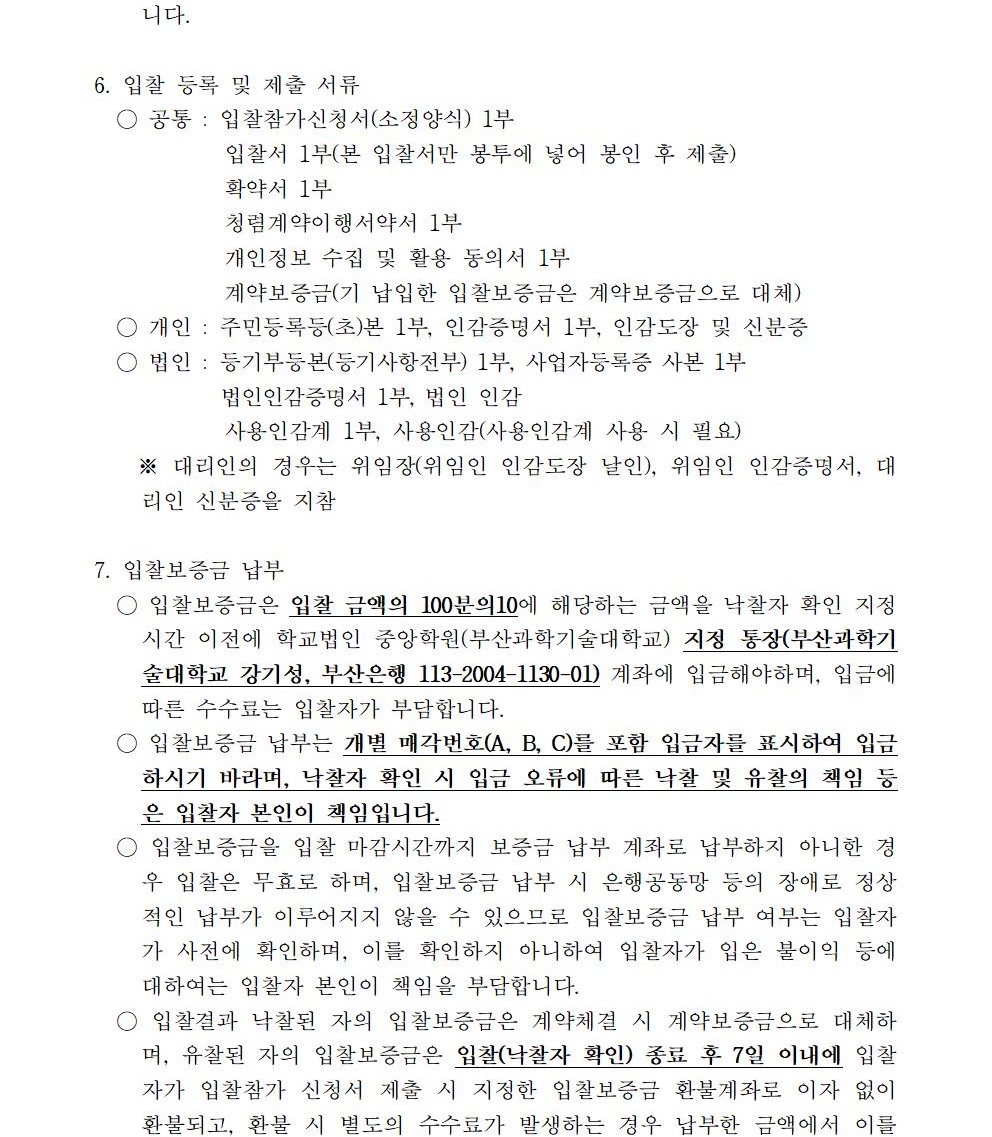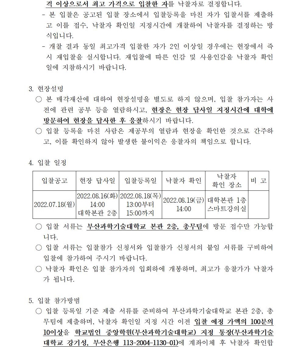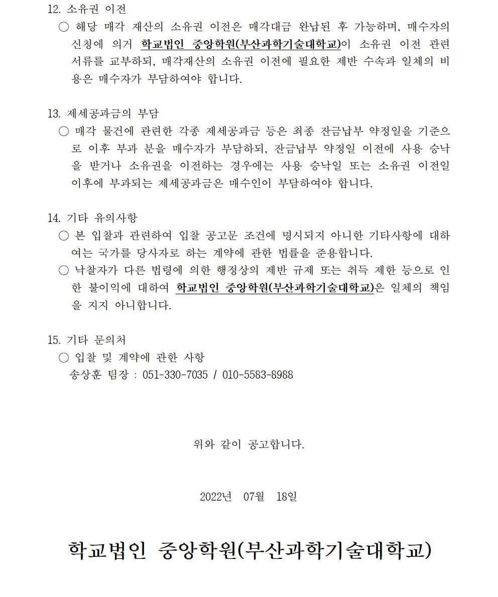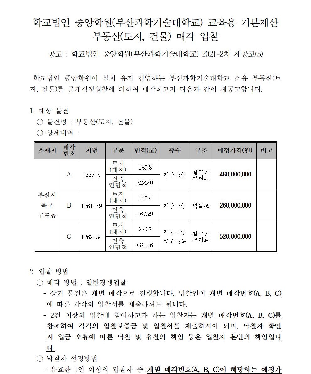 HOME > 기타 > 입찰/채용 입찰/채용 제목 [입찰] 학교법인 중앙학원(부산과학기술대학교) 교육용 기본재산 부동산(토지, 건물) 매각 입찰 재공고(2차-5) 등록일 2022.07.18 14:07:48 작성자 행정지원처 첨부파일 붙임1 매각공고문(2차-재공고(5)).pdf [82.40 KB]붙임9. 입찰참가 서류 양식(2차 재공고(5)).zip [7.26 MB] 조회 1728 이전글 [채용] 2022학년도 2학기 비전임 교원(겸임교원) 초빙 공고 (2차) 다음글 [채용] 산학협력단 기술사관육성사업 전담 계약직 직원 채용 목록 비밀글 비밀번호 입력 폼 비밀번호 입력 비밀번호를 입력하여 주세요. 관리자는 확인버튼만 누르시면 됩니다. 비밀번호 잘못된 비밀번호입니다. 비밀번호를 다시 입력해주세요. 확인