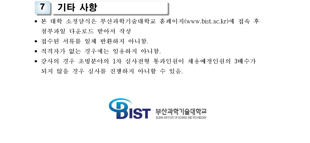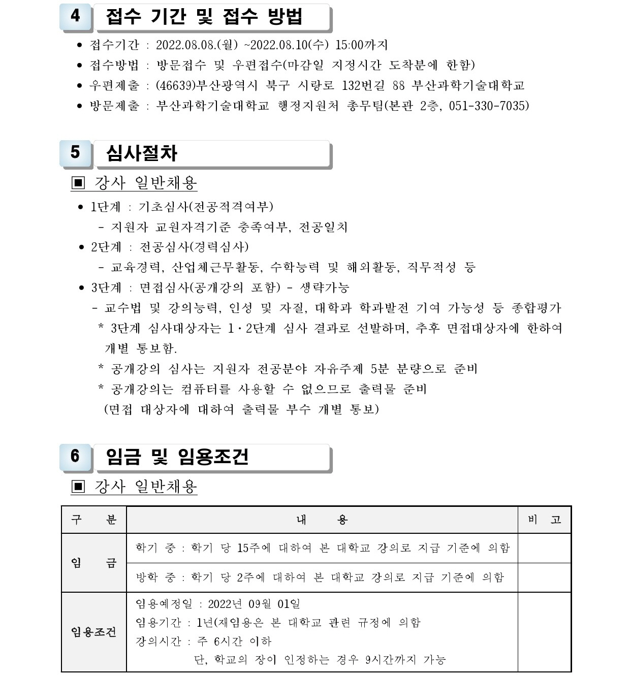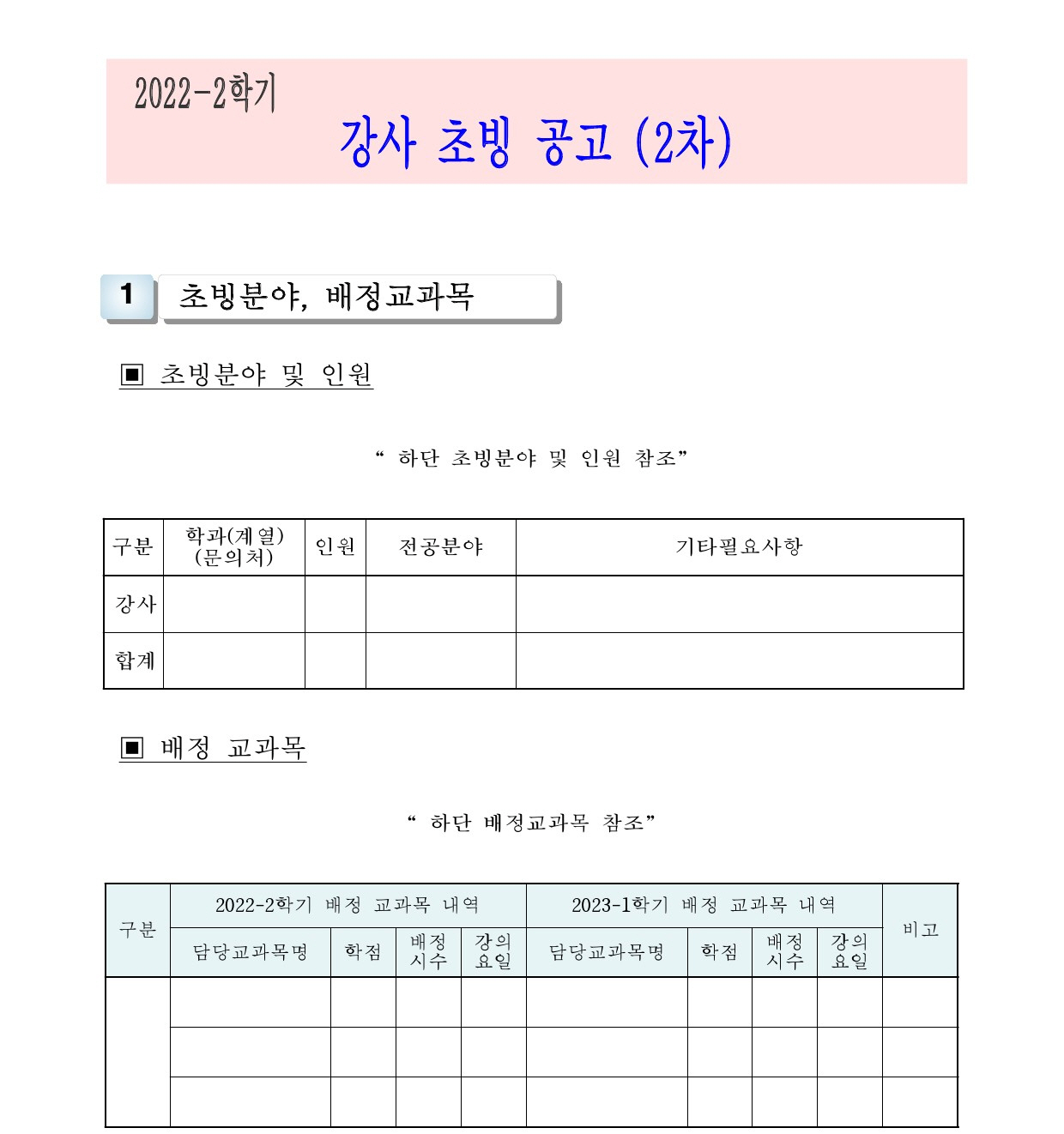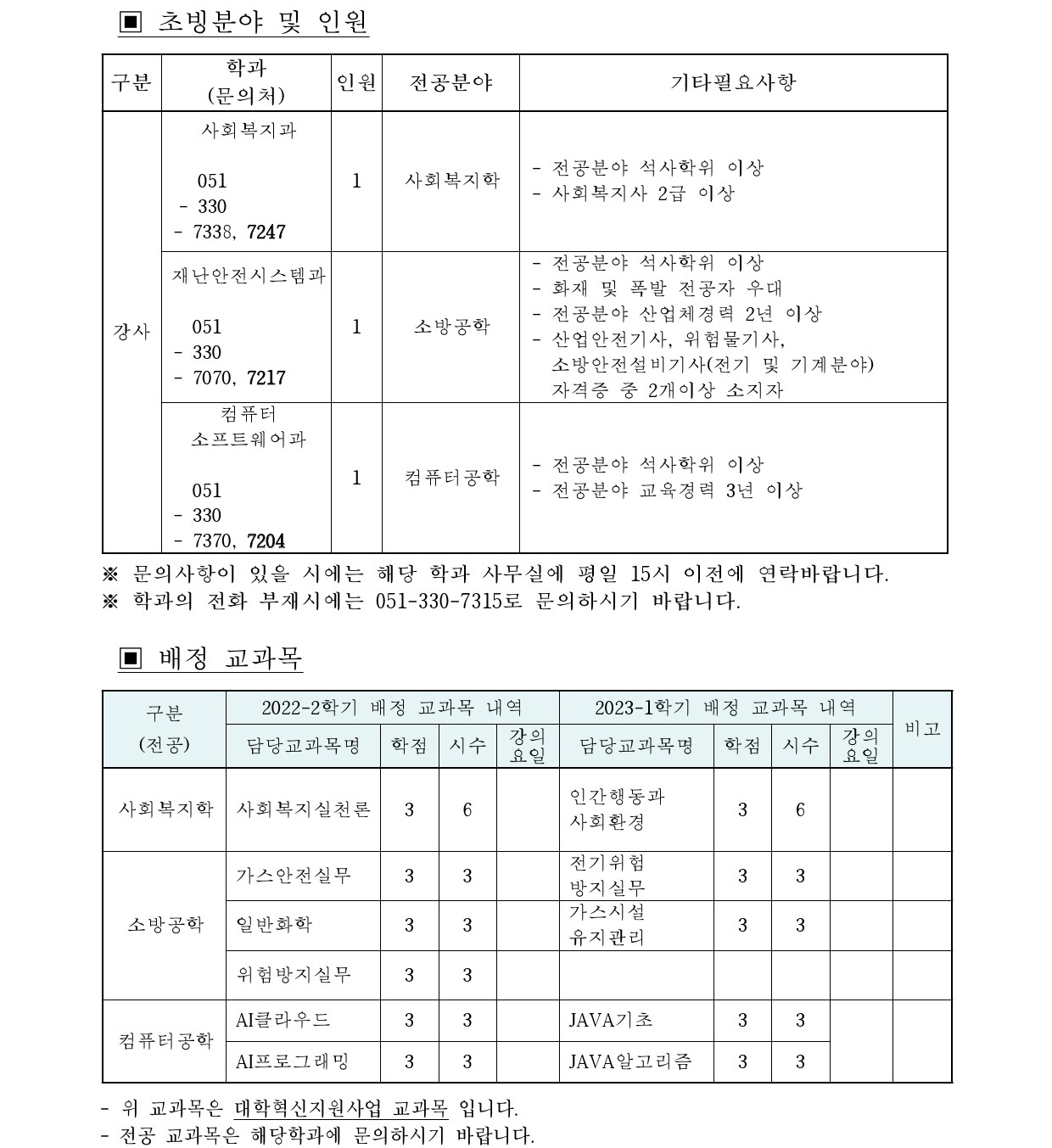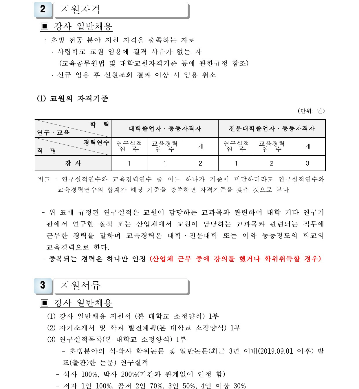 HOME > 기타 > 입찰/채용 입찰/채용 제목 [채용] 2022학년도 2학기 교원(강사) 초빙 공고 (2차) 등록일 2022.07.29 08:07:38 작성자 행정지원처 첨부파일 1-1-3-가-1. 강사신규임용계획(공고문).pdf [219.17 KB]1-1-5 강사 일반채용 구비서류.zip [54.43 KB] 조회 2115 이전글 [채용] 2022학년도 2학기 전임교원(정년) 초빙 공고 다음글 [채용] 산학협력단 대학혁신지원사업 계약직 직원 채용 공고 목록 비밀글 비밀번호 입력 폼 비밀번호 입력 비밀번호를 입력하여 주세요. 관리자는 확인버튼만 누르시면 됩니다. 비밀번호 잘못된 비밀번호입니다. 비밀번호를 다시 입력해주세요. 확인