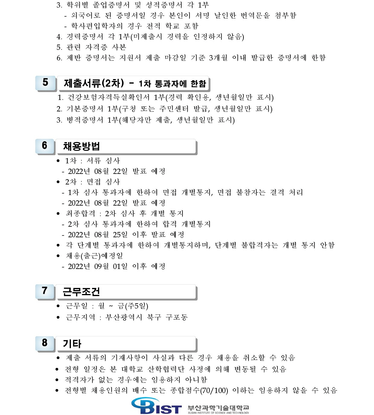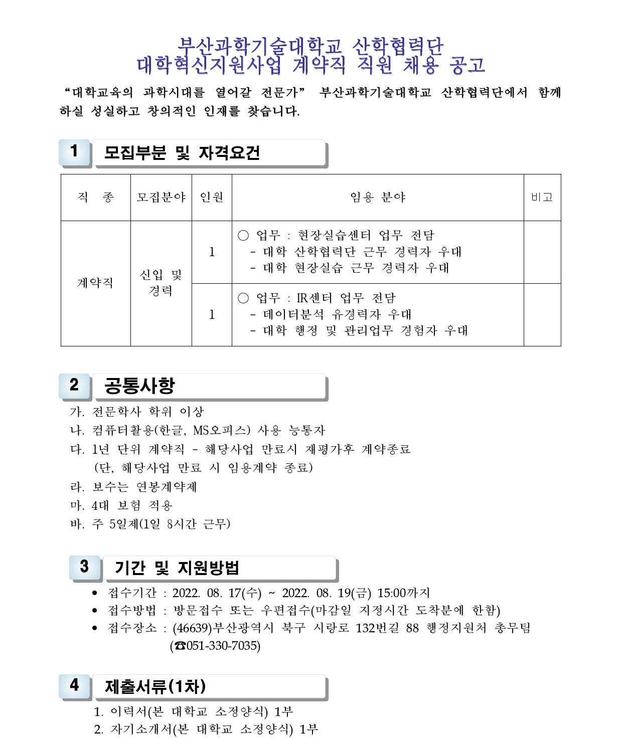 HOME > 기타 > 입찰/채용 입찰/채용 제목 [채용] 산학협력단 대학혁신지원사업 계약직 직원 채용 공고 등록일 2022.07.29 10:07:01 작성자 행정지원처 첨부파일 1-3. 이력서 및 자기소개서(계약직).hwp [22.50 KB]1-2. 공고문(계약직).pdf [184.63 KB] 조회 1555 이전글 [채용] 2022학년도 2학기 교원(강사) 초빙 공고 (2차) 다음글 [채용] 산학협력단 조기취업형 계약학과사업 전담 계약직 직원 채용 공고 목록 비밀글 비밀번호 입력 폼 비밀번호 입력 비밀번호를 입력하여 주세요. 관리자는 확인버튼만 누르시면 됩니다. 비밀번호 잘못된 비밀번호입니다. 비밀번호를 다시 입력해주세요. 확인