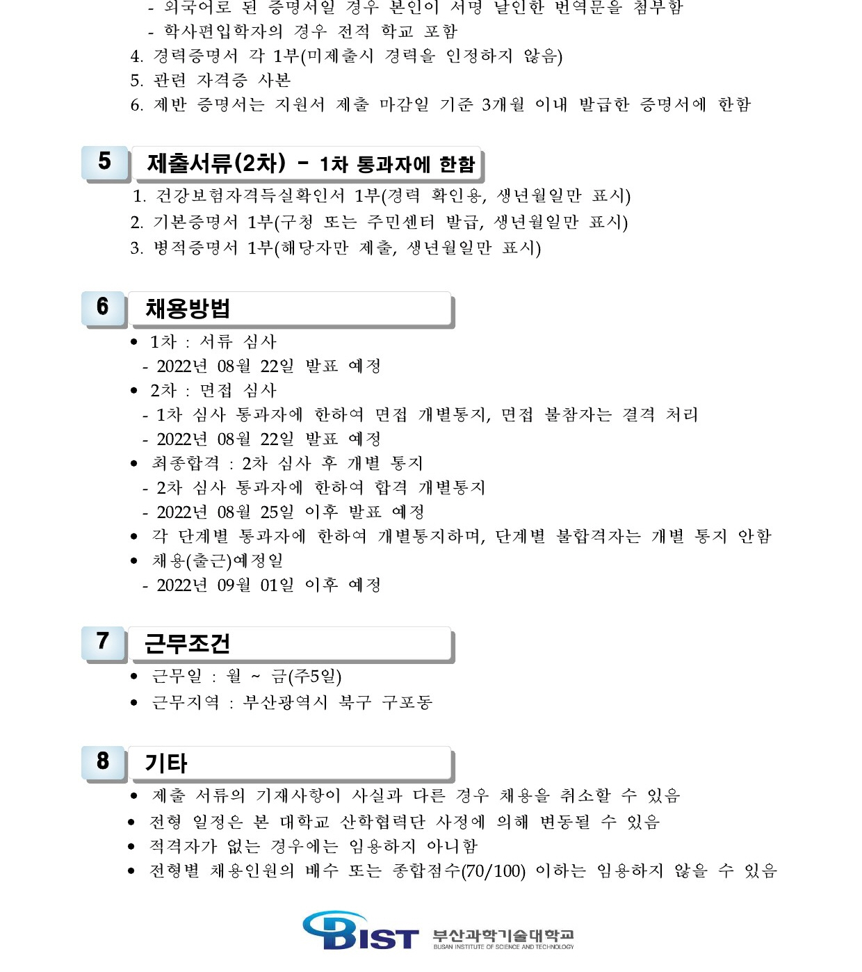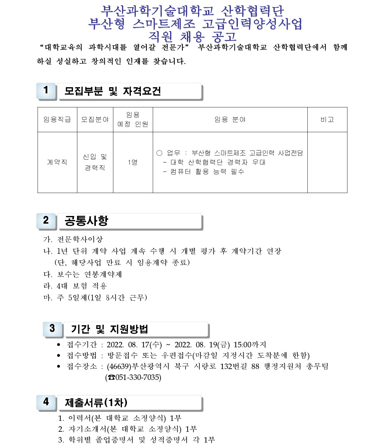 HOME > 기타 > 입찰/채용 입찰/채용 제목 [채용] 산학협력단 부산형 스마트제조 고급인력양성사업 계약직 직원 채용 공고 등록일 2022.07.29 10:07:16 작성자 행정지원처 첨부파일 1-3. 지원서 및 자기소개서(계약직).hwp [21.50 KB]1-2. 공고문(계약직).pdf [195.16 KB] 조회 1591 이전글 [채용] 산학협력단 조기취업형 계약학과사업 전담 계약직 직원 채용 공고 다음글 [채용] 산학협력단 전문대학 혁신지원사업 사업전담 연구교수 채용 공고 목록 비밀글 비밀번호 입력 폼 비밀번호 입력 비밀번호를 입력하여 주세요. 관리자는 확인버튼만 누르시면 됩니다. 비밀번호 잘못된 비밀번호입니다. 비밀번호를 다시 입력해주세요. 확인