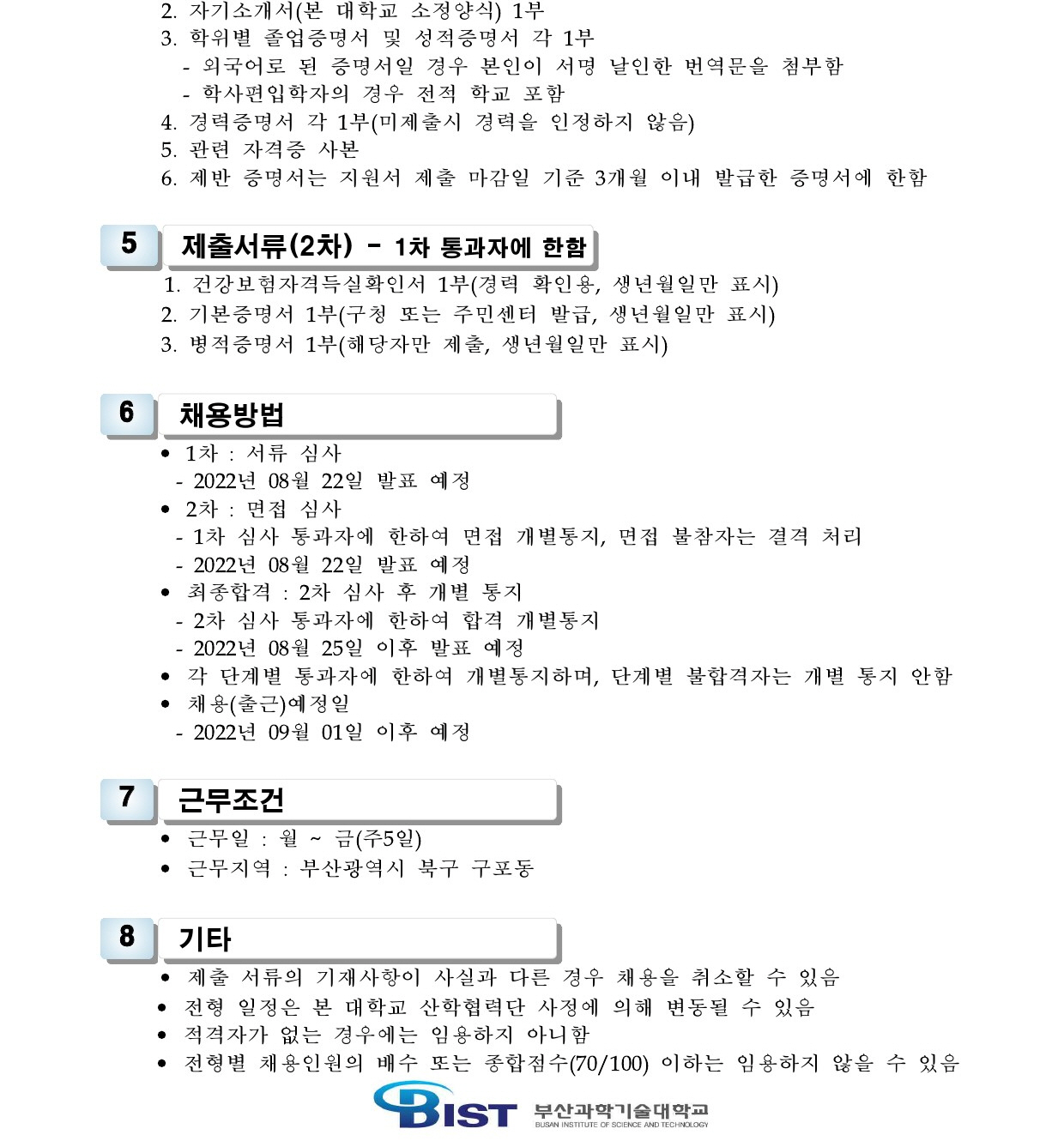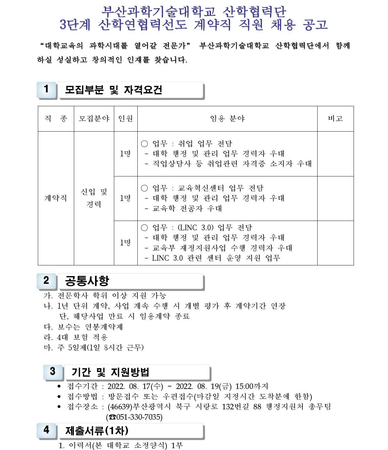 HOME > 기타 > 입찰/채용 입찰/채용 제목 [채용] 산학협력단 3단계 산학연협력선도 (LINC 3.0) 계약직 직원 채용 공고 등록일 2022.07.29 14:15:38 작성자 행정지원처 첨부파일 1-2. 공고문(계약직).pdf [181.15 KB]1-3. 지원서 및 자기소개서(계약직).hwp [21.50 KB] 조회 1884 이전글 [채용] 산학협력단 전문대학 혁신지원사업 사업전담 연구교수 채용 공고 다음글 [채용] 부산과학기술대학교 계약직 직원(사서) 채용 공고 목록 비밀글 비밀번호 입력 폼 비밀번호 입력 비밀번호를 입력하여 주세요. 관리자는 확인버튼만 누르시면 됩니다. 비밀번호 잘못된 비밀번호입니다. 비밀번호를 다시 입력해주세요. 확인