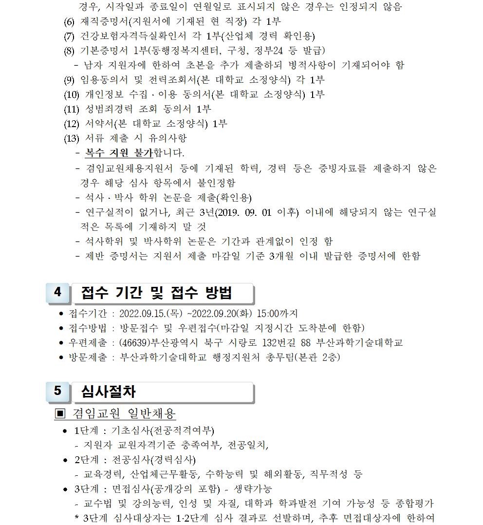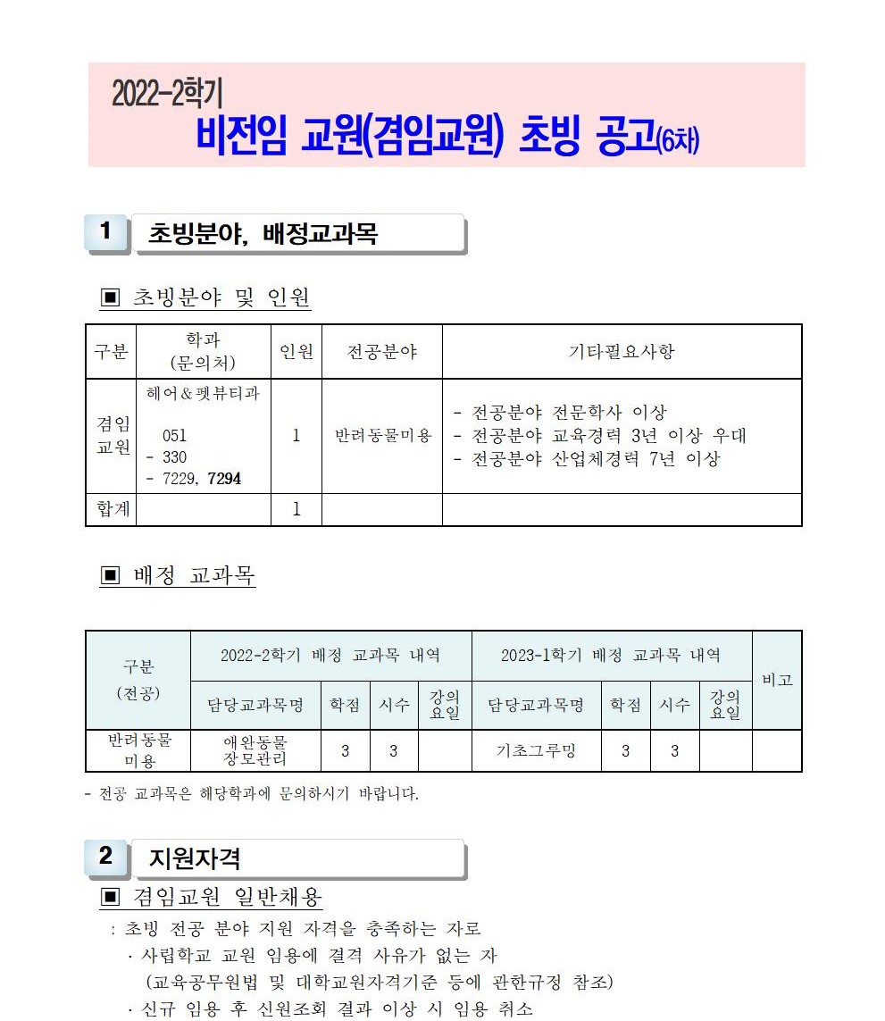 HOME > 기타 > 입찰/채용 입찰/채용 제목 [채용] 2022학년도 2학기 비전임 교원(겸임교원) 초빙 공고 (6차) 등록일 2022.09.05 11:09:48 작성자 행정지원처 첨부파일 1-1-3-가. 신규임용계획(공고문).pdf [204.17 KB]1-1-4. 겸임교원 일반채용 구비서류.zip [62.39 KB] 조회 1702 이전글 [채용] 2022학년도 2학기 교원(강사) 초빙 공고 (5차) 다음글 [입찰] LINC3.0 공유협업 플랫폼 클라우드 전환 개발 구축(협상에 의한 계약) 입찰(긴급) 재공고 목록 비밀글 비밀번호 입력 폼 비밀번호 입력 비밀번호를 입력하여 주세요. 관리자는 확인버튼만 누르시면 됩니다. 비밀번호 잘못된 비밀번호입니다. 비밀번호를 다시 입력해주세요. 확인