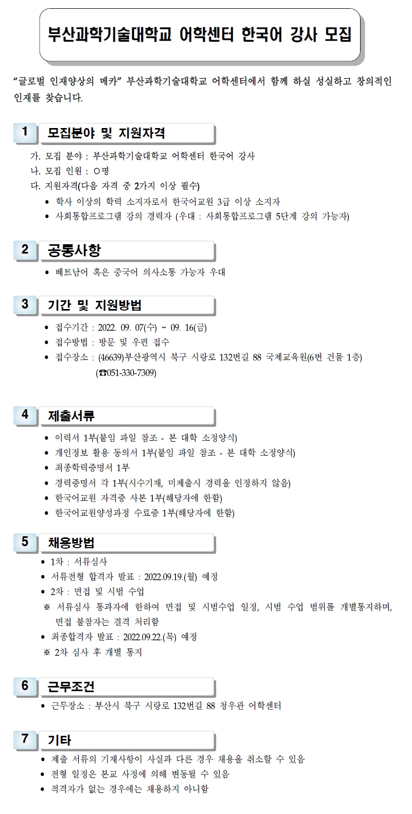 HOME > 기타 > 입찰/채용 입찰/채용 제목 [채용] 국제교육원 어학센터 한국어 강사 모집 등록일 2022.09.13 10:09:09 작성자 국제교육원 첨부파일 붙임1. 이력서(어학센터_한국어강사).hwp [17.00 KB]붙임2. 2022년 개인정보 제공 및 이용 동의서.hwp [12.50 KB] 조회 1615 이전글 [입찰] LINC3.0 공유협업 플랫폼 클라우드 전환 개발 구축(협상에 의한 계약) 입찰(긴급) 재공고 다음글 [채용] 부산과학기술대학교 계약직 직원 채용 공고 (환경미화) 목록 비밀글 비밀번호 입력 폼 비밀번호 입력 비밀번호를 입력하여 주세요. 관리자는 확인버튼만 누르시면 됩니다. 비밀번호 잘못된 비밀번호입니다. 비밀번호를 다시 입력해주세요. 확인