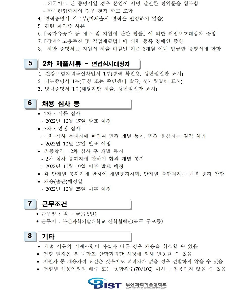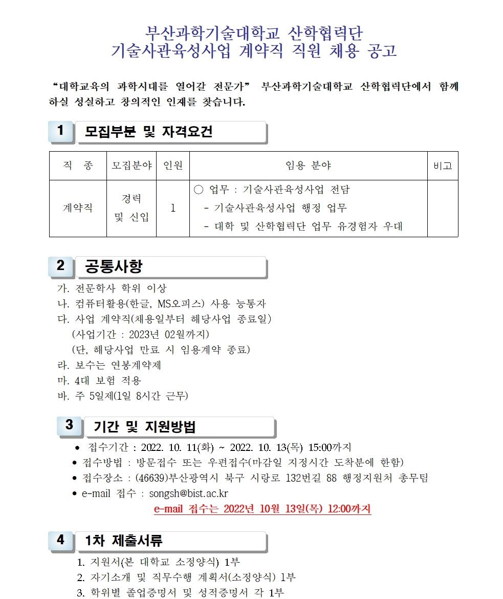 HOME > 기타 > 입찰/채용 입찰/채용 제목 [채용] 산학협력단 기술사관육성사업 전담 계약직 직원 채용 등록일 2022.09.30 08:09:27 작성자 행정지원처 첨부파일 1-2. 공고문(계약직).pdf [197.59 KB]1-3. 지원서 및 자기소개서(계약직).hwp [48.50 KB] 조회 1553 이전글 [채용] 부산과학기술대학교 계약직 직원 채용 공고 (영선) 다음글 [채용] 산학협력단 듀얼공동훈련센터(일학습병행제사업) 전담 계약직 직원 채용 목록 비밀글 비밀번호 입력 폼 비밀번호 입력 비밀번호를 입력하여 주세요. 관리자는 확인버튼만 누르시면 됩니다. 비밀번호 잘못된 비밀번호입니다. 비밀번호를 다시 입력해주세요. 확인