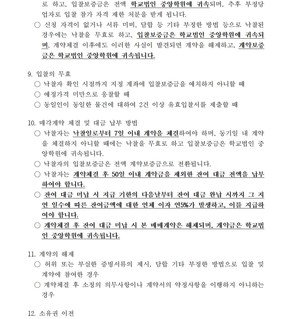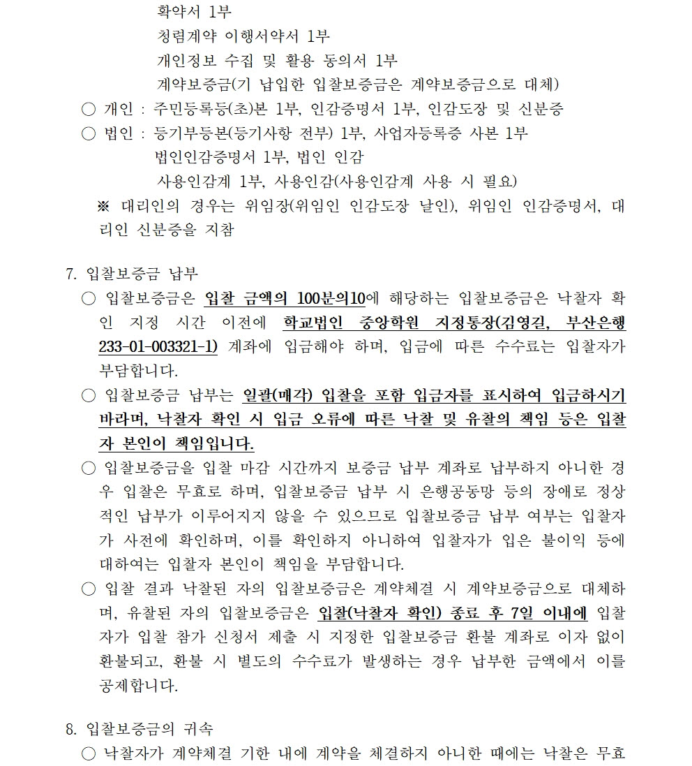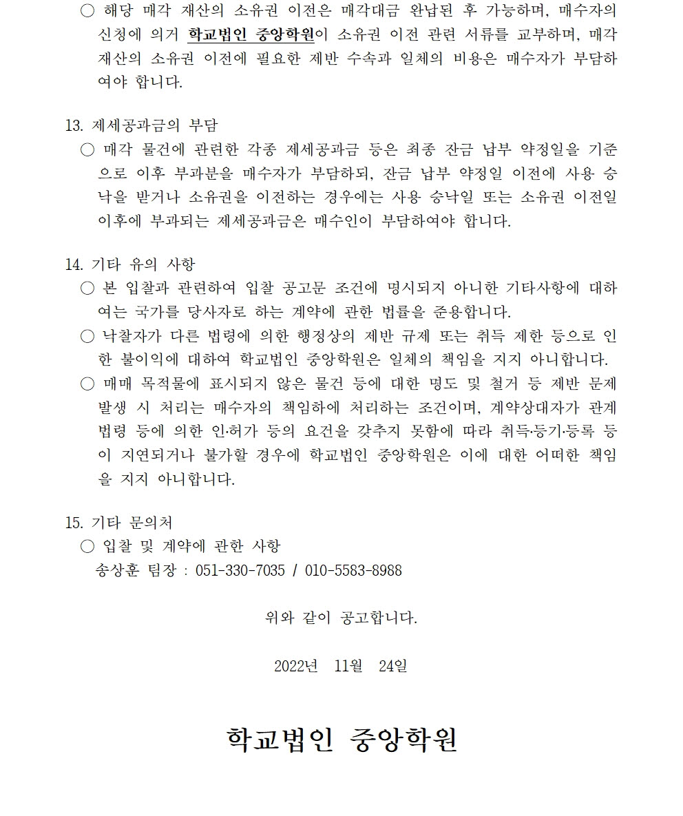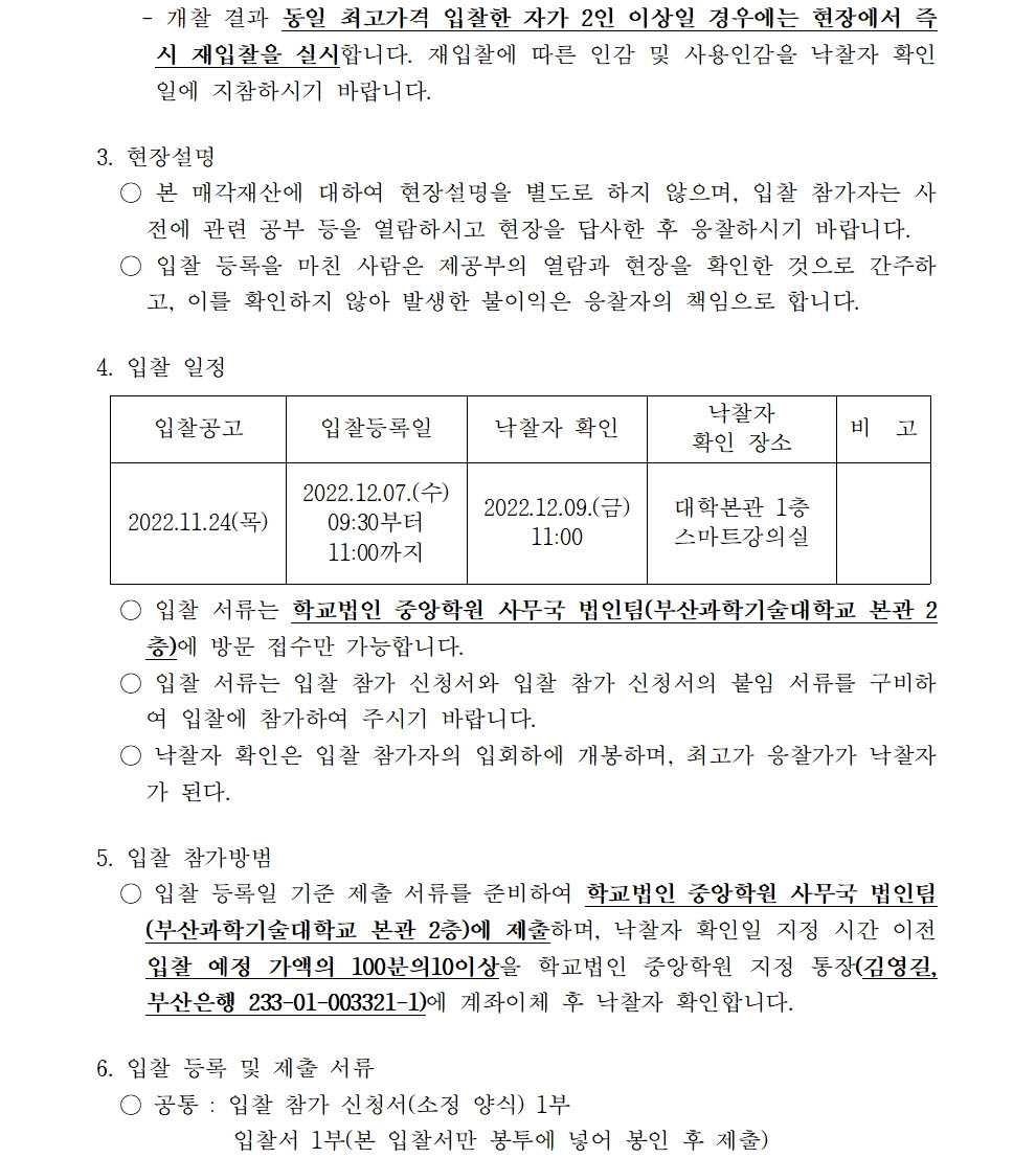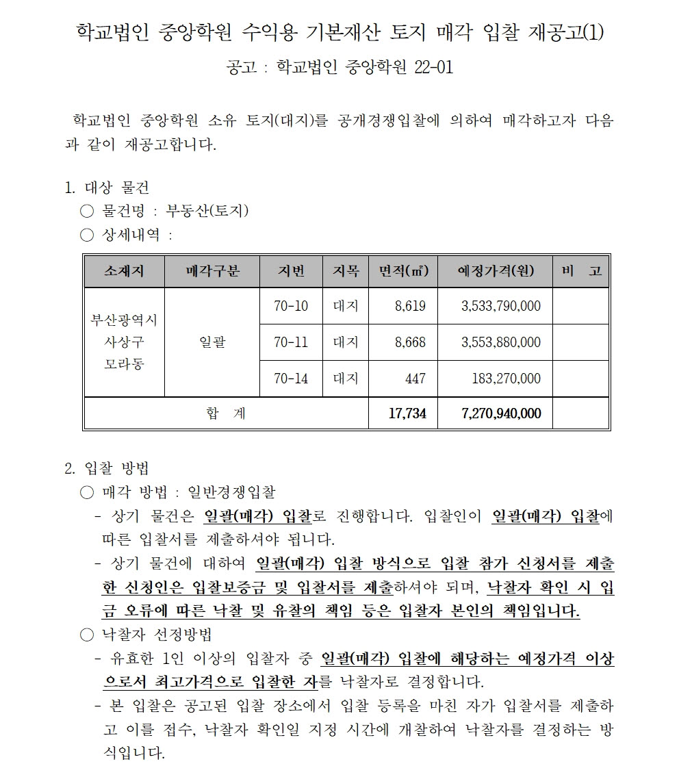 HOME > 기타 > 입찰/채용 입찰/채용 제목 [입찰] 학교법인 중앙학원 수익용 기본재산 부동산(토지) 매각 입찰 재공고(1) 등록일 2022.11.24 10:11:08 작성자 행정지원처 첨부파일 붙임9. 입찰참가 서류 양식(1차 재공고-1).zip [715.75 KB]붙임1 매각공고문(재1).pdf [70.35 KB] 조회 1632 이전글 [입찰] 부산형 스마트제조 고급인력 양성사업 기자재(컴퓨터 등) 구입 입찰(긴급) 다음글 [입찰] 부산과학기술대학교 승강기 교체 공사 입찰 목록 비밀글 비밀번호 입력 폼 비밀번호 입력 비밀번호를 입력하여 주세요. 관리자는 확인버튼만 누르시면 됩니다. 비밀번호 잘못된 비밀번호입니다. 비밀번호를 다시 입력해주세요. 확인