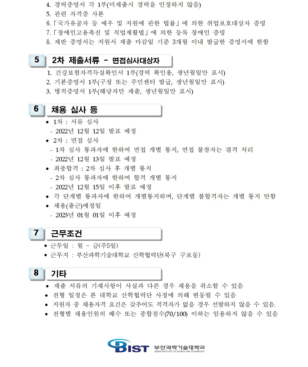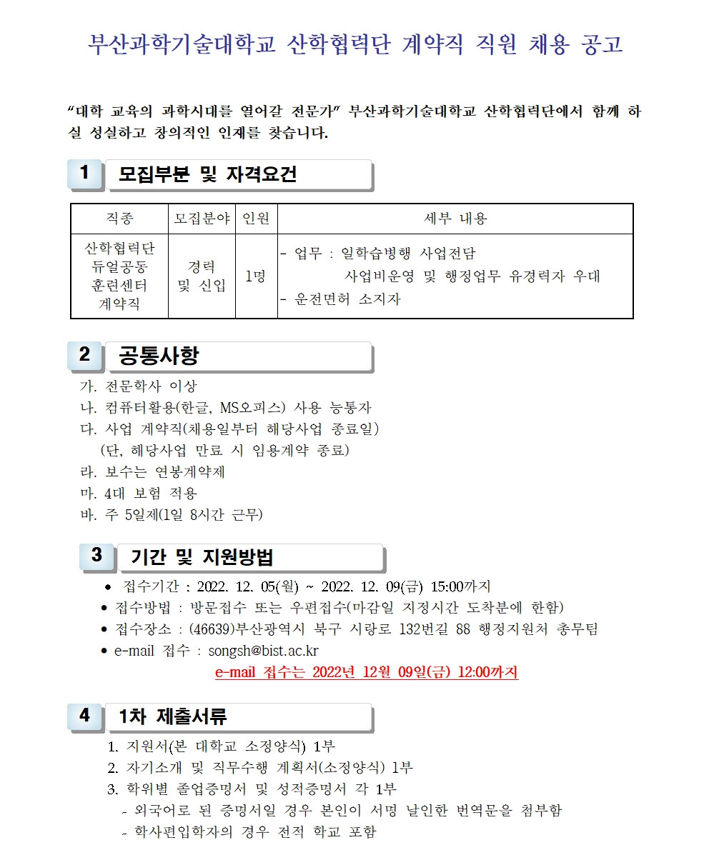 HOME > 기타 > 입찰/채용 입찰/채용 제목 [채용] 산학협력단 듀얼공동훈련센터(일학습병행제사업) 전담 계약직 직원 채용 등록일 2022.11.30 07:11:07 작성자 행정지원처 첨부파일 1-3. 지원서 및 자기소개서(산단-듀얼공동훈련센터-일학습).hwp [49.00 KB]1-2. 공고문(산단-듀얼공동훈련센터-일학습).pdf [183.32 KB] 조회 1556 이전글 [입찰] 대학혁신 성과 홍보 XR 홈페이지 제작 용역(협상에 의한 계약) 입찰(긴급) 다음글 [채용] 전임교원(정년, 비정년) 초빙 재공고(2차) 목록 비밀글 비밀번호 입력 폼 비밀번호 입력 비밀번호를 입력하여 주세요. 관리자는 확인버튼만 누르시면 됩니다. 비밀번호 잘못된 비밀번호입니다. 비밀번호를 다시 입력해주세요. 확인