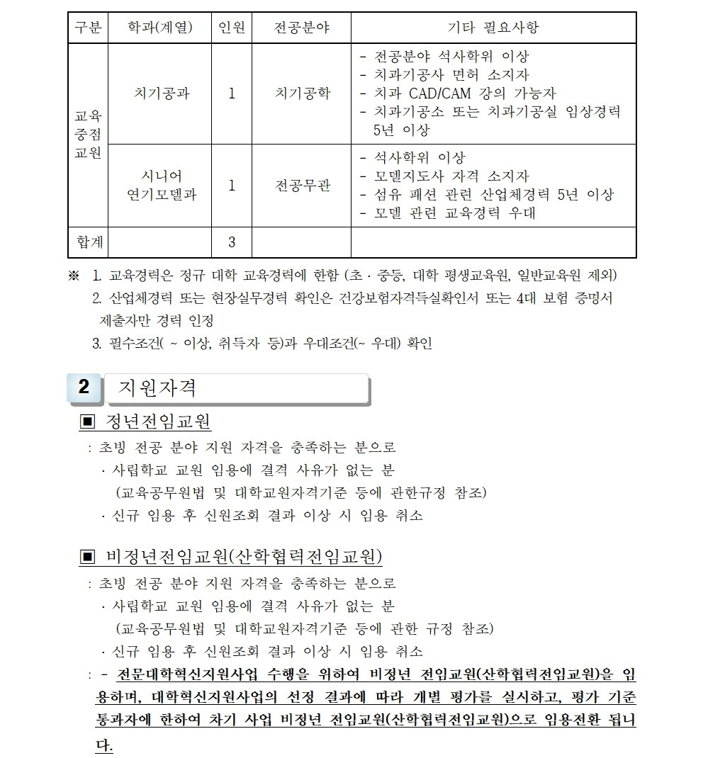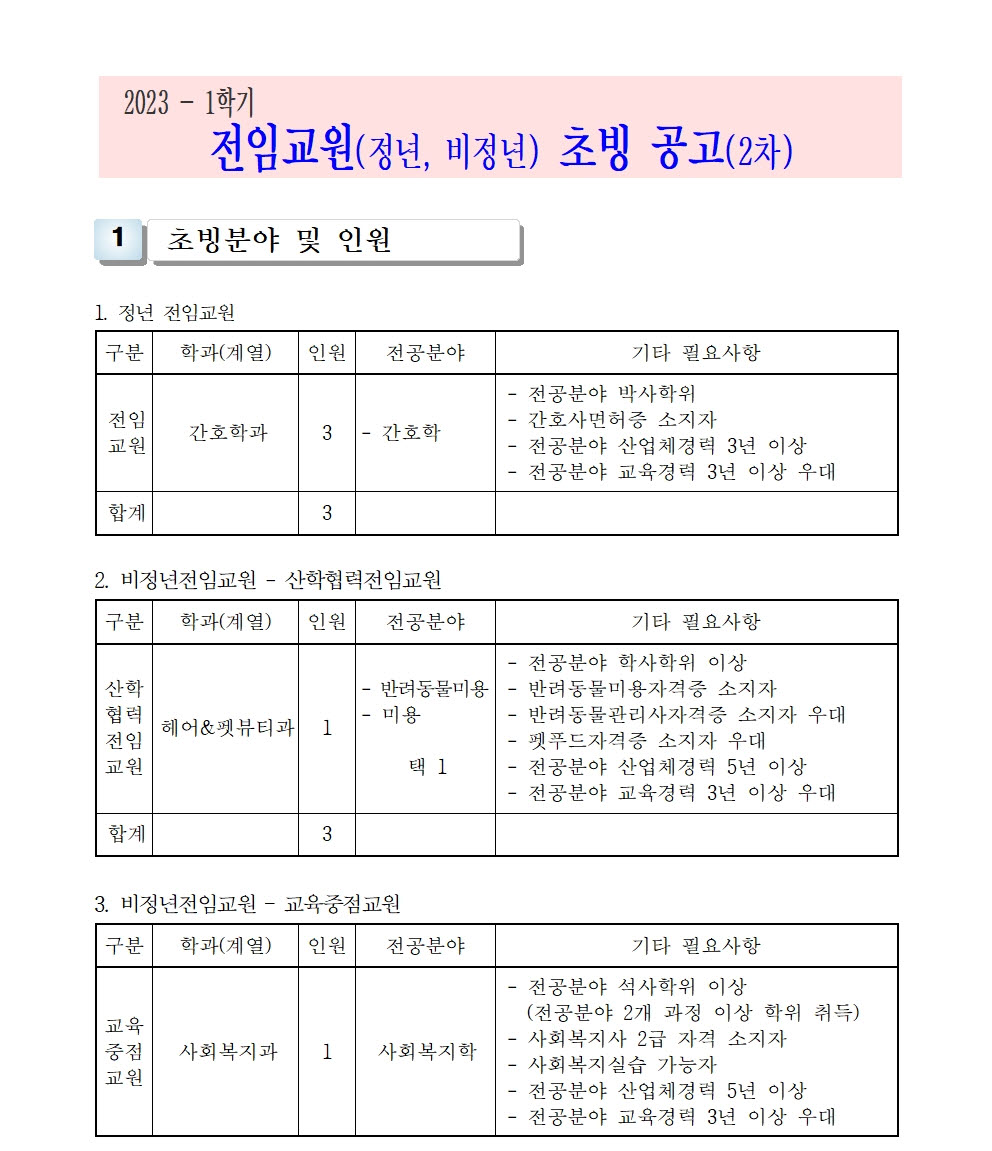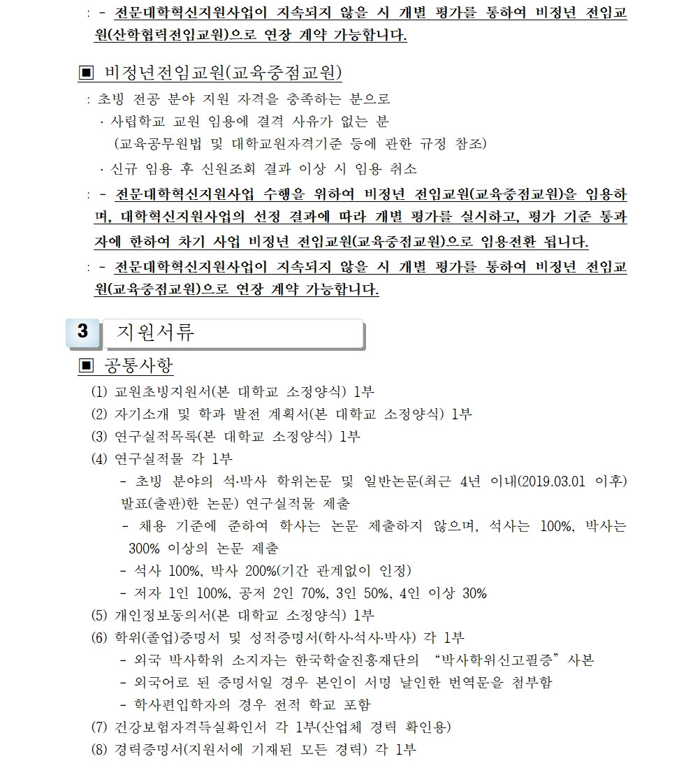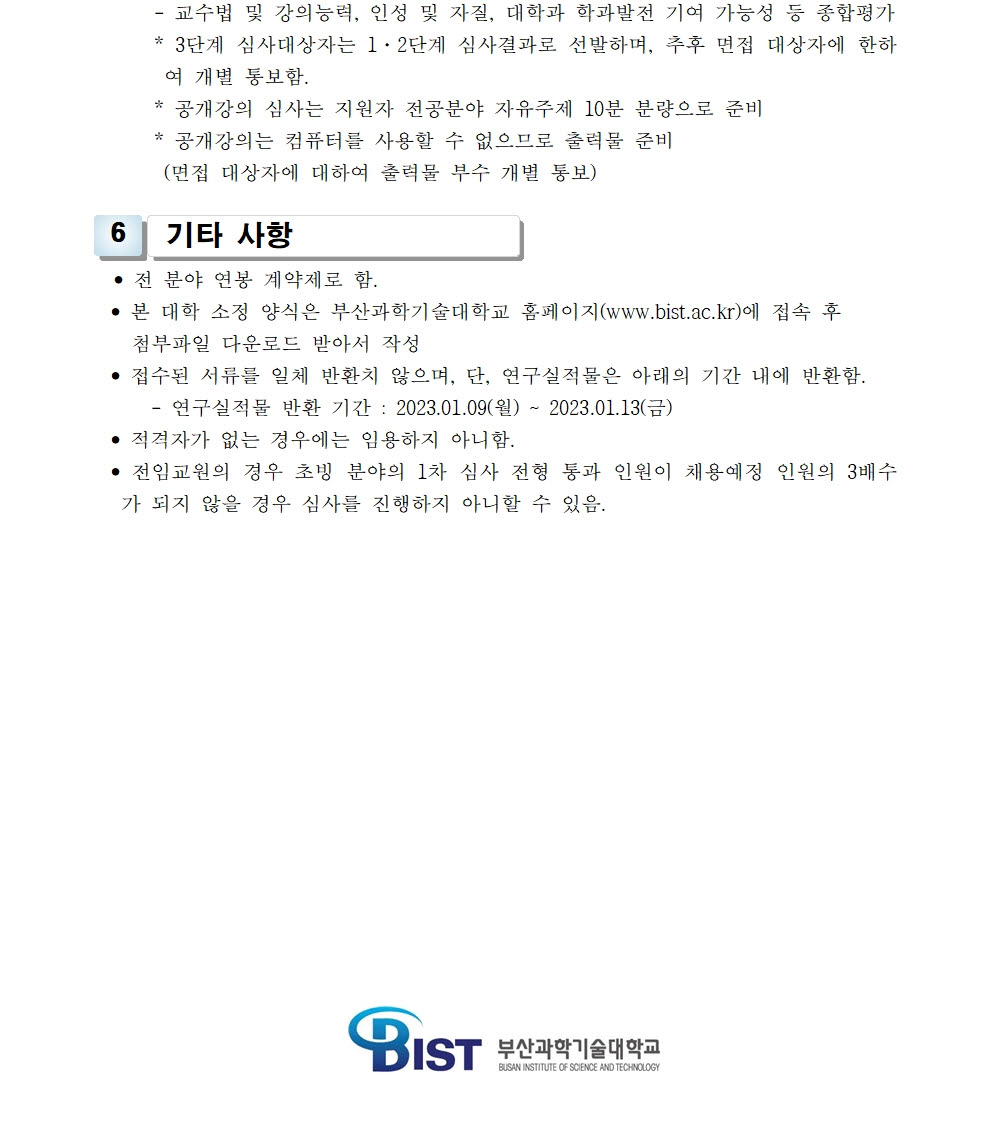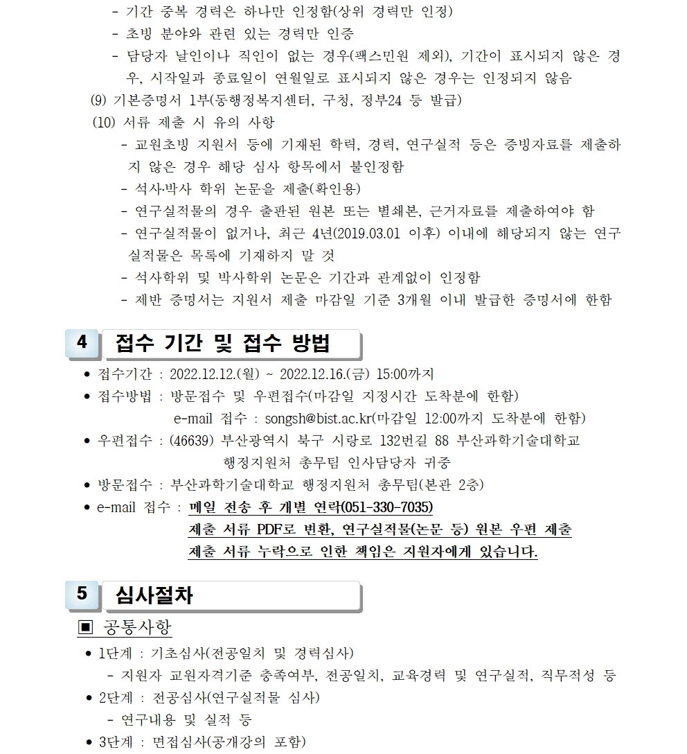 HOME > 기타 > 입찰/채용 입찰/채용 제목 [채용] 전임교원(정년, 비정년) 초빙 재공고(2차) 등록일 2022.12.01 15:12:14 작성자 행정지원처 첨부파일 1-1-3-가. 신규임용계획(공고문).pdf [175.14 KB]1-1-3-가. 내외부공고-첨부서류.zip [282.76 KB] 조회 1998 이전글 [채용] 산학협력단 듀얼공동훈련센터(일학습병행제사업) 전담 계약직 직원 채용 다음글 [입찰] 부산과학기술대학교 승강기 교체 공사 입찰(재공고)(긴급) 목록 비밀글 비밀번호 입력 폼 비밀번호 입력 비밀번호를 입력하여 주세요. 관리자는 확인버튼만 누르시면 됩니다. 비밀번호 잘못된 비밀번호입니다. 비밀번호를 다시 입력해주세요. 확인