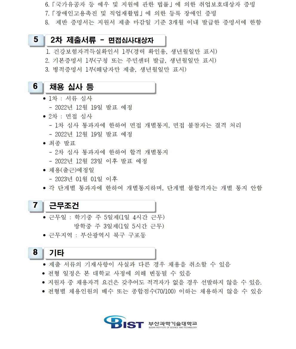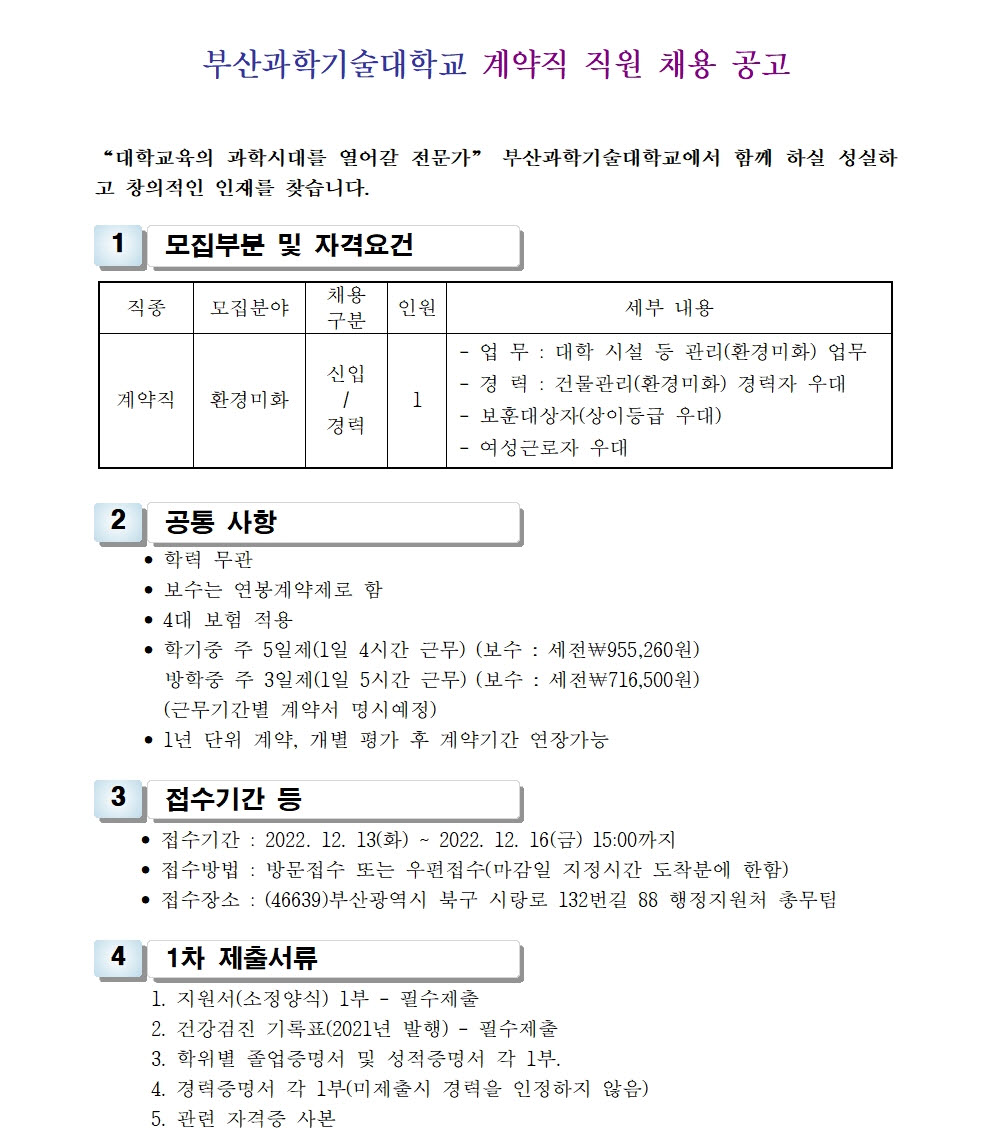 HOME > 기타 > 입찰/채용 입찰/채용 제목 [채용] 부산과학기술대학교 계약직 직원 채용 공고 (환경미화) 등록일 2022.12.08 11:12:54 작성자 행정지원처 첨부파일 조회 1863 이전글 [입찰] 학교법인 중앙학원 수익용 기본재산 부동산(토지) 매각 입찰 재공고(2) 다음글 [입찰] LINC3.0 / 조기취업형 계약학과 실습실 환경개선공사 입찰(긴급) 목록 비밀글 비밀번호 입력 폼 비밀번호 입력 비밀번호를 입력하여 주세요. 관리자는 확인버튼만 누르시면 됩니다. 비밀번호 잘못된 비밀번호입니다. 비밀번호를 다시 입력해주세요. 확인