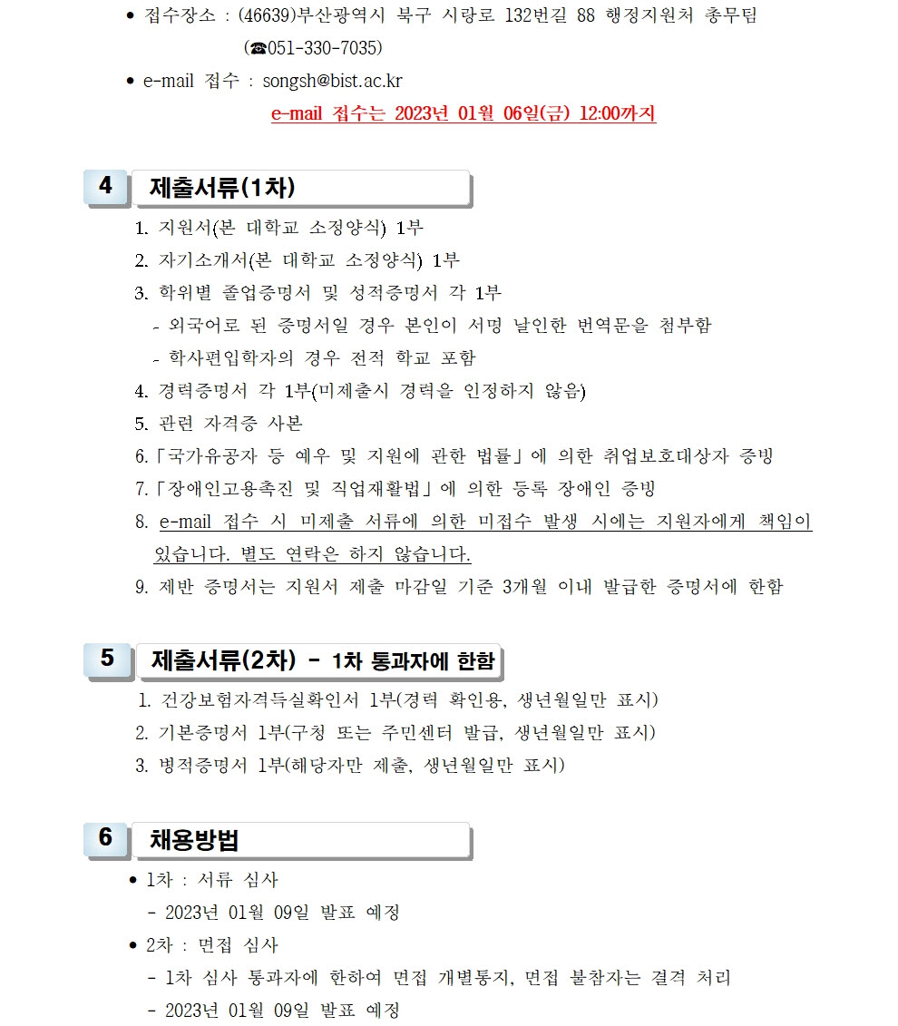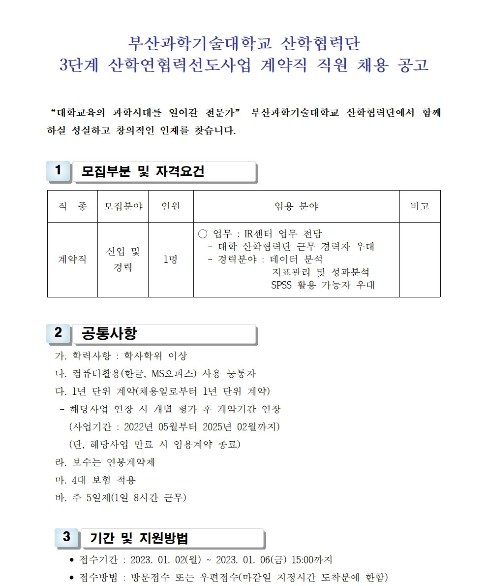 HOME > 기타 > 입찰/채용 입찰/채용 제목 [채용] 산학협력단 3단계 산학연 선도사업(IR센터) 계약직 직원 채용 공고 등록일 2022.12.23 12:12:12 작성자 행정지원처 첨부파일 1-2. 공고문(계약직).pdf [177.18 KB]1-3. 지원서 및 자기소개서(계약직).hwp [50.50 KB] 조회 1568 이전글 [채용] 산학협력단 대학혁신지원사업(학생진로심리상담센터) 계약직 직원 채용 공고 다음글 [채용] 비정년전임교원(산학협력전임) 초빙 공고 목록 비밀글 비밀번호 입력 폼 비밀번호 입력 비밀번호를 입력하여 주세요. 관리자는 확인버튼만 누르시면 됩니다. 비밀번호 잘못된 비밀번호입니다. 비밀번호를 다시 입력해주세요. 확인