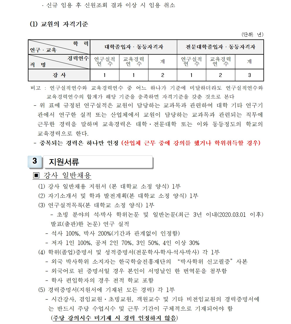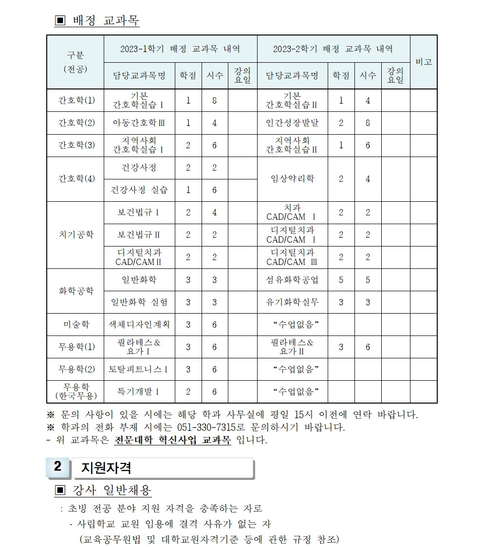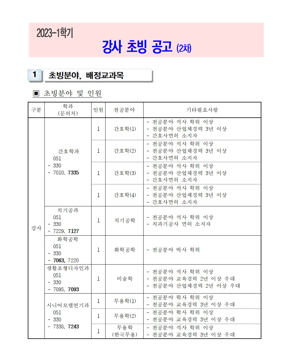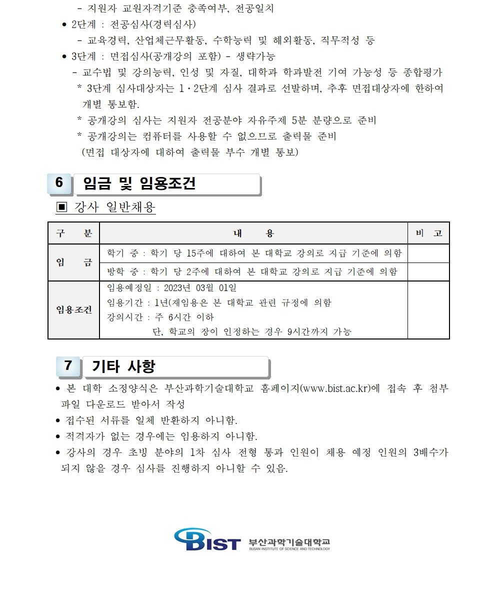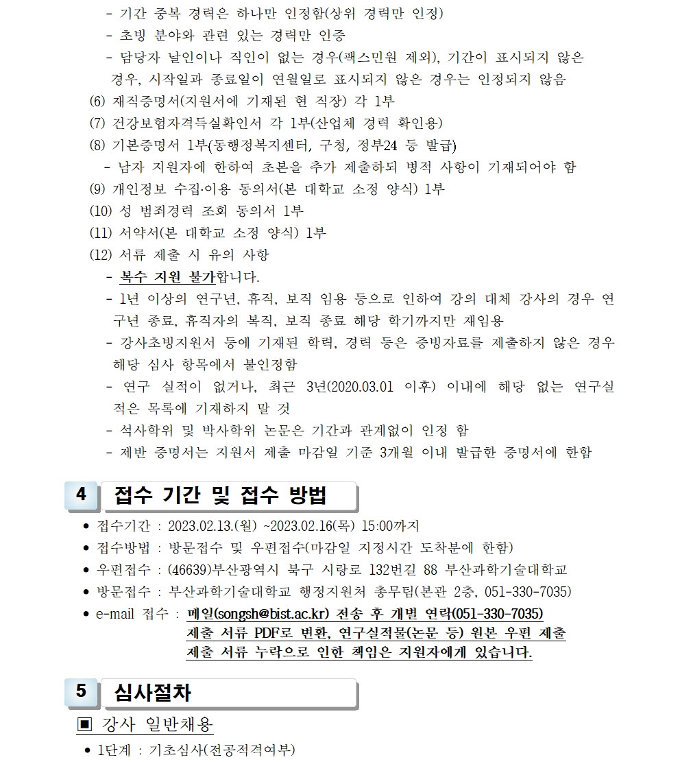 HOME > 기타 > 입찰/채용 입찰/채용 제목 [채용] 2023학년도 1학기 교원(강사) 초빙 공고 등록일 2023.02.08 08:02:16 작성자 행정지원처 첨부파일 1-1-5 강사 일반채용 구비서류(2차).zip [186.57 KB]1-1-3-가-1- 강사신규임용계획(공고문)-2차.pdf [216.88 KB] 조회 1767 이전글 [입찰] 부산과학기술대학교 학생식당 위탁운영 사업 설명회 다음글 [채용] 산학협력단 조기취업형 계약학과사업 전담 계약직 직원 채용 공고 목록 비밀글 비밀번호 입력 폼 비밀번호 입력 비밀번호를 입력하여 주세요. 관리자는 확인버튼만 누르시면 됩니다. 비밀번호 잘못된 비밀번호입니다. 비밀번호를 다시 입력해주세요. 확인