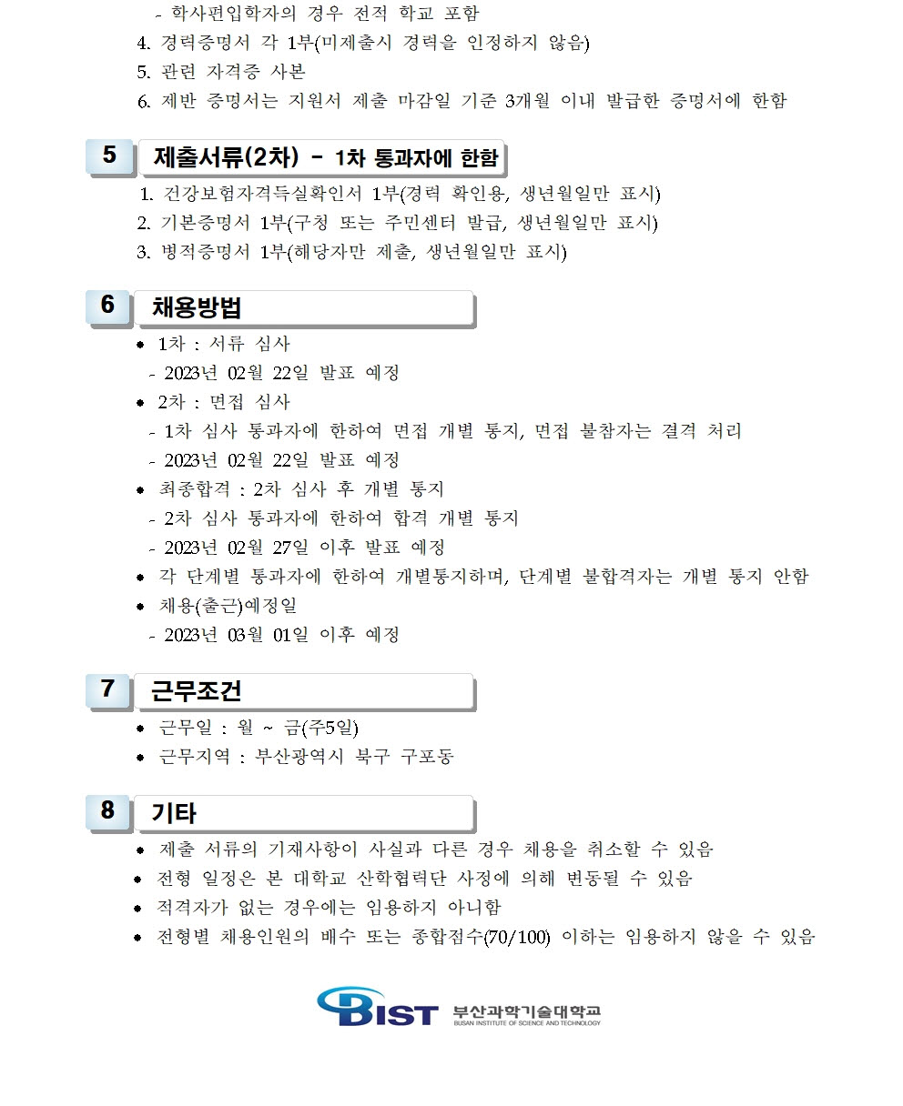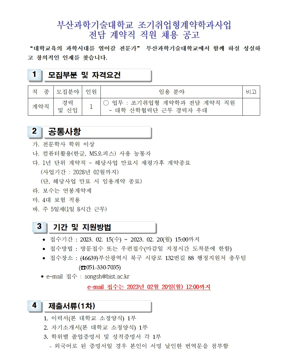 HOME > 기타 > 입찰/채용 입찰/채용 제목 [채용] 산학협력단 조기취업형 계약학과사업 전담 계약직 직원 채용 공고 등록일 2023.02.09 08:02:56 작성자 행정지원처 첨부파일 1-3. 지원서 및 자기소개서(계약직).hwp [44.50 KB]1-2. 공고문(계약직).pdf [180.65 KB] 조회 1653 이전글 [채용] 2023학년도 1학기 교원(강사) 초빙 공고 다음글 [입찰] 2023학년도 대학 통학버스 운행(협상에 의한 계약) 용역업체 선정 입찰(긴급) 목록 비밀글 비밀번호 입력 폼 비밀번호 입력 비밀번호를 입력하여 주세요. 관리자는 확인버튼만 누르시면 됩니다. 비밀번호 잘못된 비밀번호입니다. 비밀번호를 다시 입력해주세요. 확인