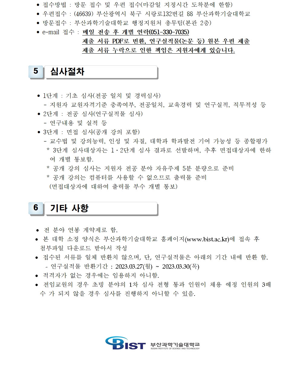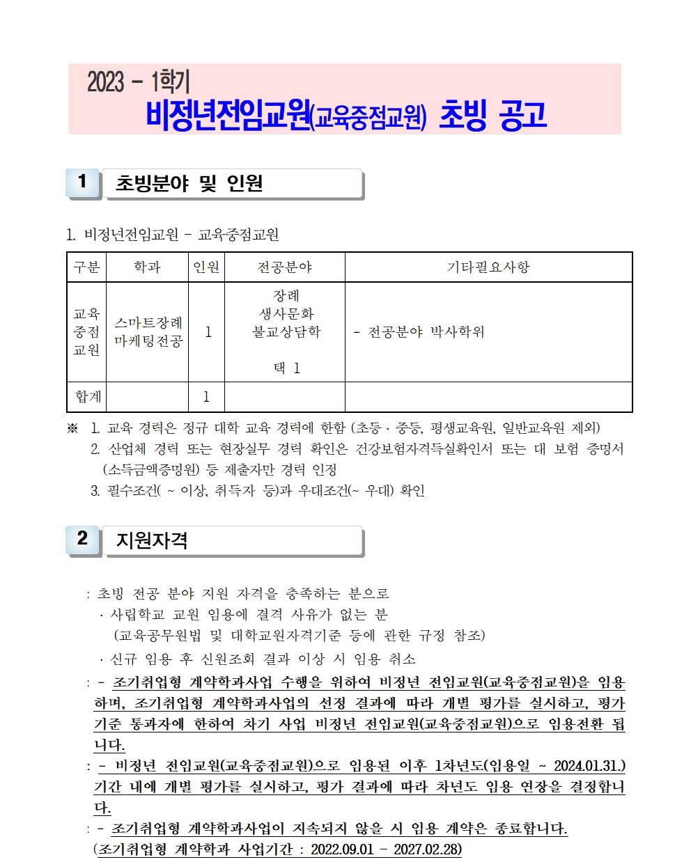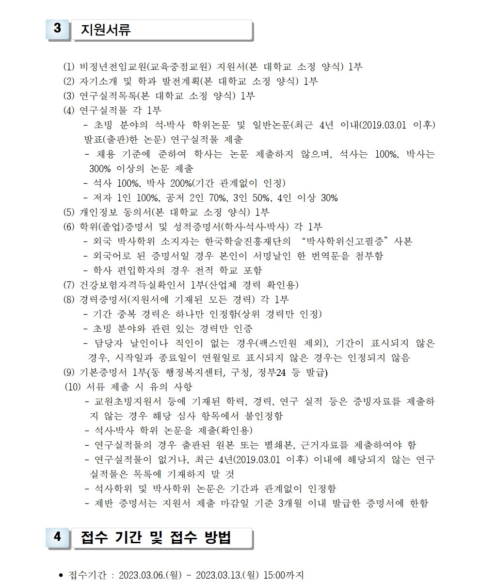 HOME > 기타 > 입찰/채용 입찰/채용 제목 [채용] 비정년전임교원(교육중점교원) 초빙 공고 등록일 2023.02.24 09:02:05 작성자 행정지원처 첨부파일 1-1-3-가. 신규임용계획(공고문).pdf [169.84 KB]1-1-3-가. 비정년전임교원(교육중점-조기취업형)-첨부서류.zip [122.14 KB] 조회 4629 이전글 [입찰] 정보시스템 통합 유지보수 운영 입찰(긴급) 다음글 [채용] 산학협력단 3단계 산학연협력선도 (LINC 3.0) 계약직 직원 채용 추가 공고 목록 비밀글 비밀번호 입력 폼 비밀번호 입력 비밀번호를 입력하여 주세요. 관리자는 확인버튼만 누르시면 됩니다. 비밀번호 잘못된 비밀번호입니다. 비밀번호를 다시 입력해주세요. 확인