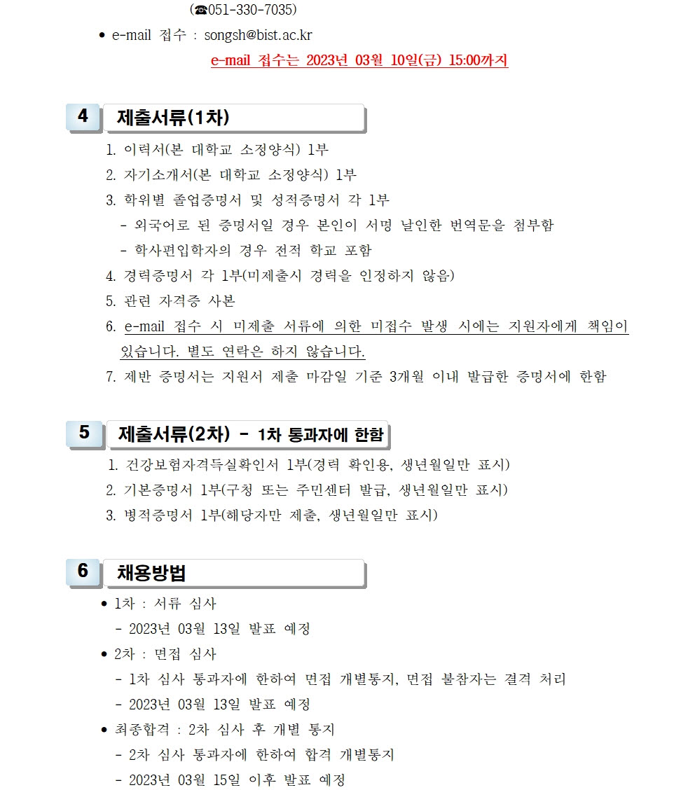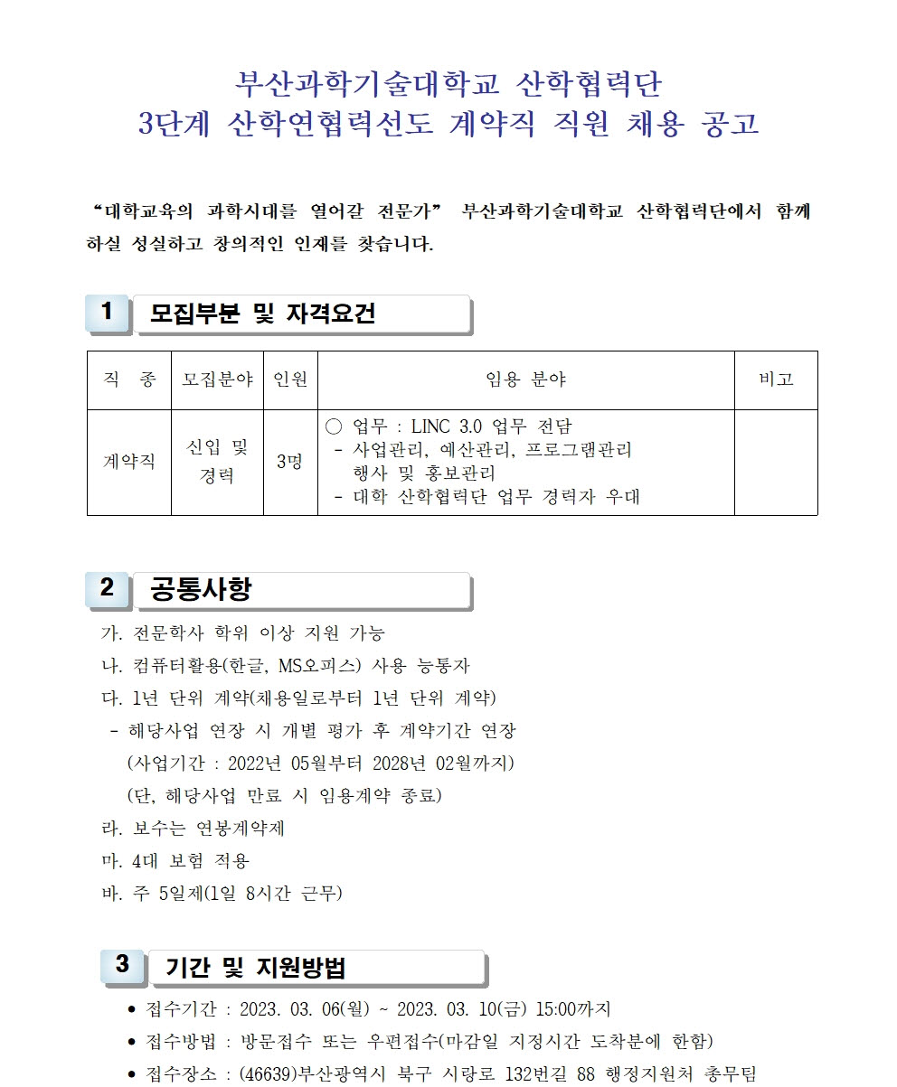 HOME > 기타 > 입찰/채용 입찰/채용 제목 [채용] 산학협력단 3단계 산학연협력선도 (LINC 3.0) 계약직 직원 채용 추가 공고 등록일 2023.02.27 14:02:06 작성자 행정지원처 첨부파일 1-3. 지원서 및 자기소개서(계약직).hwp [86.50 KB]1-2. 공고문(계약직)-연장.pdf [171.95 KB] 조회 1644 이전글 [채용] 비정년전임교원(교육중점교원) 초빙 공고 다음글 [채용] 2023학년도 1학기 교원(강사) 초빙 공고(3차) 목록 비밀글 비밀번호 입력 폼 비밀번호 입력 비밀번호를 입력하여 주세요. 관리자는 확인버튼만 누르시면 됩니다. 비밀번호 잘못된 비밀번호입니다. 비밀번호를 다시 입력해주세요. 확인