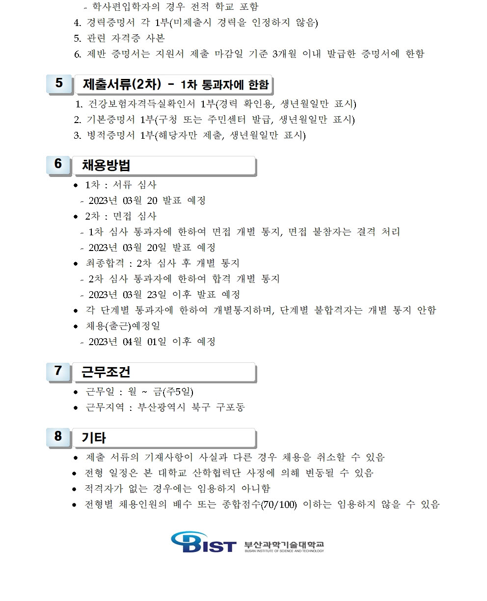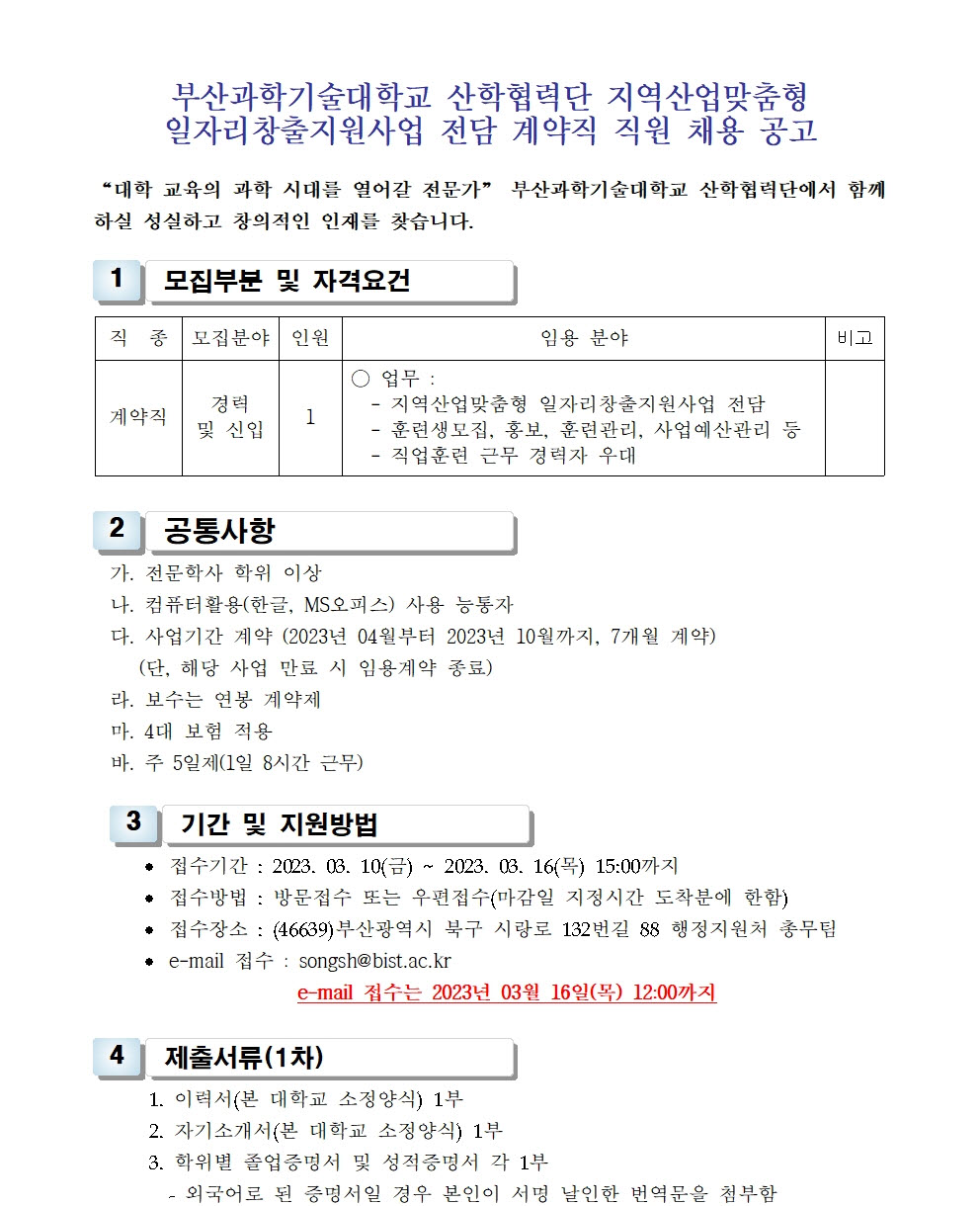 HOME > 기타 > 입찰/채용 입찰/채용 제목 [채용] 산학협력단 지역맞춤형 일자리창출지원사업 계약직 직원 채용 공고 등록일 2023.03.03 14:03:49 작성자 행정지원처 첨부파일 1-2. 공고문(계약직).pdf [178.21 KB]1-3. 지원서 및 자기소개서(계약직).hwp [47.50 KB] 조회 1781 이전글 [입찰] 학교법인 중앙학원 수익용 기본재산 부동산(토지) 매각 입찰 재공고(3) 다음글 [입찰] 부산과학기술대학교 입시홍보물 제작 용역(협상에 의한 계약) 입찰(긴급) 목록 비밀글 비밀번호 입력 폼 비밀번호 입력 비밀번호를 입력하여 주세요. 관리자는 확인버튼만 누르시면 됩니다. 비밀번호 잘못된 비밀번호입니다. 비밀번호를 다시 입력해주세요. 확인