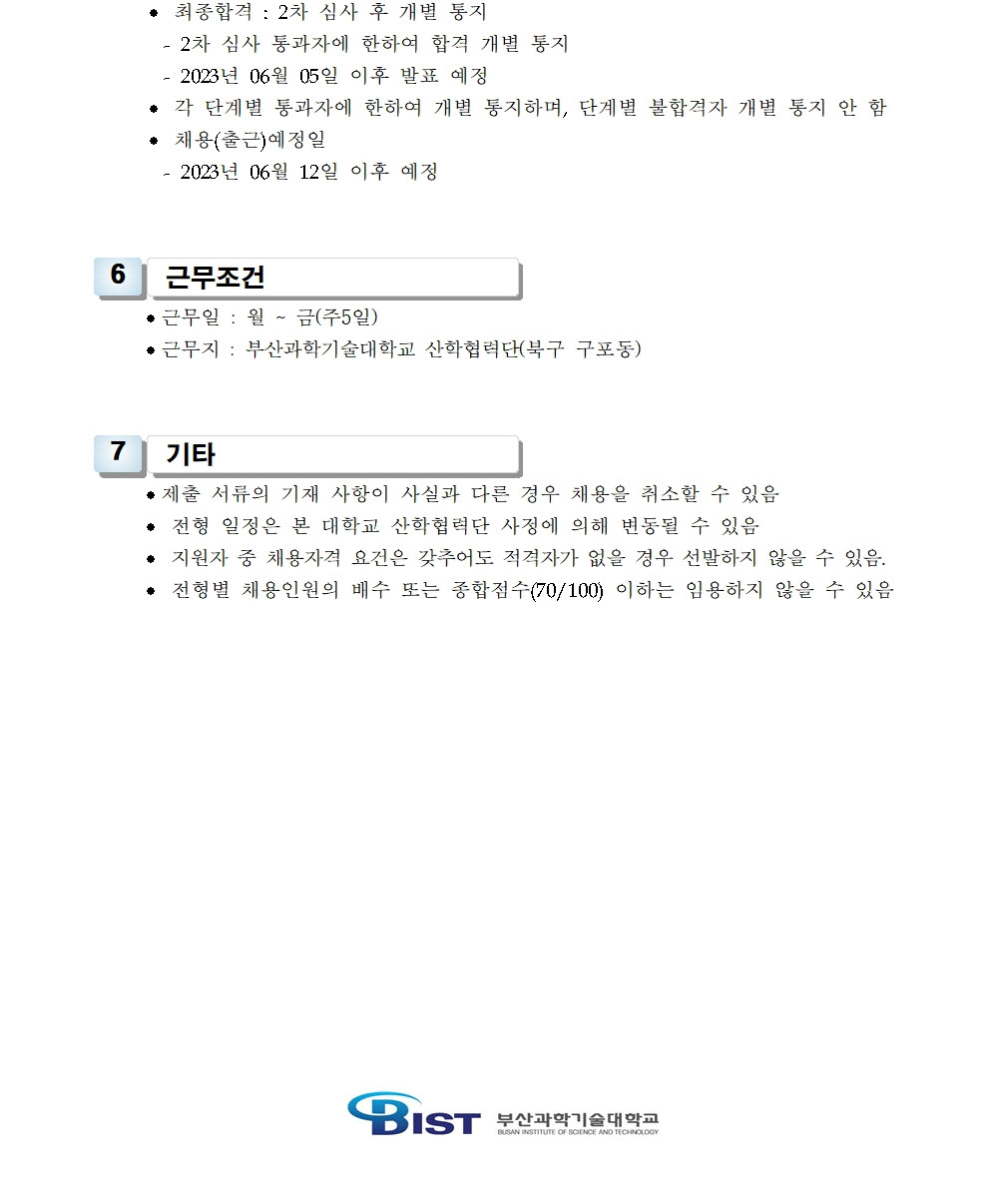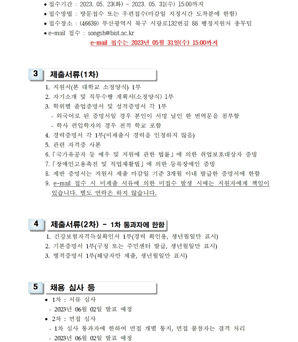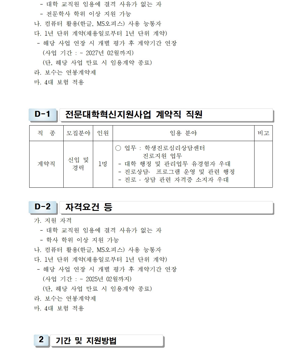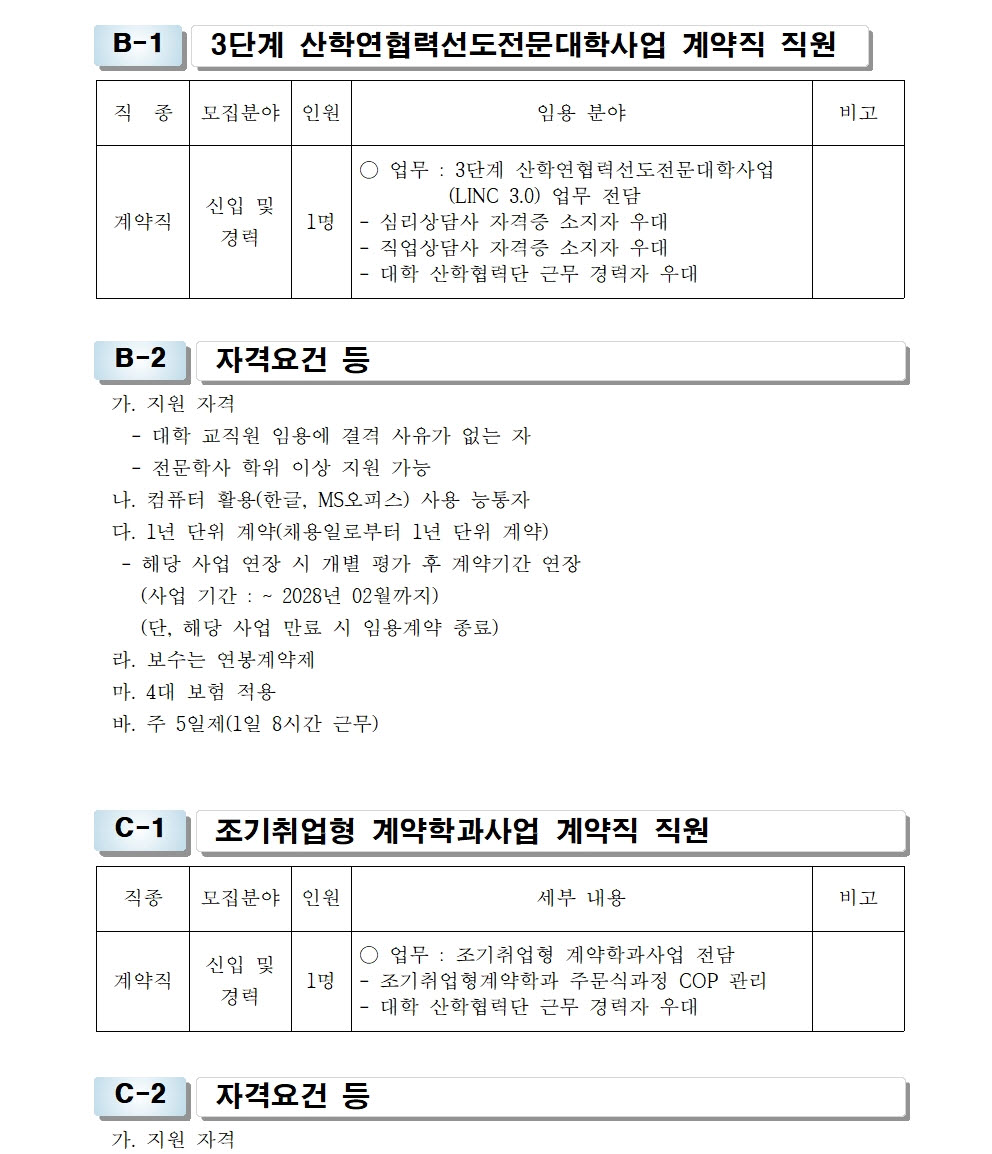 HOME > 기타 > 입찰/채용 입찰/채용 제목 [채용] 산학협력단(산학연협력선도전문대학사업, 조기취업형계약학과, 전문대학혁신지원사업) 연구원 및 계약직 직원 채용 공고 등록일 2023.05.18 08:05:18 작성자 행정지원처 첨부파일 1-2. 공고문(연구원 및 전담).pdf [305.73 KB]1-3. 지원서 및 자기소개서(계약직).hwp [140.50 KB] 조회 1679 이전글 [채용] 국제교육원 어학센터 한국어 강사 모집 다음글 [채용] 정년 전임교원 초빙 공고 목록 비밀글 비밀번호 입력 폼 비밀번호 입력 비밀번호를 입력하여 주세요. 관리자는 확인버튼만 누르시면 됩니다. 비밀번호 잘못된 비밀번호입니다. 비밀번호를 다시 입력해주세요. 확인